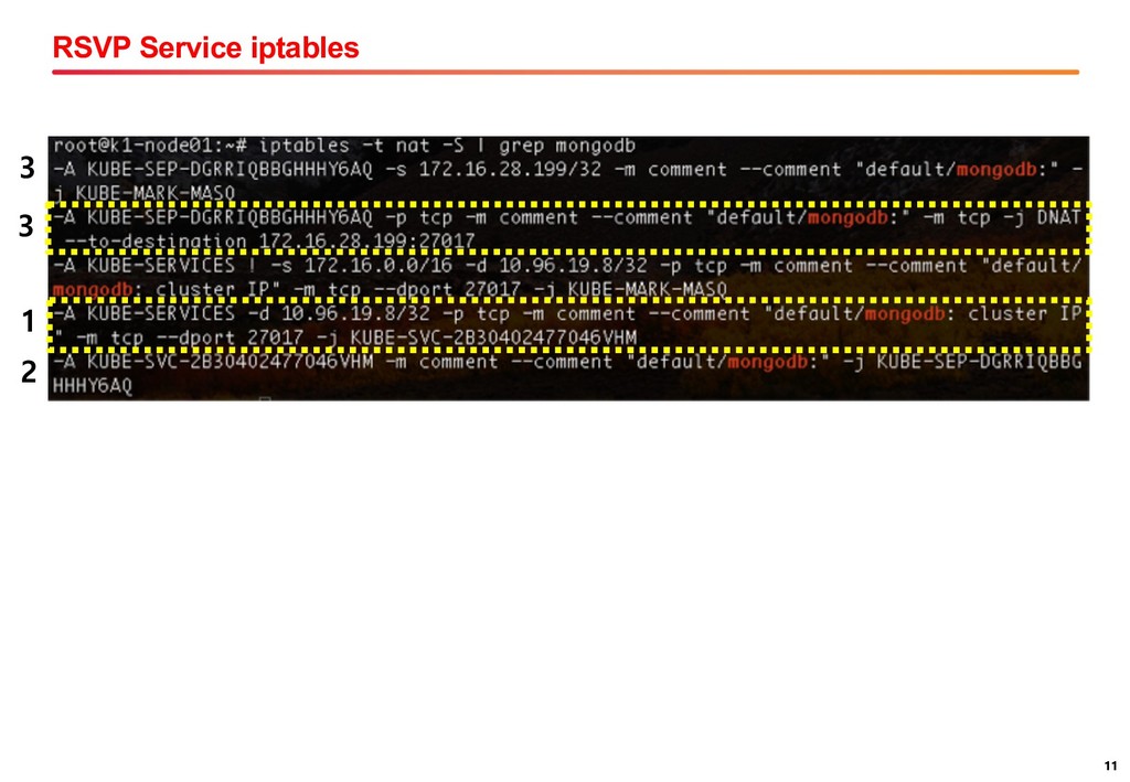 27017 Node : k1-node03 RSVP Web IP : 172.16.92.131 Port : 80 Node : k1-node04 Service Name : rsvp IP : 10.96.164.195 Port : 80 NodePort: 31200 Service Name : mongodb IP : 10.96.19.8 Port : 27017 31200 31200
