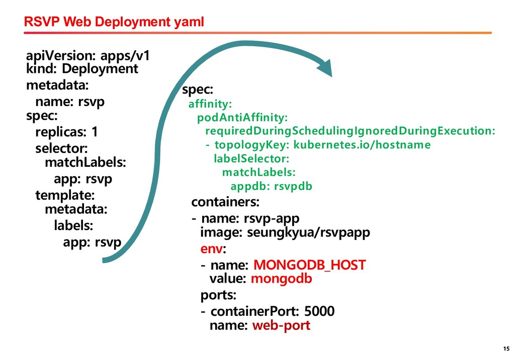 metadata: name: mongodb labels: app: rsvpdb spec: ports: - port: 27017 targetPort: 27017 protocol: TCP selector: appdb: rsvpdb DB와 연결 DB Port 서곧디 (서비스 이름이 곧 디엔에스) Service Port