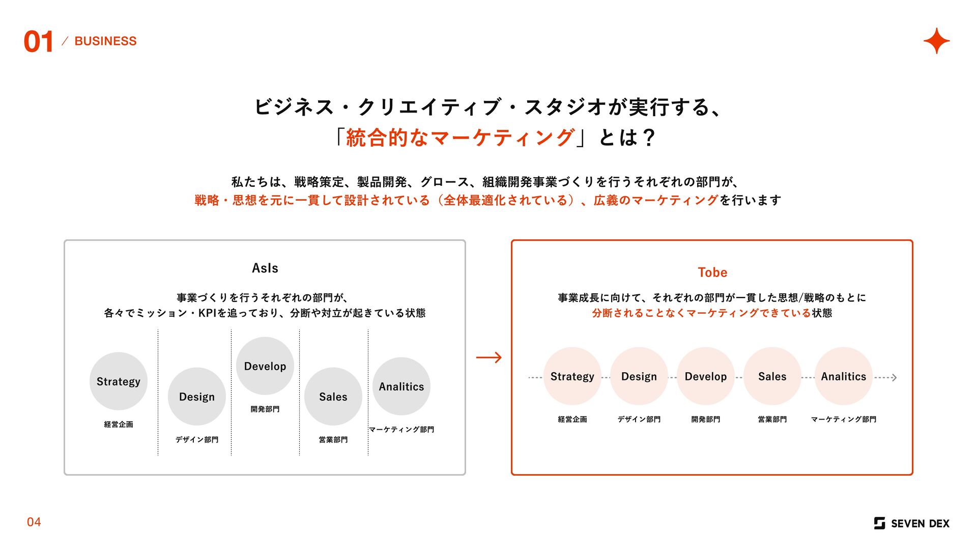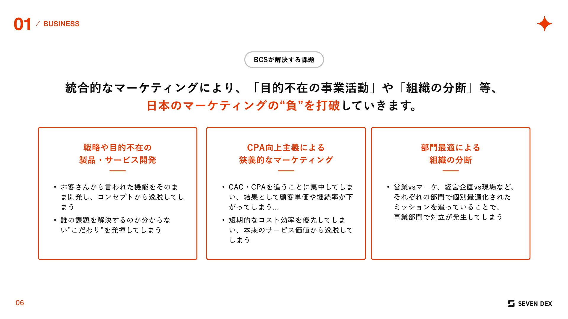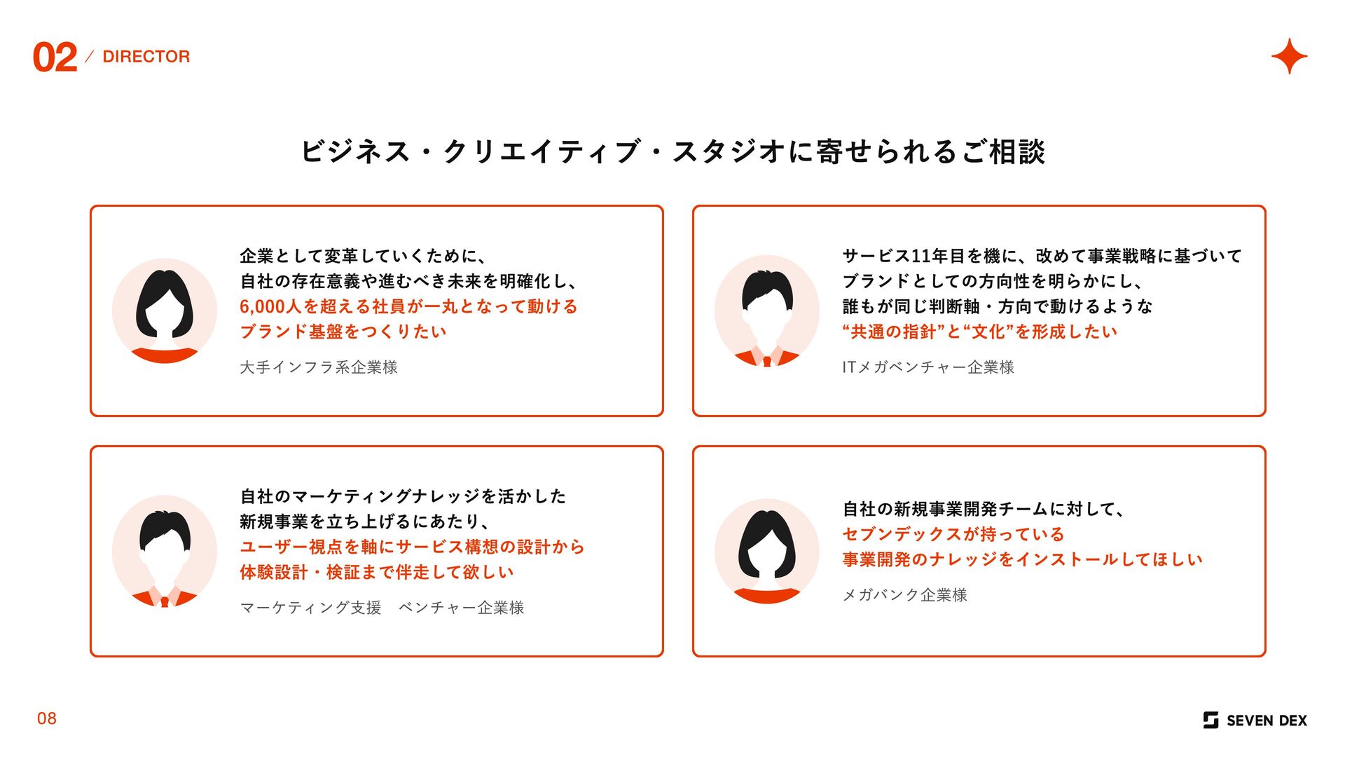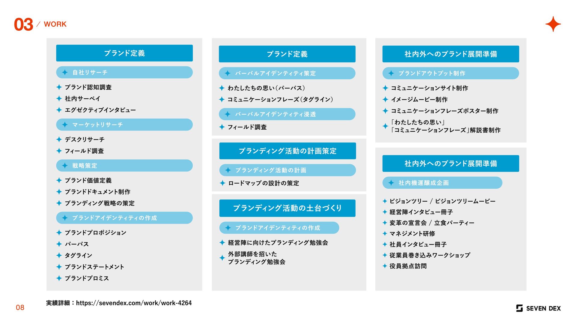 ブランドとは A.ステークホルダーと企業が共通して持つ認識 また、ステークホルダーに期待を促し、それに応えるもの その最終目的は にある 「ステークホルダーにファンになってもらうこと」 消費基準の変化 今、企業にブランディングが求められる理由 @SEVEN DEX,Inc | 27 消費基準の変化|モノ消費からコト消費への変化 生活がある程度豊かになり、モノが充足すると、生活者は精神的な充足感にウェイトを置くようになり、社会への貢献や自己実現を重要視する傾向に なっている。 単純な機能の選定行為だけでなく、「共感」による選定行為が増えている 自己実現の選定基準 「なりたい自分」 「あるべき姿」の達成を重視 顧客志向の選定基準 顧客の要求や欲求を 満たしていることを重視 価値主導の選定基準 「社会貢献できるか」 「社会をより良くできるか」を重視 製品志向の選定基準 製品の質が重視される モノ消費の選定基準 コト消費の選定基準 ブランディングの推進イメージ 企業ブランディングの原則 @SEVEN DEX,Inc | 42 ブランドの 拠りどころとなる 中核概念 目に見える形に具体化 具体的事実の集約 ブランディング活動は、環境の具体的な事実を踏まえながら、中核概念に凝縮し、 それを再び、誰の目にも見えるように具体化させていく作業である ブランディングの原則(図解) 企業ブランディングの原則 @SEVEN DEX,Inc | 43 7 効果測定と 新たな サイクルへ 6 ワンボイス の社内浸透 と 社外コミュ ニケーショ ン 5 ブランド コアを 体現する仕組み 4 ブランドの 拠りどころ となる 中核概念 1 ブランドオーナー の意志 2 ステークホルダー インサイト 3 競合との差別化 ブランド構築の原則と流れ ブランドコアとパーパス、企業理念 企業ブランディングの原則 @SEVEN DEX,Inc | 41 思想そのものと、目に見えてアクセスできるものは異なる 志、思想そのもの Brand Core 可視化 共有するために可視化された クリエイティブ パーパス 企業理念 明確な思想があり、それを共通化するために作られたツールがパーパスや企業理念 4つの成果 ブランディングを行うことで得られる成果 @SEVEN DEX,Inc | 60 01. 目指す姿が明確になることで、組織全体の行動が活性化する 人は、 「挑戦しよう」 の言葉だけで実際に挑戦することは難しい。 「どこを目指すべきか」 、 「どのレベルまで行くべきか」 目指す旗が見えてくることで、 具体的な行動が見えてくる。 それが組織全体の活性化につながる。 ? ? ? ? ブランディング勉強会 •パーパス・タグライン・ブランド価値の図解 マーケットリサーチ サーベイ フィールド調査 エグゼクティブインタビュー