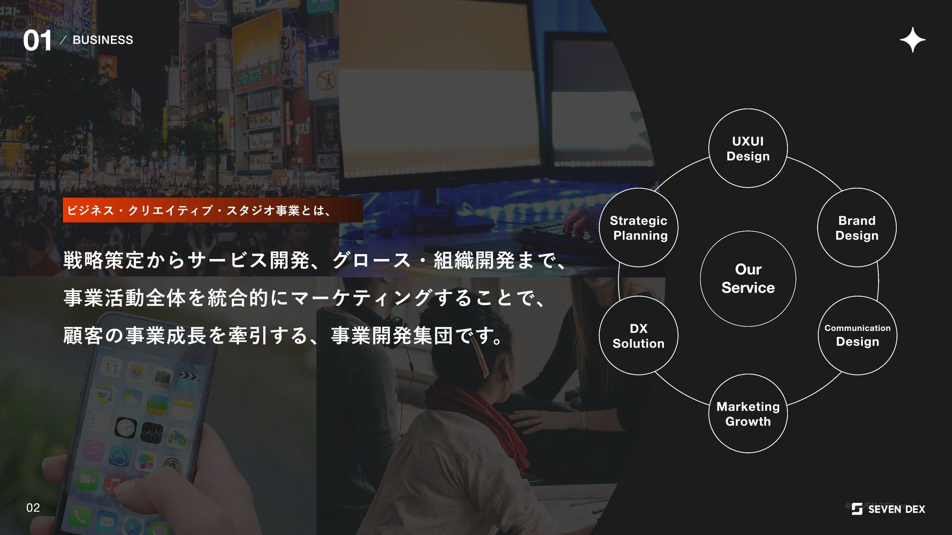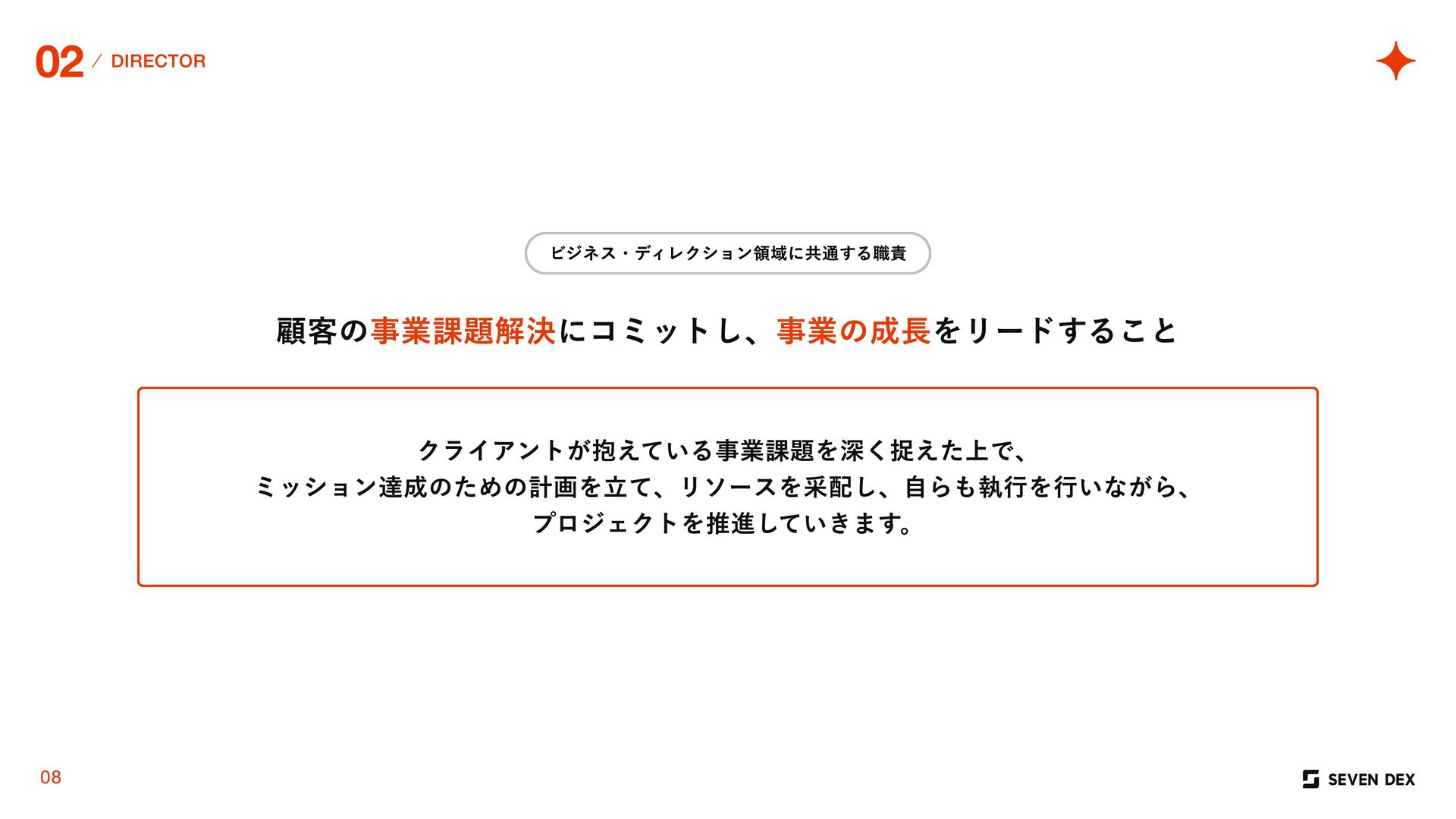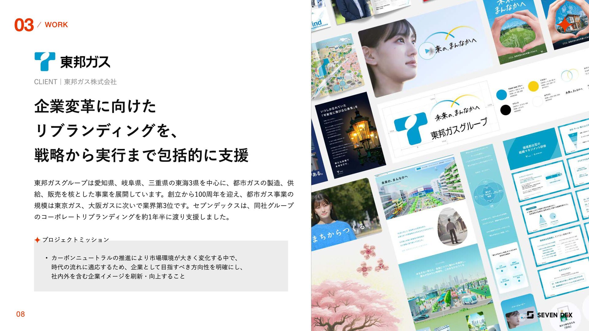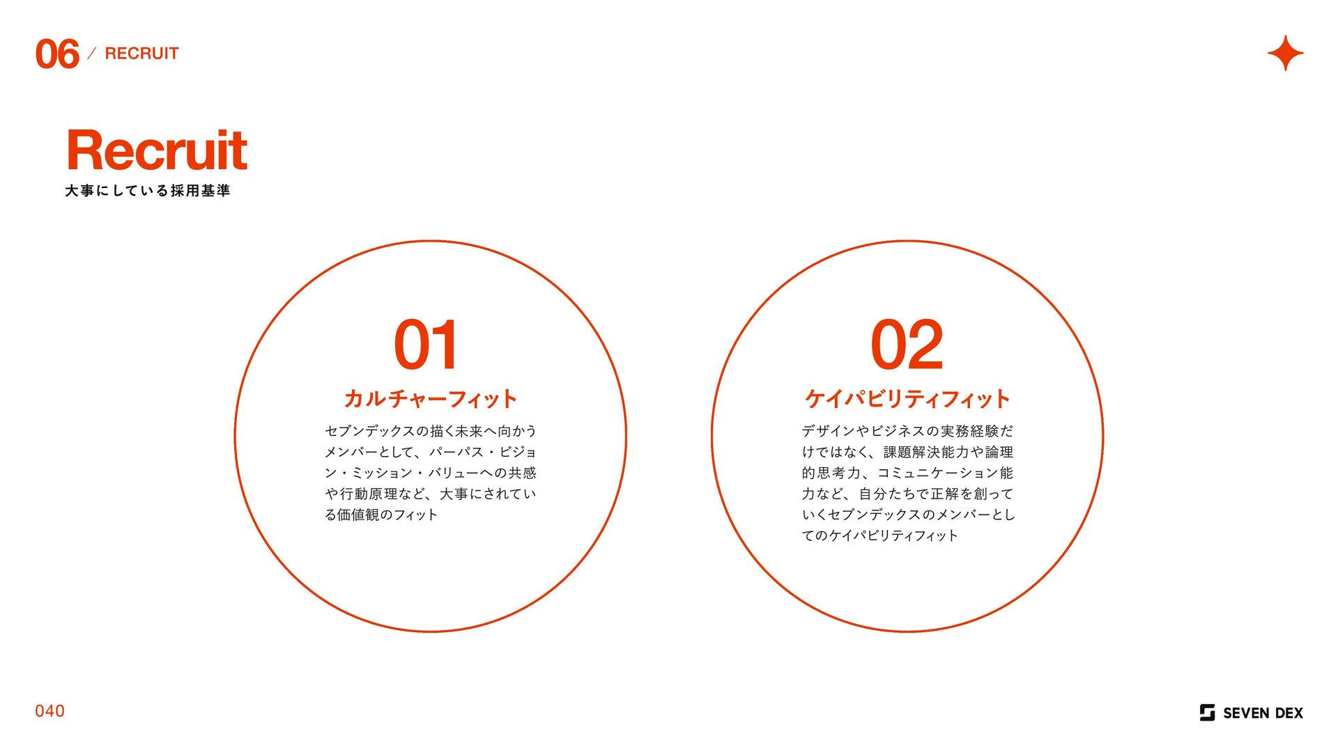 ブランドとは A.ステークホルダーと企業が共通して持つ認識 また、ステークホルダーに期待を促し、それに応えるもの その最終目的は にある 「ステークホルダーにファンになってもらうこと」 消費基準の変化 今、企業にブランディングが求められる理由 @SEVEN DEX,Inc | 27 消費基準の変化|モノ消費からコト消費への変化 生活がある程度豊かになり、モノが充足すると、生活者は精神的な充足感にウェイトを置くようになり、社会への貢献や自己実現を重要視する傾向に なっている。 単純な機能の選定行為だけでなく、「共感」による選定行為が増えている 自己実現の選定基準 「なりたい自分」 「あるべき姿」の達成を重視 顧客志向の選定基準 顧客の要求や欲求を 満たしていることを重視 価値主導の選定基準 「社会貢献できるか」 「社会をより良くできるか」を重視 製品志向の選定基準 製品の質が重視される モノ消費の選定基準 コト消費の選定基準 ブランディングの推進イメージ 企業ブランディングの原則 @SEVEN DEX,Inc | 42 ブランドの 拠りどころとなる 中核概念 目に見える形に具体化 具体的事実の集約 ブランディング活動は、環境の具体的な事実を踏まえながら、中核概念に凝縮し、 それを再び、誰の目にも見えるように具体化させていく作業である ブランディングの原則(図解) 企業ブランディングの原則 @SEVEN DEX,Inc | 43 7 効果測定と 新たな サイクルへ 6 ワンボイス の社内浸透 と 社外コミュ ニケーショ ン 5 ブランド コアを 体現する仕組み 4 ブランドの 拠りどころ となる 中核概念 1 ブランドオーナー の意志 2 ステークホルダー インサイト 3 競合との差別化 ブランド構築の原則と流れ ブランドコアとパーパス、企業理念 企業ブランディングの原則 @SEVEN DEX,Inc | 41 思想そのものと、目に見えてアクセスできるものは異なる 志、思想そのもの Brand Core 可視化 共有するために可視化された クリエイティブ パーパス 企業理念 明確な思想があり、それを共通化するために作られたツールがパーパスや企業理念 4つの成果 ブランディングを行うことで得られる成果 @SEVEN DEX,Inc | 60 01. 目指す姿が明確になることで、組織全体の行動が活性化する 人は、 「挑戦しよう」 の言葉だけで実際に挑戦することは難しい。 「どこを目指すべきか」 、 「どのレベルまで行くべきか」 目指す旗が見えてくることで、 具体的な行動が見えてくる。 それが組織全体の活性化につながる。 ? ? ? ? ブランディング勉強会 •パーパス・タグライン・ブランド価値の図解 マーケットリサーチ サーベイ フィールド調査 エグゼクティブインタビュー