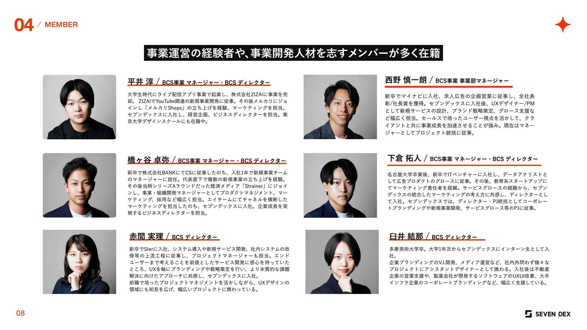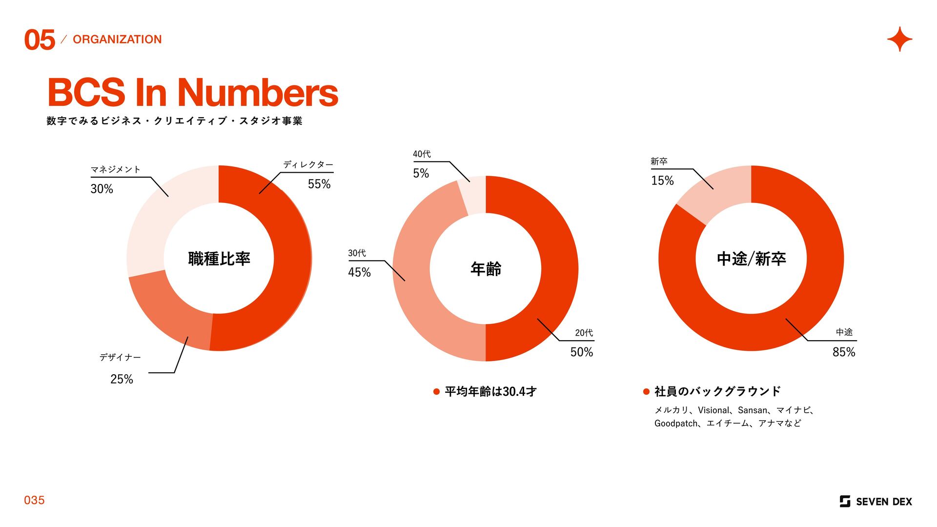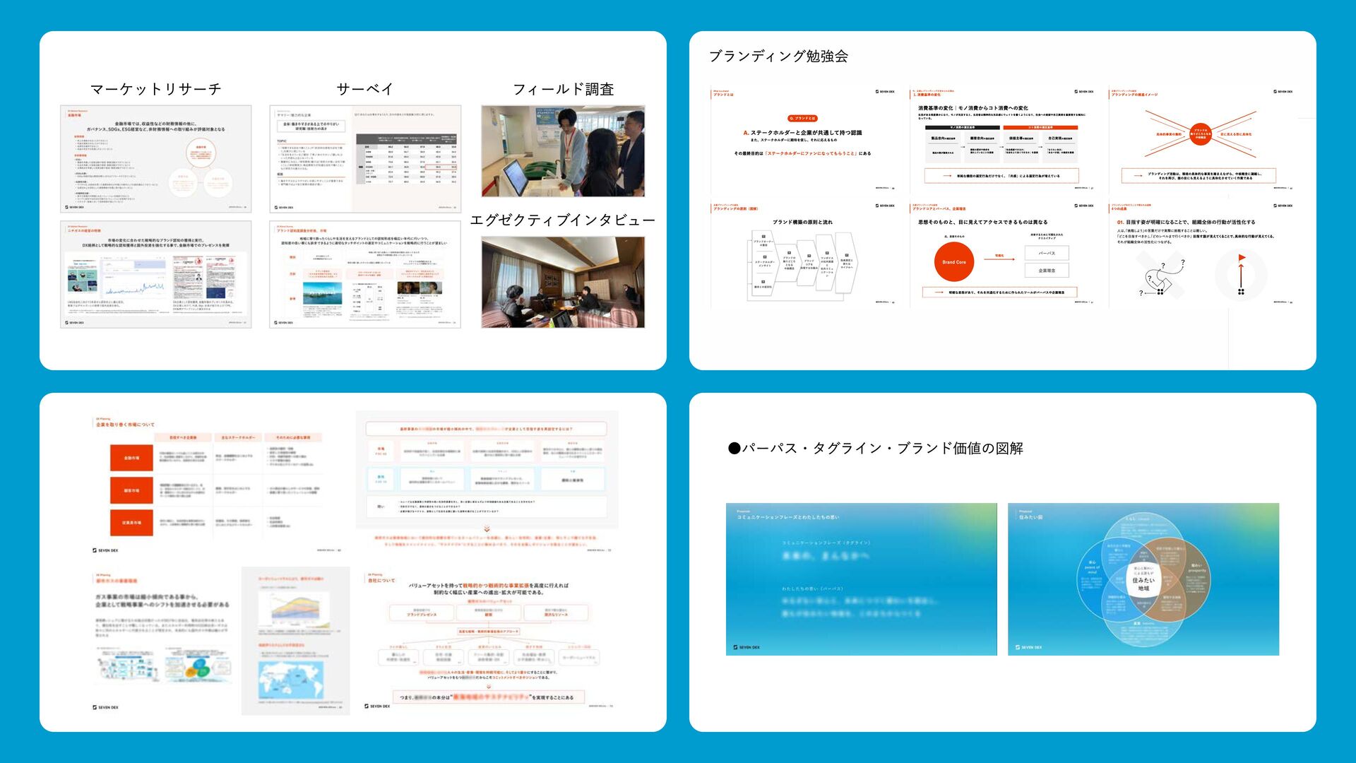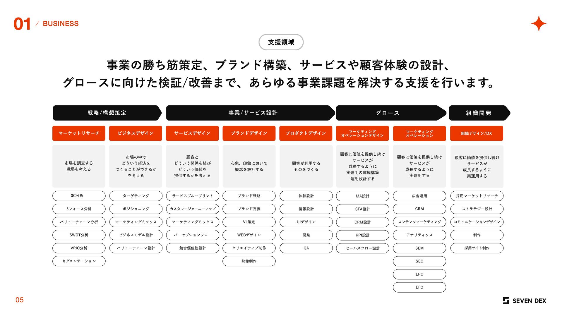ブランドとは A.ステークホルダーと企業が共通して持つ認識 また、ステークホルダーに期待を促し、それに応えるもの その最終目的は にある 「ステークホルダーにファンになってもらうこと」 消費基準の変化 今、企業にブランディングが求められる理由 @SEVEN DEX,Inc | 27 消費基準の変化|モノ消費からコト消費への変化 生活がある程度豊かになり、モノが充足すると、生活者は精神的な充足感にウェイトを置くようになり、社会への貢献や自己実現を重要視する傾向に なっている。 単純な機能の選定行為だけでなく、「共感」による選定行為が増えている 自己実現の選定基準 「なりたい自分」 「あるべき姿」の達成を重視 顧客志向の選定基準 顧客の要求や欲求を 満たしていることを重視 価値主導の選定基準 「社会貢献できるか」 「社会をより良くできるか」を重視 製品志向の選定基準 製品の質が重視される モノ消費の選定基準 コト消費の選定基準 ブランディングの推進イメージ 企業ブランディングの原則 @SEVEN DEX,Inc | 42 ブランドの 拠りどころとなる 中核概念 目に見える形に具体化 具体的事実の集約 ブランディング活動は、環境の具体的な事実を踏まえながら、中核概念に凝縮し、 それを再び、誰の目にも見えるように具体化させていく作業である ブランディングの原則(図解) 企業ブランディングの原則 @SEVEN DEX,Inc | 43 7 効果測定と 新たな サイクルへ 6 ワンボイス の社内浸透 と 社外コミュ ニケーショ ン 5 ブランド コアを 体現する仕組み 4 ブランドの 拠りどころ となる 中核概念 1 ブランドオーナー の意志 2 ステークホルダー インサイト 3 競合との差別化 ブランド構築の原則と流れ ブランドコアとパーパス、企業理念 企業ブランディングの原則 @SEVEN DEX,Inc | 41 思想そのものと、目に見えてアクセスできるものは異なる 志、思想そのもの Brand Core 可視化 共有するために可視化された クリエイティブ パーパス 企業理念 明確な思想があり、それを共通化するために作られたツールがパーパスや企業理念 4つの成果 ブランディングを行うことで得られる成果 @SEVEN DEX,Inc | 60 01. 目指す姿が明確になることで、組織全体の行動が活性化する 人は、 「挑戦しよう」 の言葉だけで実際に挑戦することは難しい。 「どこを目指すべきか」 、 「どのレベルまで行くべきか」 目指す旗が見えてくることで、 具体的な行動が見えてくる。 それが組織全体の活性化につながる。 ? ? ? ? ブランディング勉強会 •パーパス・タグライン・ブランド価値の図解 マーケットリサーチ サーベイ フィールド調査 エグゼクティブインタビュー