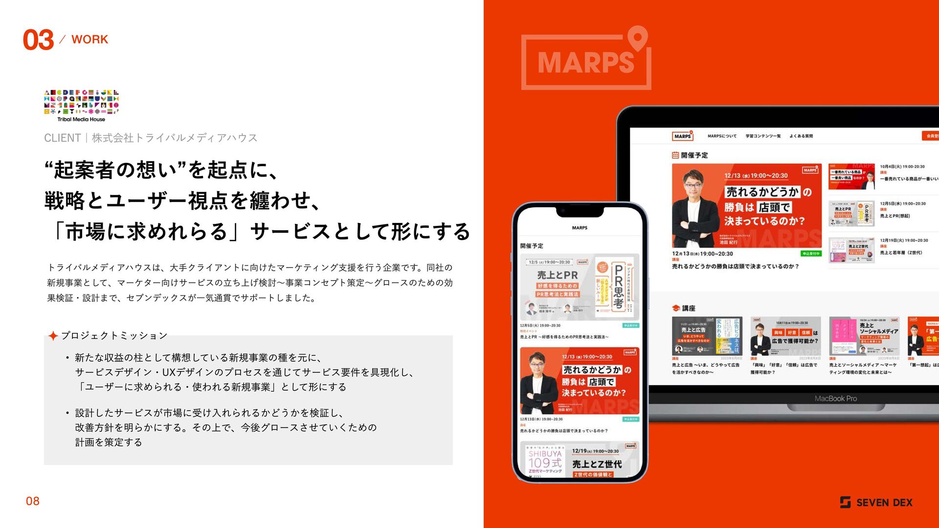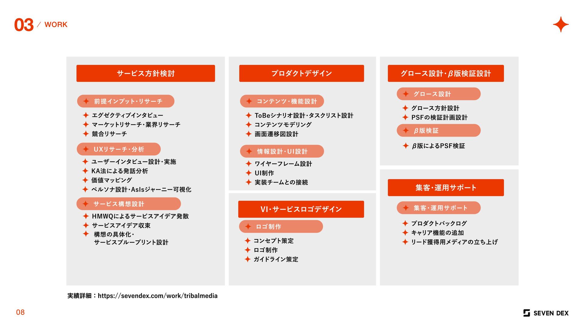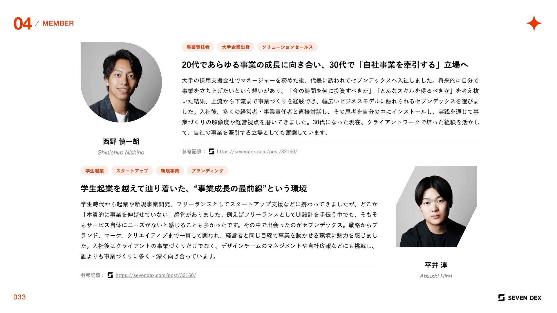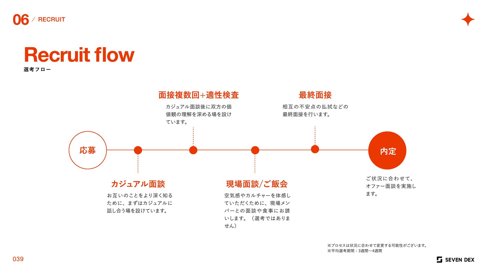ブランドとは A.ステークホルダーと企業が共通して持つ認識 また、ステークホルダーに期待を促し、それに応えるもの その最終目的は にある 「ステークホルダーにファンになってもらうこと」 消費基準の変化 今、企業にブランディングが求められる理由 @SEVEN DEX,Inc | 27 消費基準の変化|モノ消費からコト消費への変化 生活がある程度豊かになり、モノが充足すると、生活者は精神的な充足感にウェイトを置くようになり、社会への貢献や自己実現を重要視する傾向に なっている。 単純な機能の選定行為だけでなく、「共感」による選定行為が増えている 自己実現の選定基準 「なりたい自分」 「あるべき姿」の達成を重視 顧客志向の選定基準 顧客の要求や欲求を 満たしていることを重視 価値主導の選定基準 「社会貢献できるか」 「社会をより良くできるか」を重視 製品志向の選定基準 製品の質が重視される モノ消費の選定基準 コト消費の選定基準 ブランディングの推進イメージ 企業ブランディングの原則 @SEVEN DEX,Inc | 42 ブランドの 拠りどころとなる 中核概念 目に見える形に具体化 具体的事実の集約 ブランディング活動は、環境の具体的な事実を踏まえながら、中核概念に凝縮し、 それを再び、誰の目にも見えるように具体化させていく作業である ブランディングの原則(図解) 企業ブランディングの原則 @SEVEN DEX,Inc | 43 7 効果測定と 新たな サイクルへ 6 ワンボイス の社内浸透 と 社外コミュ ニケーショ ン 5 ブランド コアを 体現する仕組み 4 ブランドの 拠りどころ となる 中核概念 1 ブランドオーナー の意志 2 ステークホルダー インサイト 3 競合との差別化 ブランド構築の原則と流れ ブランドコアとパーパス、企業理念 企業ブランディングの原則 @SEVEN DEX,Inc | 41 思想そのものと、目に見えてアクセスできるものは異なる 志、思想そのもの Brand Core 可視化 共有するために可視化された クリエイティブ パーパス 企業理念 明確な思想があり、それを共通化するために作られたツールがパーパスや企業理念 4つの成果 ブランディングを行うことで得られる成果 @SEVEN DEX,Inc | 60 01. 目指す姿が明確になることで、組織全体の行動が活性化する 人は、 「挑戦しよう」 の言葉だけで実際に挑戦することは難しい。 「どこを目指すべきか」 、 「どのレベルまで行くべきか」 目指す旗が見えてくることで、 具体的な行動が見えてくる。 それが組織全体の活性化につながる。 ? ? ? ? ブランディング勉強会 •パーパス・タグライン・ブランド価値の図解 マーケットリサーチ サーベイ フィールド調査 エグゼクティブインタビュー