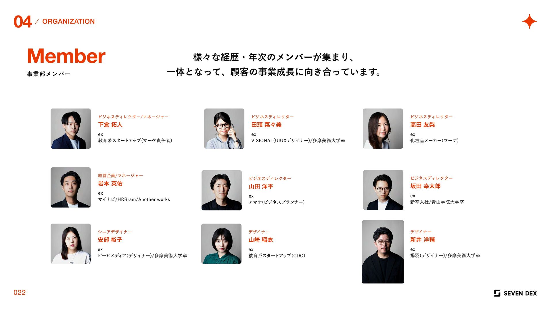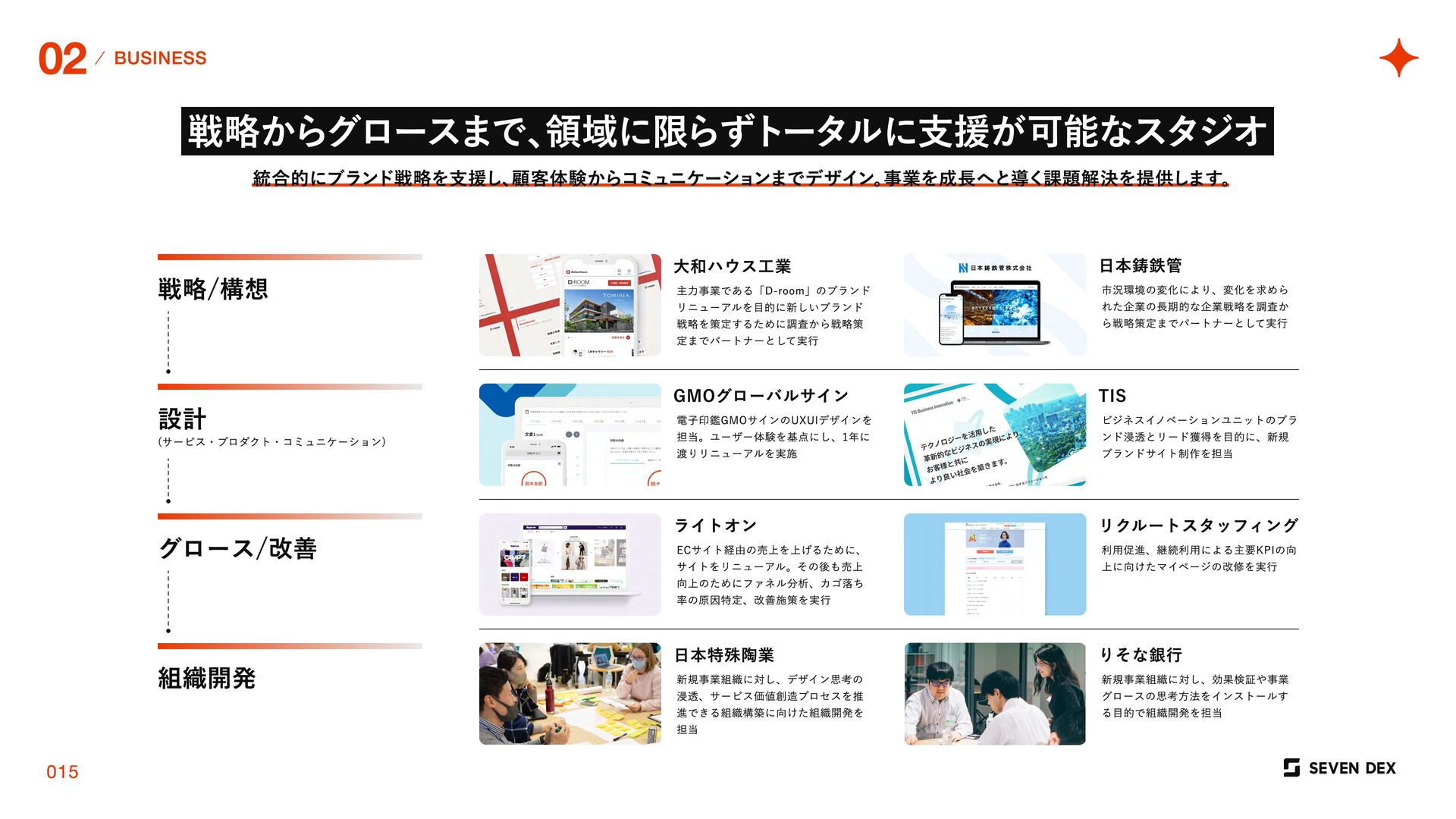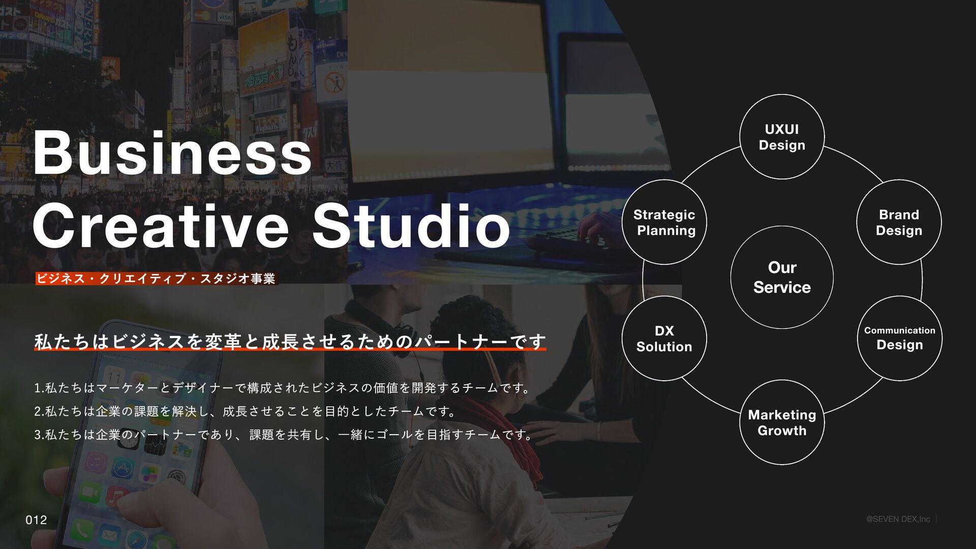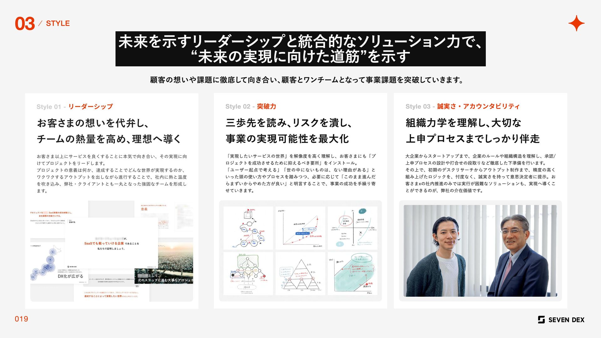 「実現したいサービスの世界」を解像度を高く理解し、お客さまにも「プ ロジェクトを成功させるために抑えるべき要所」をインストール。 「ユーザー起点で考える」「世の中にないものは、ない理由がある」と いった頭の使い方やプロセスを踏みつつ、必要に応じて「このまま進んだ らまずいからやめた方が良い」と明言することで、事業の成功を手繰り寄 せていきます。 組織力学を理解し、 大切な 上申プロセスまでしっかり伴走 Style 03 - 誠実さ・アカウンタビリティ 大企業からス タート アップまで、 企業のルールや 組織構造を理解し、 承認/ 上申プロセスの 設計や 打合せの 段取りな ど徹底した 下準備を 行います。 その 上で、 初期の デスク リサー チから アウトプ ット 制作まで、 精度の高く 組み 上げたロジ ックを、 忖度なく、 誠実さを 持って 意思決定者に 提示。お 客さま xの 社内推進のみでは実 行が 困難な ソリュー ションも、実現 へ導くこ とができるのが、 弊社の 介在価値です。 未来を 示すリ ーダーシップ と統合的なソリ ューション力で、 “未来の実現 に向けた道筋”を 示す 顧客の 想いや課題に徹底し て向き合い、 顧客とワンチームとなっ て事業 課題を 突破し ていきま す。