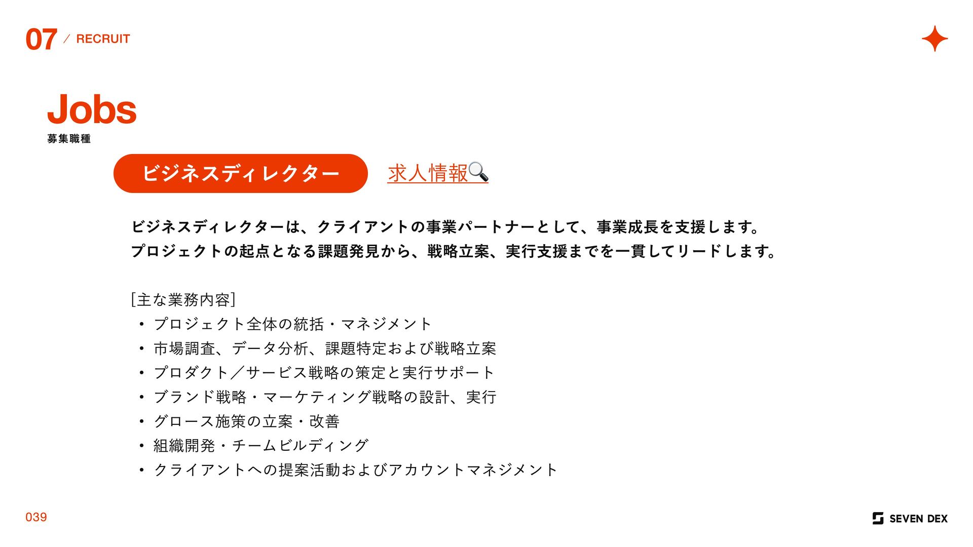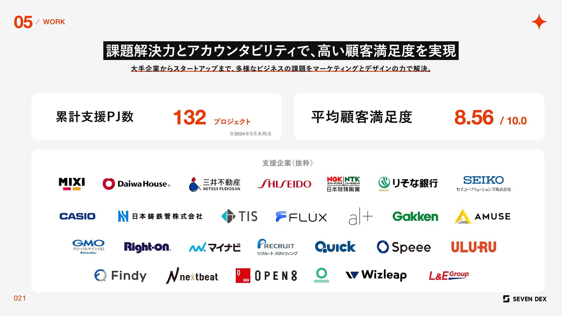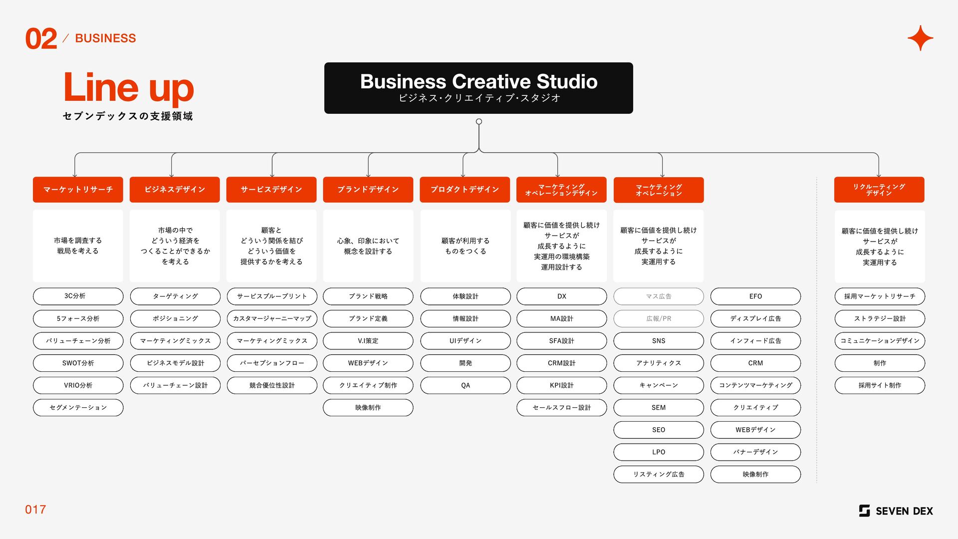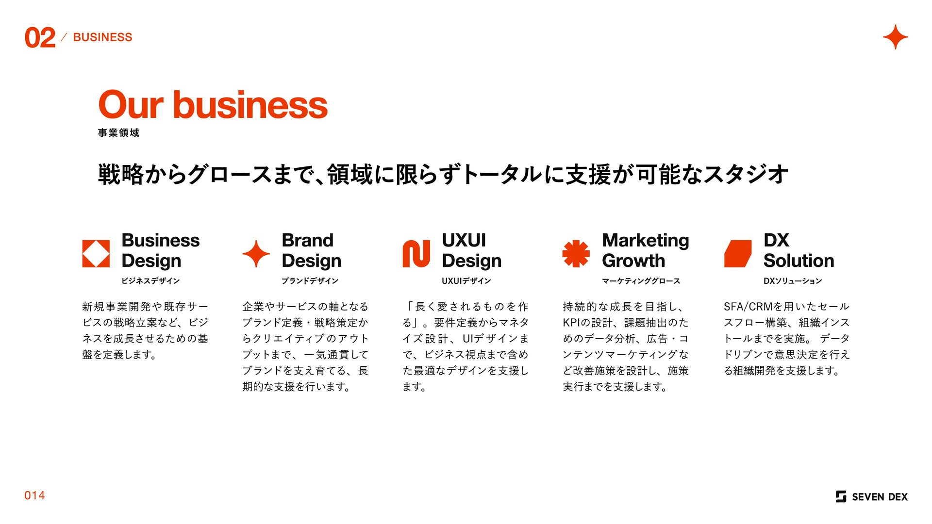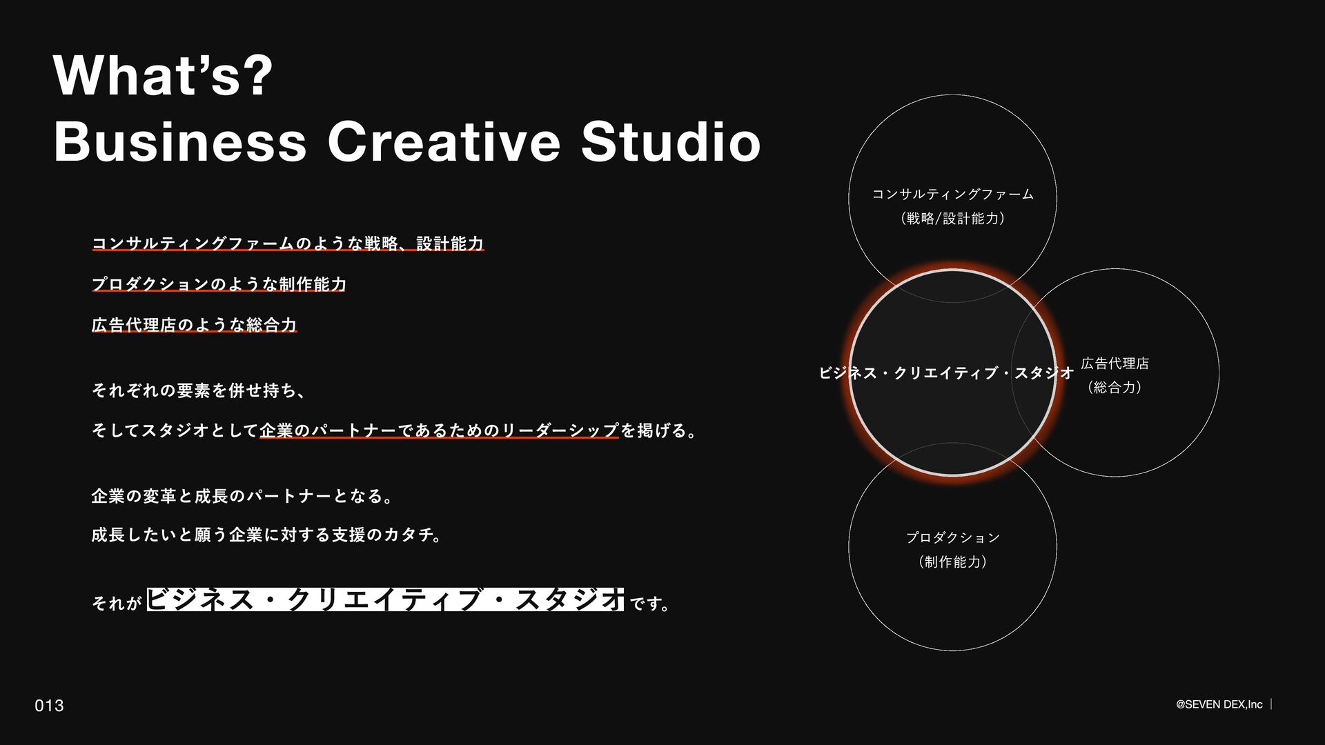 「実現したいサービスの世界」を解像度を高く理解し、お客さまにも「プ ロジェクトを成功させるために抑えるべき要所」をインストール。 「ユーザー起点で考える」「世の中にないものは、ない理由がある」と いった頭の使い方やプロセスを踏みつつ、必要に応じて「このまま進んだ らまずいからやめた方が良い」と明言することで、事業の成功を手繰り寄 せていきます。 組織力学を理解し、 大切な 上申プロセスまでしっかり伴走 Style 03 - 誠実さ・アカウンタビリティ 大企業からス タート アップまで、 企業のルールや 組織構造を理解し、 承認/ 上申プロセスの 設計や 打合せの 段取りな ど徹底した 下準備を 行います。 その 上で、 初期の デスク リサー チから アウトプ ット 制作まで、 精度の高く 組み 上げたロジ ックを、 忖度なく、 誠実さを 持って 意思決定者に 提示。お 客さま xの 社内推進のみでは実 行が 困難な ソリュー ションも、実現 へ導くこ とができるのが、 弊社の 介在価値です。 未来を 示すリ ーダーシップ と統合的なソリ ューション力で、 “未来の実現 に向けた道筋”を 示す 顧客の 想いや課題に徹底し て向き合い、 顧客とワンチームとなっ て事業 課題を 突破し ていきま す。