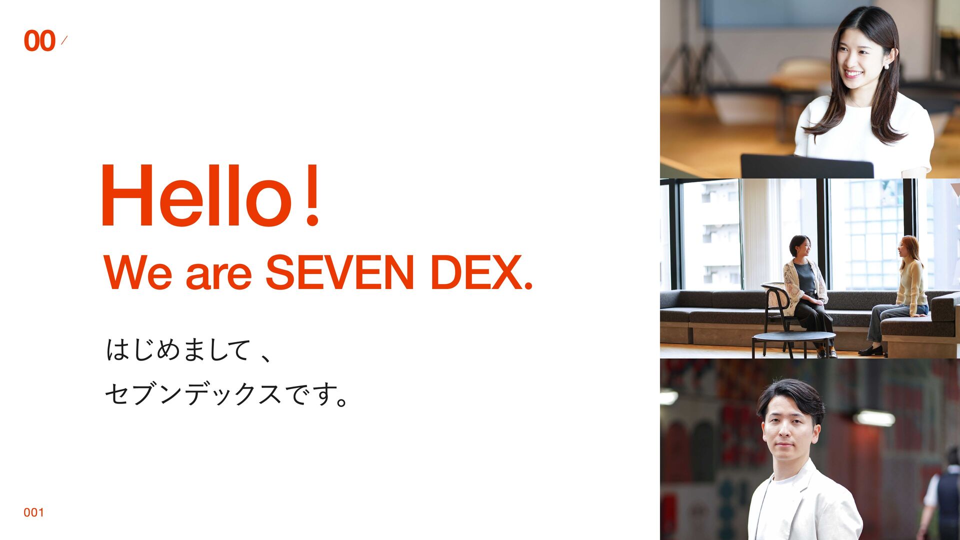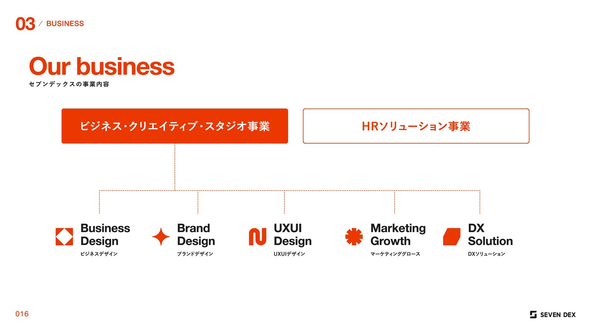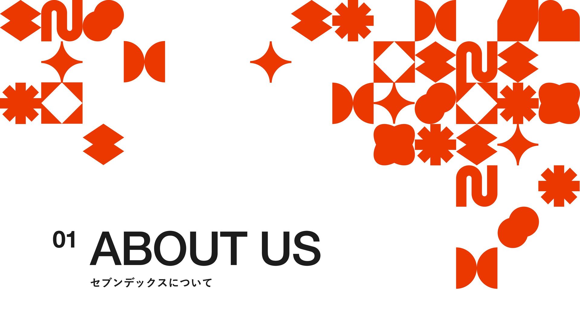 中村 伸啓  堀田 信治 英語社名 SEVENDEX,Inc 社名 株式会社セブンデックス (UXUIデザイン,ブランディング,マーケティンググロース支援,DX支援) ︎ビジネス・クリエイティブ・スタジオ事業 HRソリューション事業 会社概要 Company Profile About us 01 003