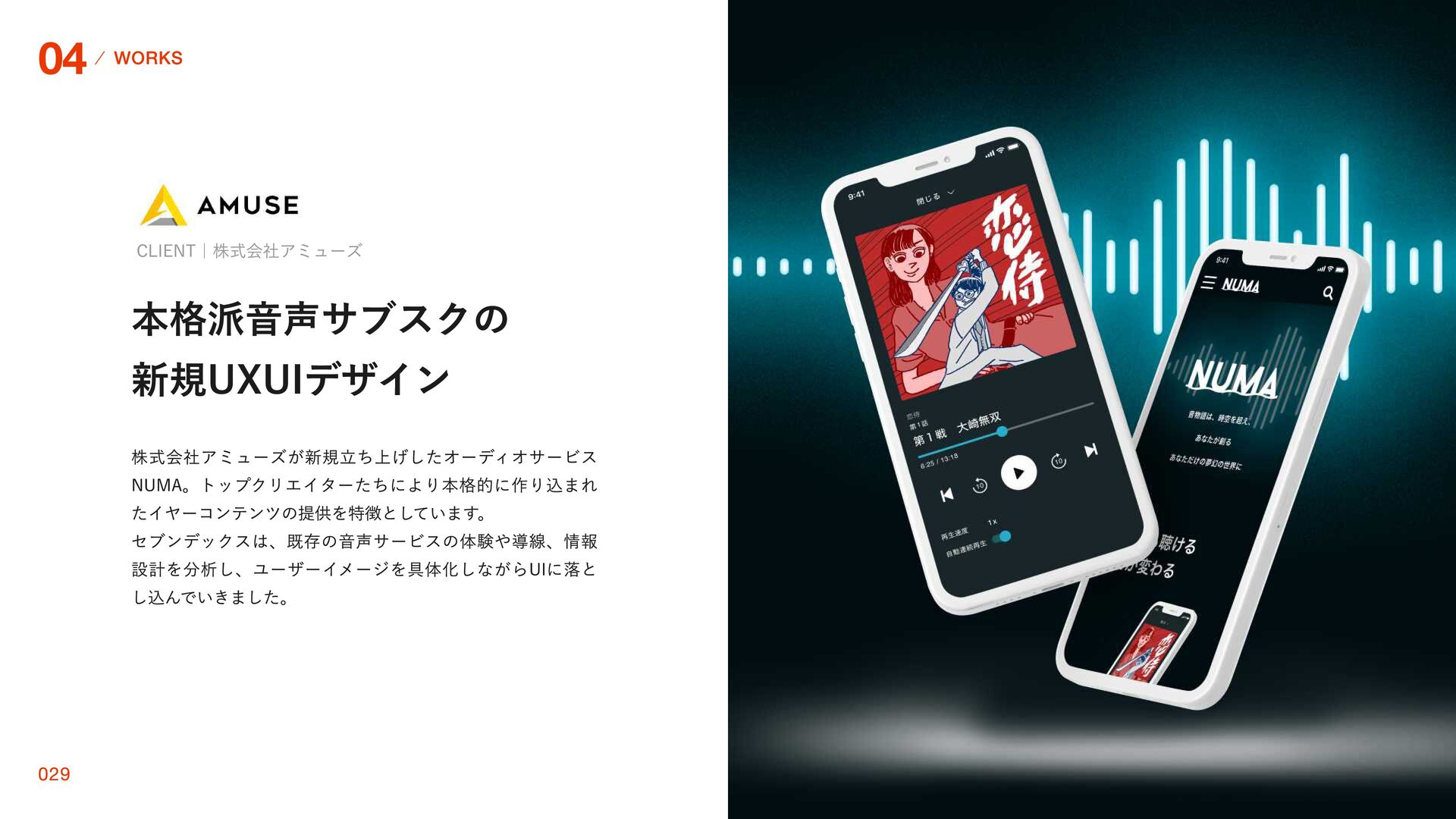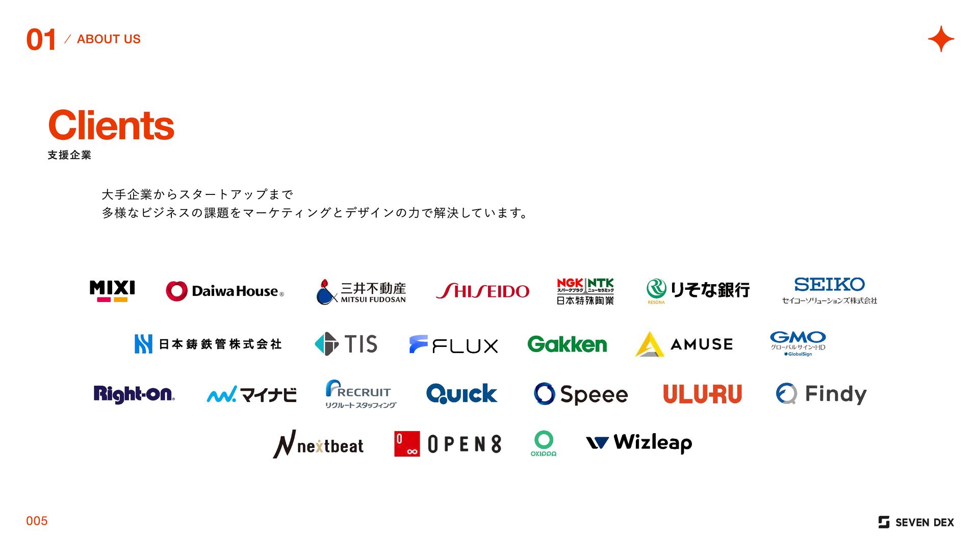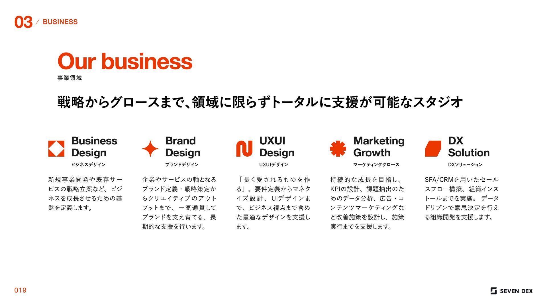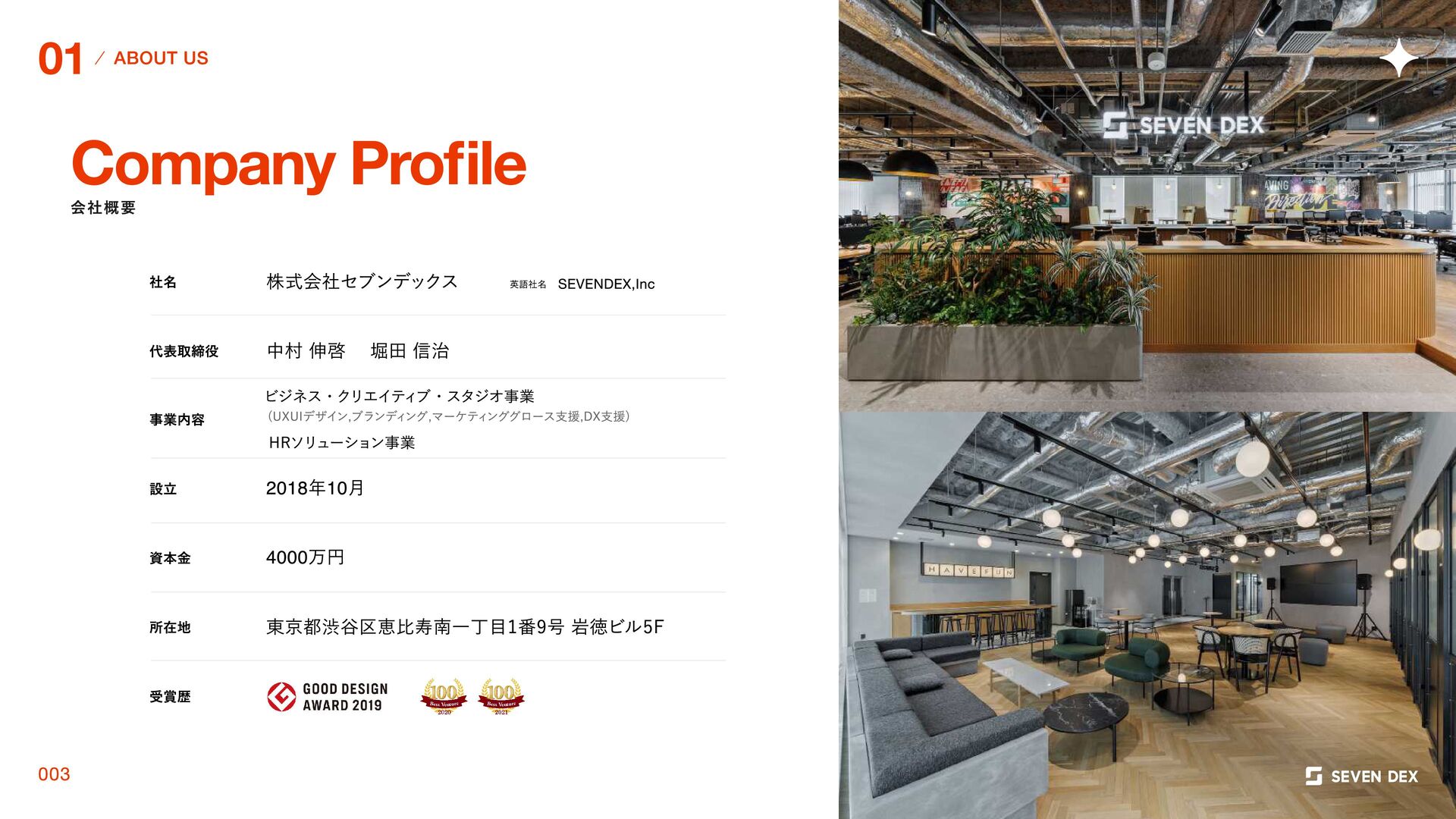 中村 伸啓  堀田 信治 英語社名 SEVENDEX,Inc 社名 株式会社セブンデックス (UXUIデザイン,ブランディング,マーケティンググロース支援,DX支援) ︎ビジネス・クリエイティブ・スタジオ事業 HRソリューション事業 会社概要 Company Profile About us 01 003