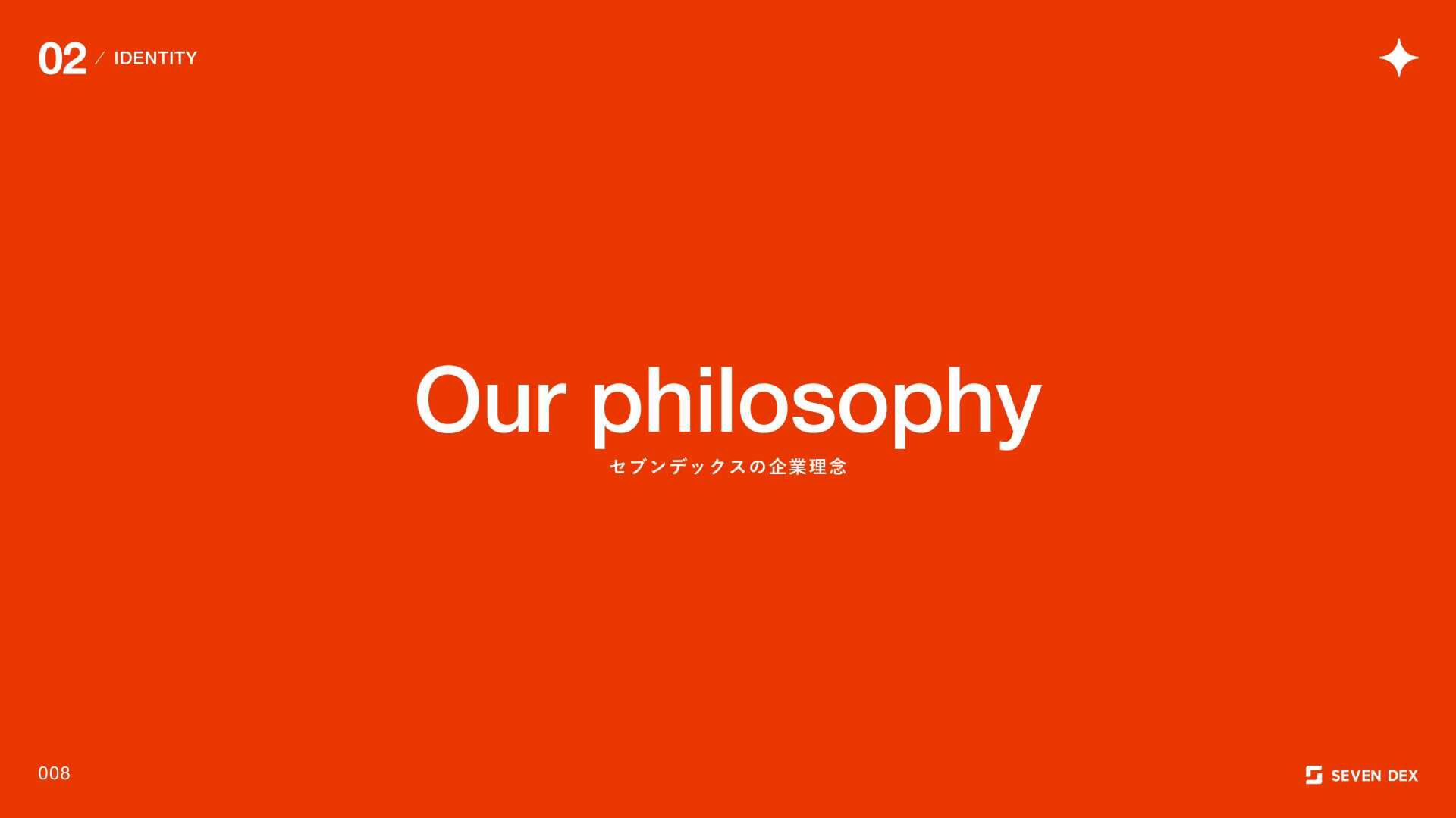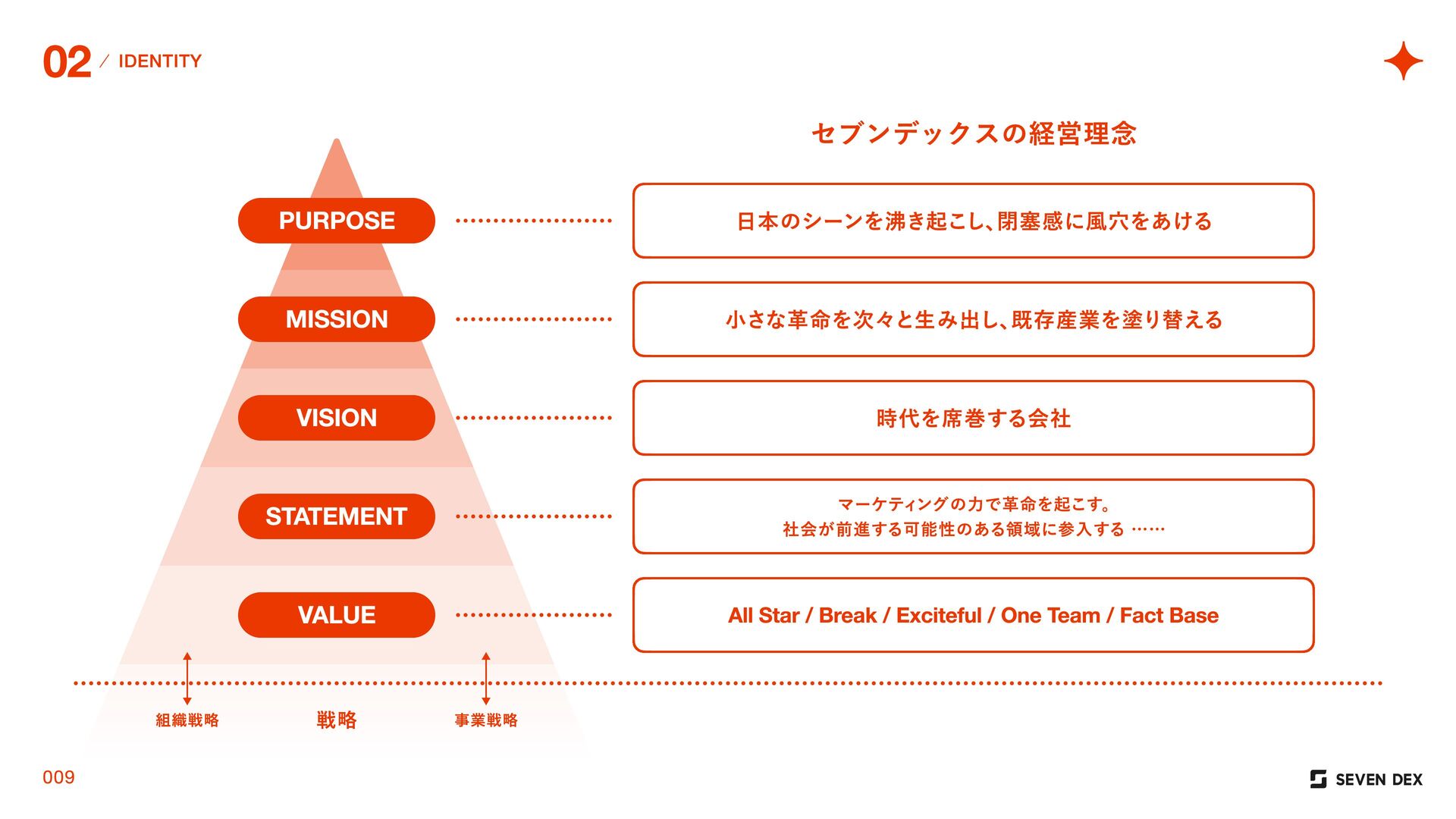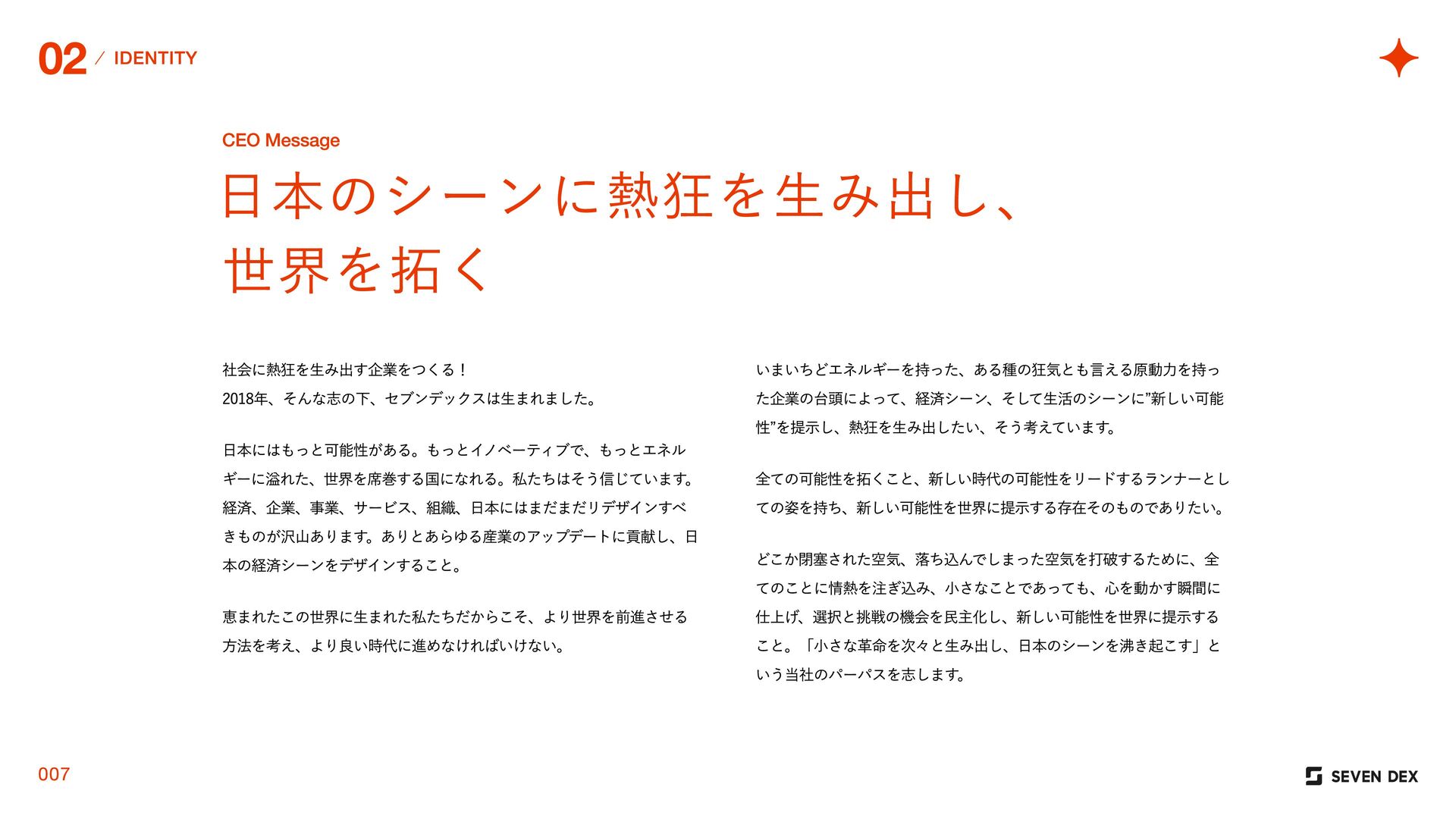 小さな革命を次々と生み出し、 既存産業を塗り替える 時代を席巻する会社 マーケティングの力で革命を起こす。 社会が前進する可能性のある領域に参入する …… All Star / Break / Exciteful / One Team / Fact Base Identity 02 009 セブンデックスの経営理念