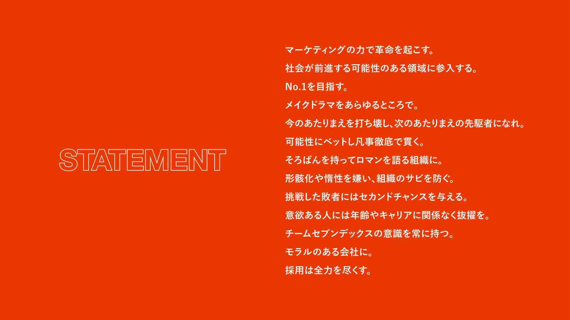 可能性にベットし凡事徹底で貫く。 そろばんを持ってロマンを語る組織に。 形骸化や惰性を嫌い、 組織のサビを防ぐ。 挑戦した敗者にはセカンドチャンスを与える。 意欲ある人には年齢やキャリアに関係なく抜擢を。 チームセブンデックスの意識を常に持つ。 モラルのある会社に。 採用は全力を尽くす。 STATEMENT