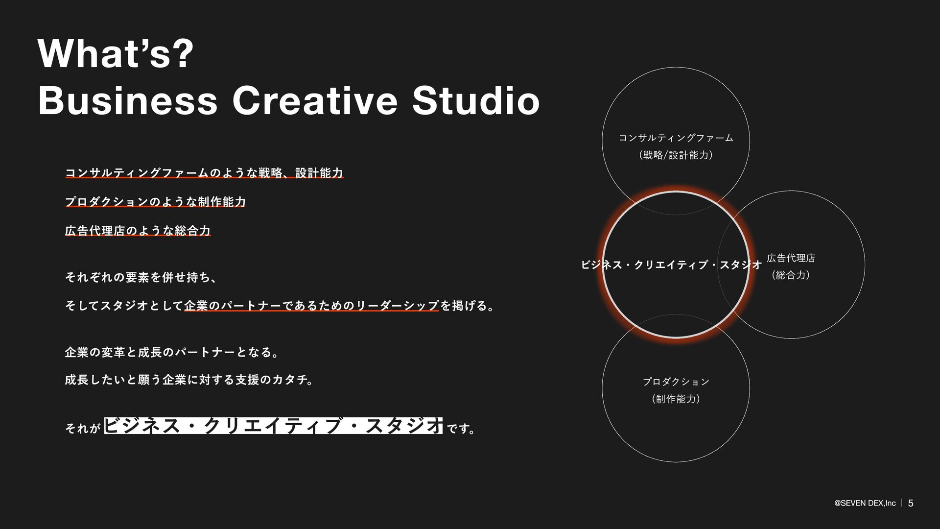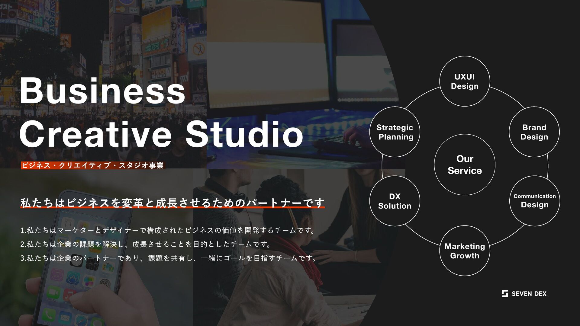 8. 2 Business Creative Studio 1.私たちはマーケターとデザイナーで構成されたビジネスの価値を開発するチームです。 2.私たちは企業の課題を解決し、成長させることを目的としたチームです。 3.私たちは企業のパートナーであり、⁨ ⁩ 課題を共有し、一緒にゴールを目指すチームです。 1.私たちはマーケターとデザイナーで構成されたビジネスの価値を開発するチームです。