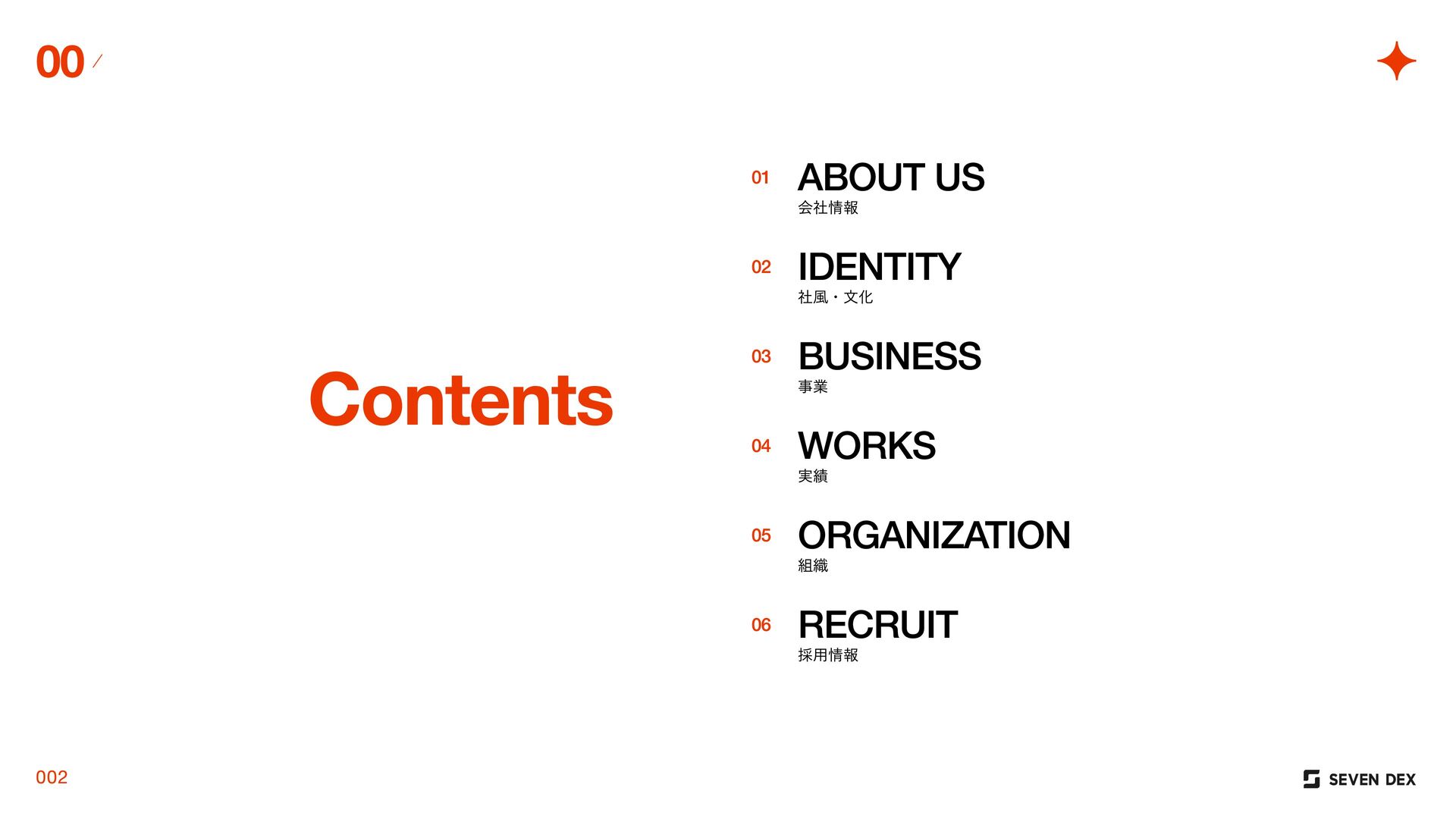 03 Business 事業 02 Identity 社風・文化 01 About us 会社情報 00 002