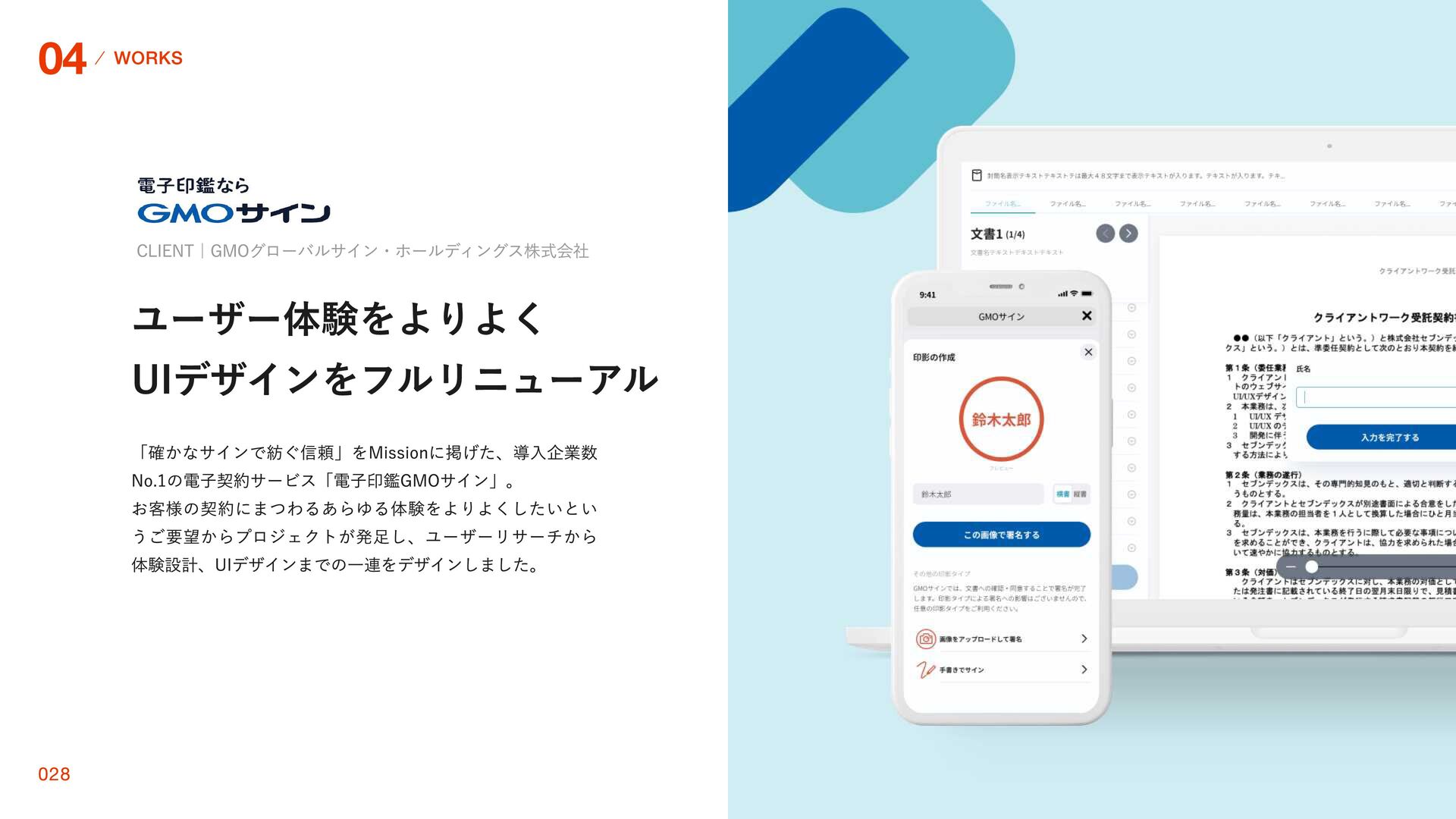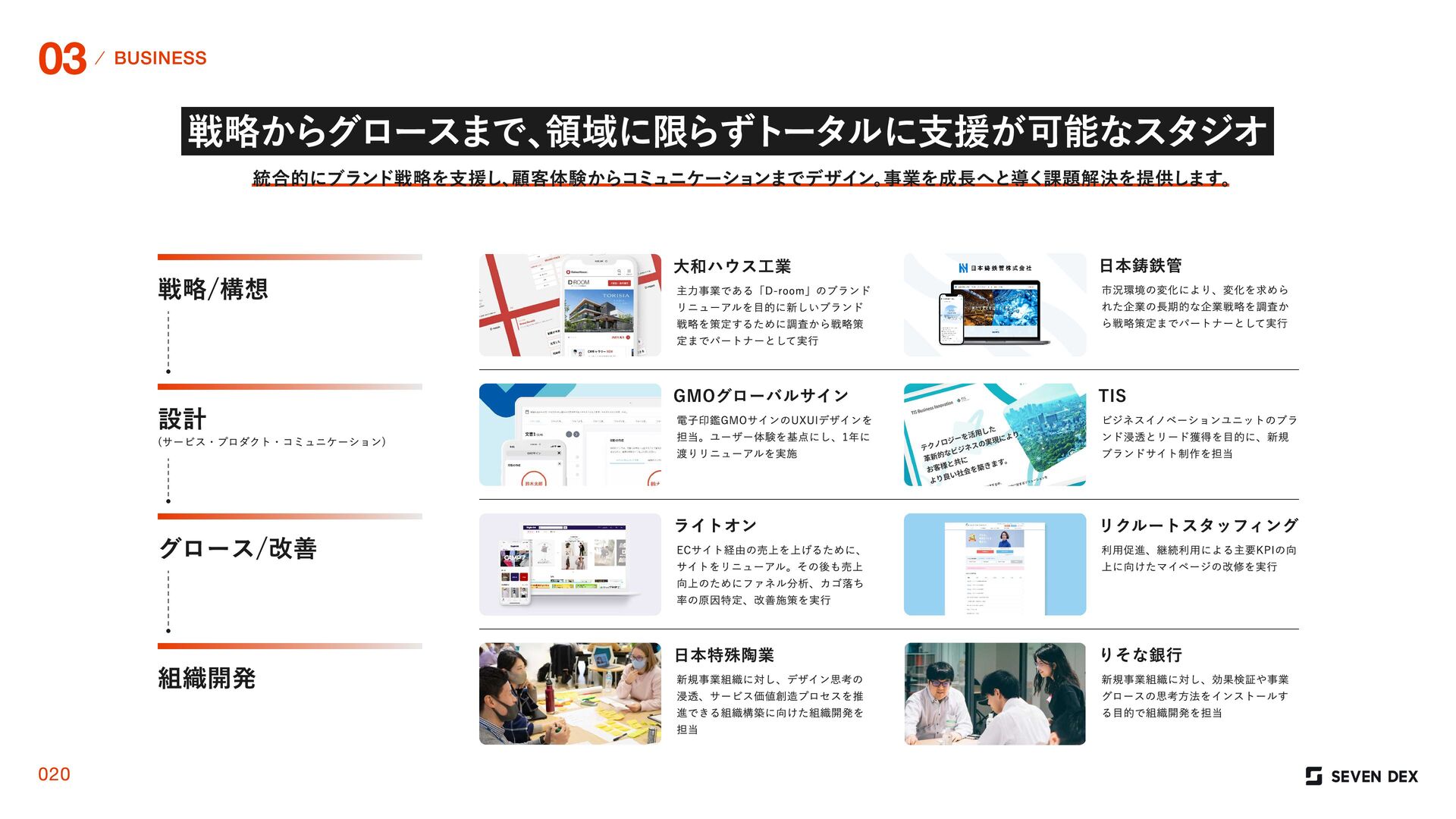 定までパートナーとして実行 大和ハウス工業 日本鋳鉄管 市況環境の変化により、変化を求めら れた企業の長期的な企業戦略を調査か ら戦略策定までパートナーとして実行 GMOグローバルサイン 電子印鑑GMOサインのUXUIデザインを 担当。ユーザー体験を基点にし、1年に 渡りリニューアルを実施 ビジネスイノベーションユニットのブラ ンド浸透とリード獲得を目的に、新規 ブランドサイト制作を担当 TIS ライトオン ECサイト経由の売上を上げるために、 サイトをリニューアル。その後も売上 向上のためにファネル分析、カゴ落ち 率の原因特定、改善施策を実行 利用促進、継続利用による主要KPIの向 上に向けたマイページの改修を実行 リクルートスタッフィング 日本特殊陶業 新規事業組織に対し、デザイン思考の 浸透、サービス価値創造プロセスを推 進できる組織構築に向けた組織開発を 担当 りそな銀行 新規事業組織に対し、効果検証や事業 グロースの思考方法をインストールす る目的で組織開発を担当 統合的にブランド戦略を支援し、 顧客体験からコミュニケーションまでデザイン。 事業を成長へと導く課題解決を提供します。 BUSINESS 03 020