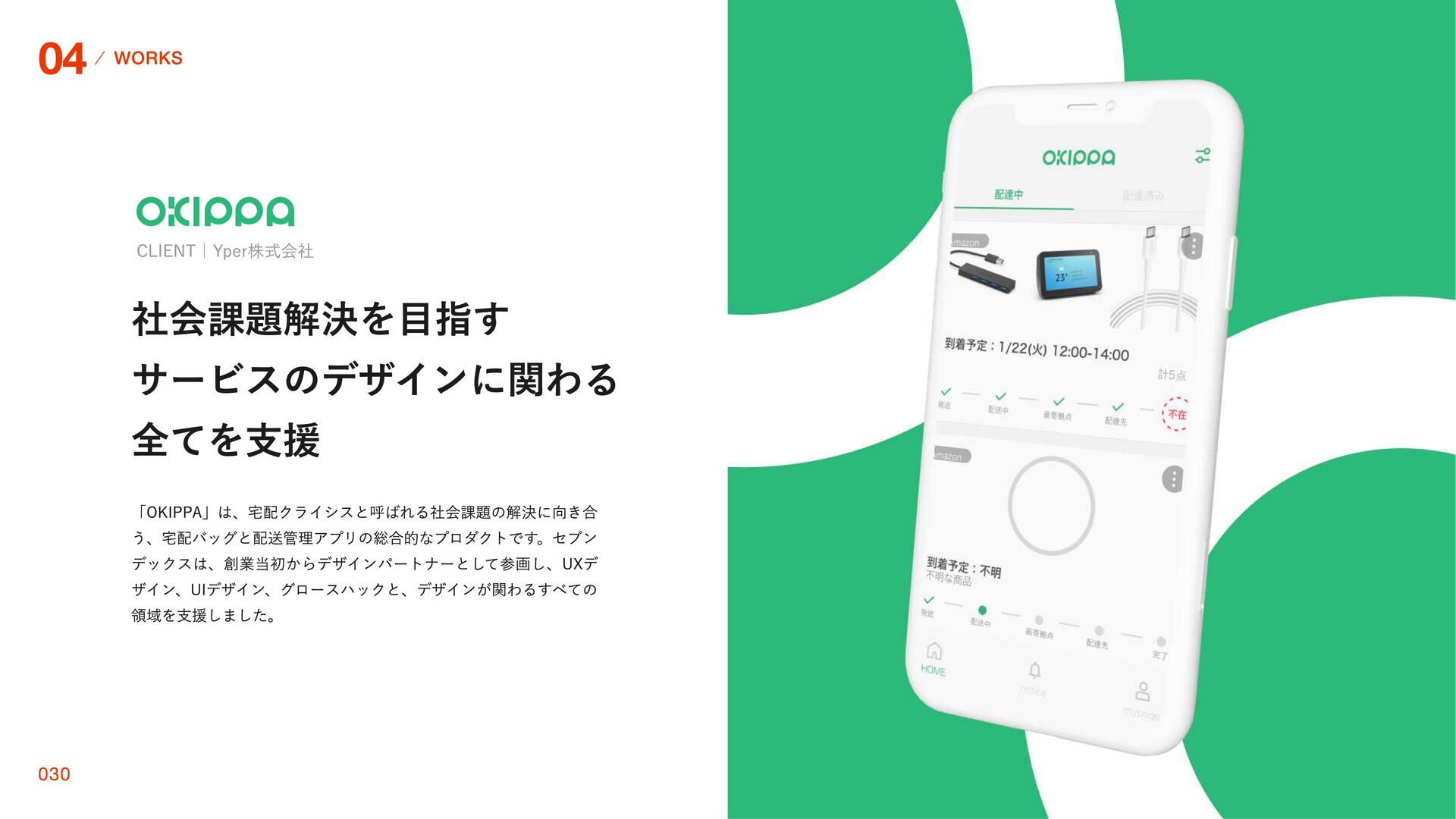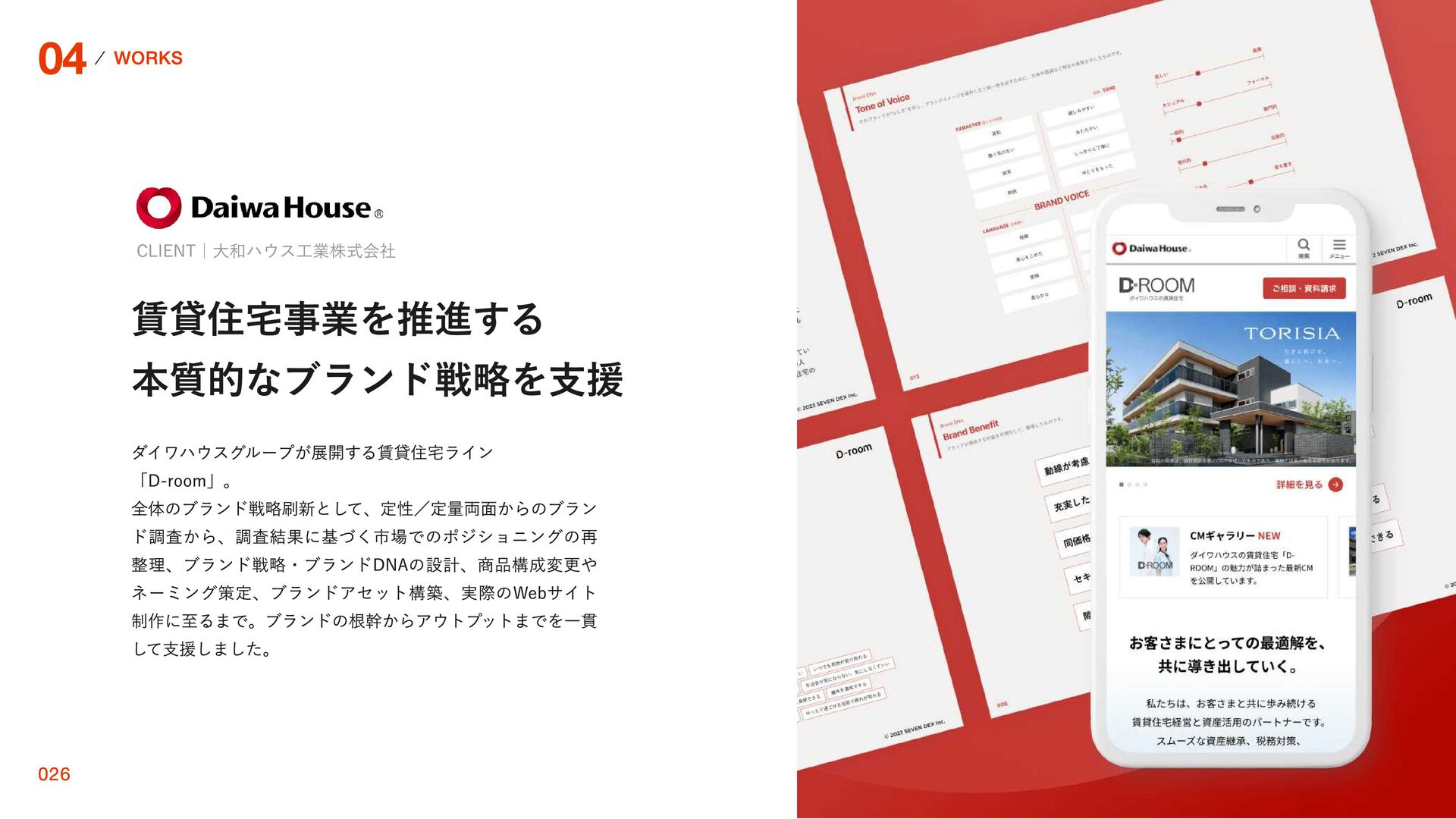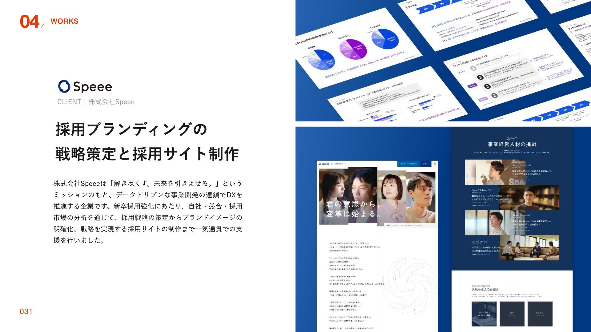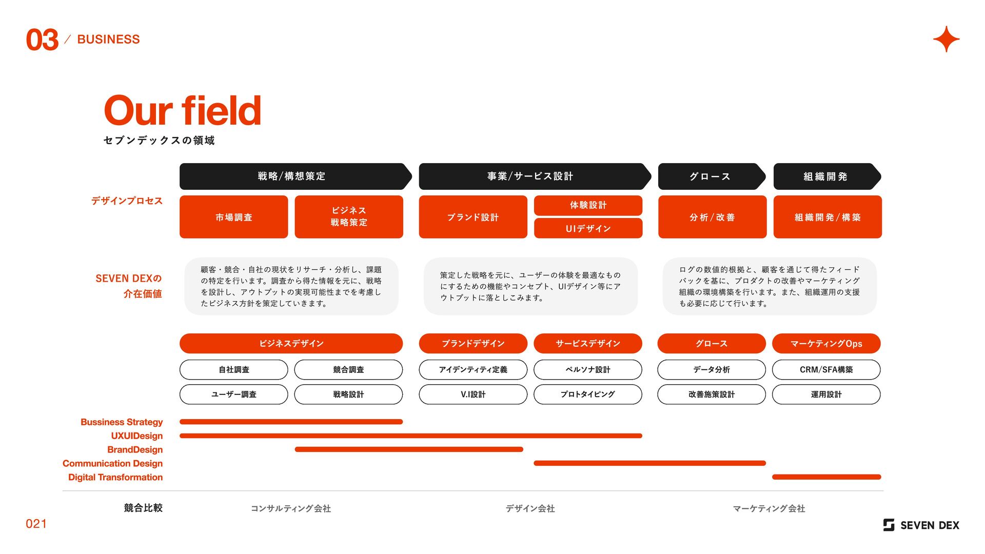 顧客・競合・自社の現状をリサーチ・分析し、課題 の特定を行います。調査から得た情報を元に、戦略 を設計し、アウトプットの実現可能性までを考慮し たビジネス方針を策定していきます。 策定した戦略を元に、ユーザーの体験を最適なもの にするための機能やコンセプト、UIデザイン等にア ウトプットに落としこみます。 ログの数値的根拠と、顧客を通じて得たフィード バックを基に、プロダクトの改善やマーケティング 組織の環境構築を行います。また、組織運用の支援 も必要に応じて行います。 BrandDesign UXUIDesign Bussiness Strategy Communication Design Digital Transformation デザインプロセス 戦略/構想策定 市場調査 ブランド設計 体験設計 UIデザイン ビジネス 戦略策定 事業/サービス設計 分 析 / 改 善 組 織 開 発 / 構 築 自社調査 ビジネスデザイン 競合調査 ユーザー調査 戦略設計 アイデンティティ定義 ブランドデザイン サービスデザイン ペルソナ設計 V.I設計 プロトタイピング データ分析 グロース マーケティングOps CRM/SFA構築 改善施策設計 運用設計 グロ ー ス 組 織 開 発 BUSINESS 03 021