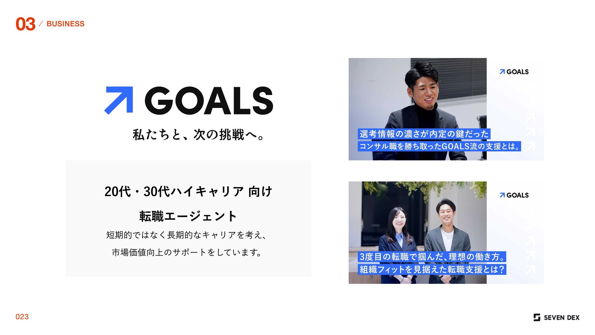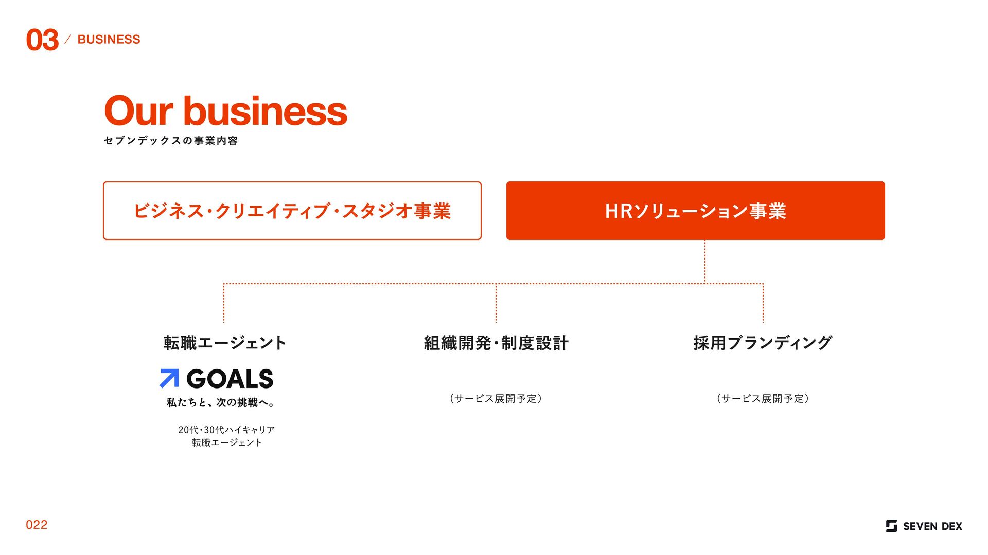 12. セブンデックスの事業内容 Our business ビジネス・クリエイティブ・スタジオ事業 Business 03 022 HRソリューション事業 20代・30代ハイキャリア 転職エージェント