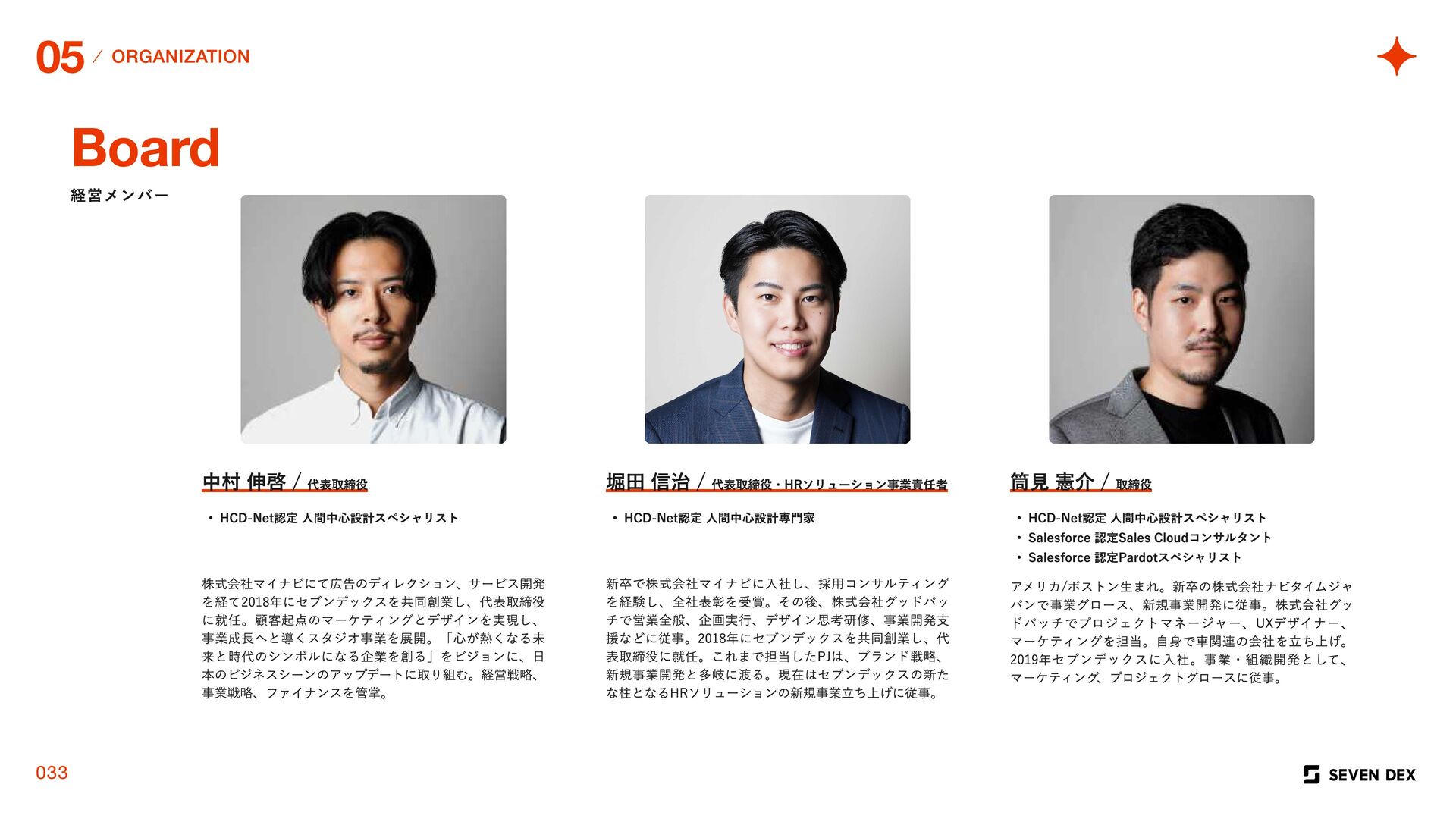 を経て2018年にセブンデックスを共同創業し、代表取締役 に就任。顧客起点のマーケティングとデザインを実現し、 事業成長へと導くスタジオ事業を展開。「心が熱くなる未 来と時代のシンボルになる企業を創る」をビジョンに、日 本のビジネスシーンのアップデートに取り組む。経営戦略、 事業戦略、ファイナンスを管掌。 堀田 信治 / 代表取締役・HRソリューション事業責任者 HCD-Net認定 人間中心設計専門家 新卒で 株式会社マイナビに 入 社し、 採用コ ンサルティング を経 験 し、 全 社表 彰 を 受賞 。 そ の 後 、株式会社グッ ドパ ッ チで 営業 全般 、企 画 実 行 、デザイン 思考研修 、事業開発 支 援 な ど に 従 事。2018年にセブンデックスを共同創業し、代 表取締役に就任。 これまで担当 し たPJは 、ブ ラ ン ド 戦略、 新規 事業開発と 多岐 に 渡 る。現 在は セブンデックスの 新た な 柱 となる HRソリュ ーションの 新規 事業 立ち上げ に 従 事。 筒見 憲介 / 取締役 HCD-Net認定 人間中心設計スペシャリス ト Sal e sforc e 認定 Sal e s C loudコンサルタント Sal e sforc e 認定 Pardo tスペシャリスト ア メリカ/ ボストン 生まれ 。 新卒 の株式会社ナビタイ ム ジ ャ パ ン で 事業グ ロ ース、 新規 事業開発に 従 事。株式会社グッ ドパ ッ チで プ ロ ジ ェ クトマネージ ャ ー、 UX デザイナー、 マーケティングを 担当 。 自身で車関連 の会社を 立ち上げ 。 201 9 年セブンデックスに 入 社。事業 ・ 組 織 開発として、 マーケティング 、プ ロ ジ ェ クトグ ロ ースに 従 事。 経営メンバー Board