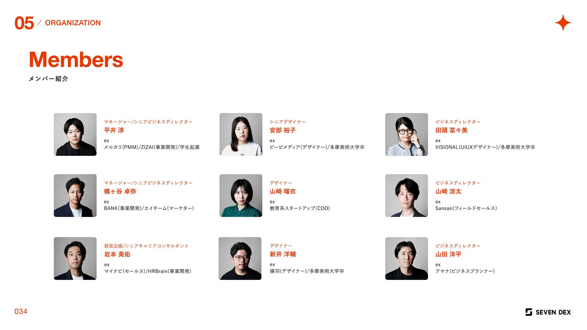 シニアデザイナー 安部 裕子 ex ビービメディア(デザイナー)/多摩美術大学卒 マネージャー/シニアビジネスディレクター 平井 淳 ex メルカリ(PMM)/ZIZAI(事業開発)/学生起業 マネージャー/シニアビジネスディレクター 橋ヶ谷 卓弥 ex BANK(事業開発)/エイチーム(マーケター) デザイナー 山崎 瑠衣 ex 教育系スタートアップ(CDO) ビジネスディレクター 山田 洋平 ex アマナ(ビジネスプランナー) ビジネスディレクター 山﨑 涼太 ex Sansan(フィールドセールス) 経営企画/シニアキャリアコンサルタント 岩本 英佑 ex マイナビ(セールス)/HRBrain(事業開発) デザイナー 新井 洋輔 ex 揚羽(デザイナー)/多摩美術大学卒