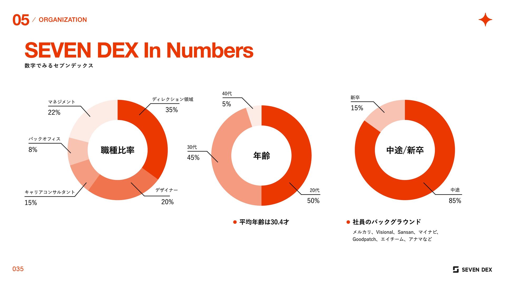 デザイナー 20% キャリアコンサルタント 15% バックオフィス 8% ディレクション領域 35% マネジメント 22% 数字でみるセブンデックス SEVEN DEX In Numbers Organization 05 035 年齢 50% 20代 45% 30代 5% 40代