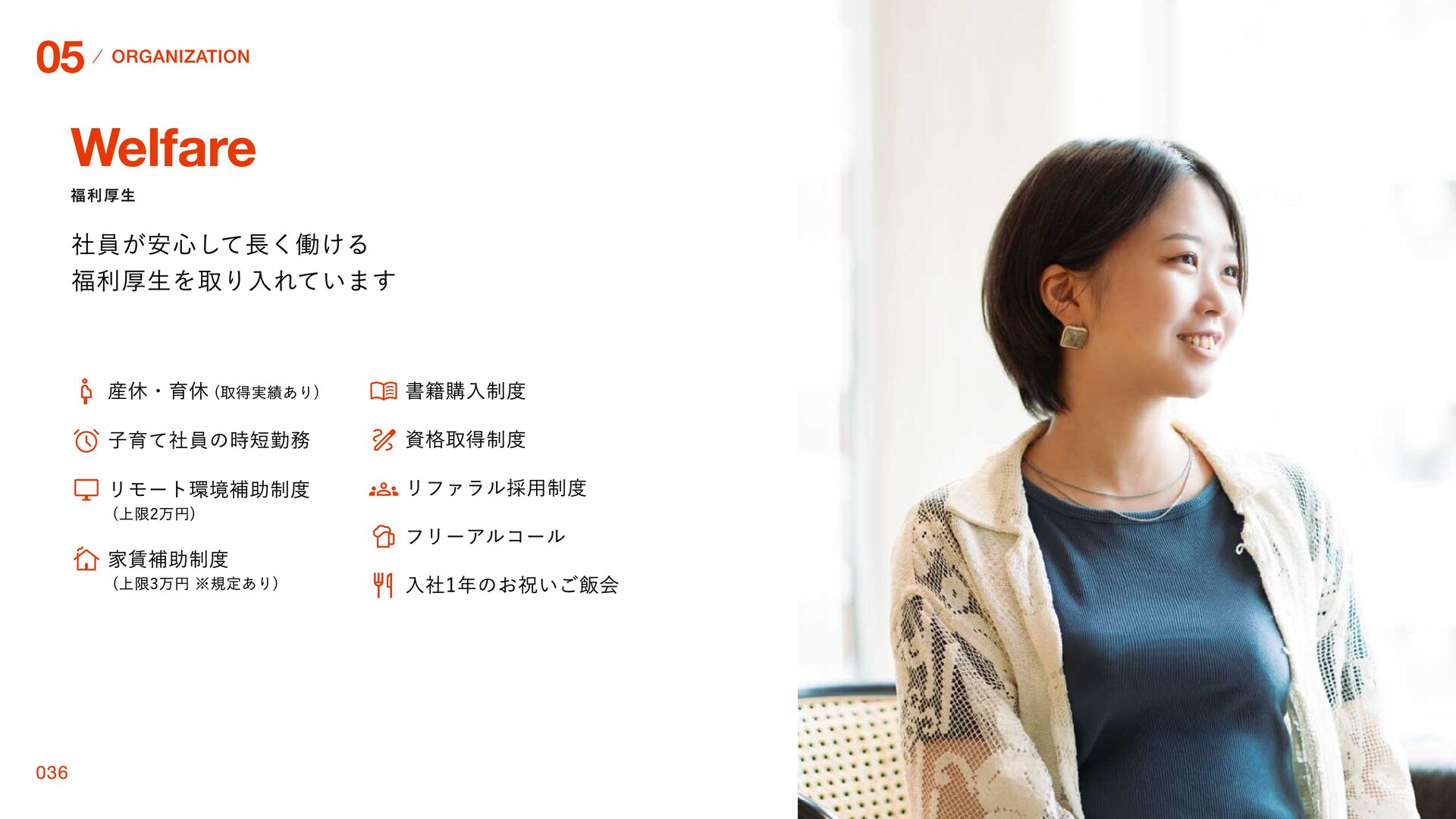 16. Organization 05 036 社員が安心して長く働ける 福利厚生を取り入れています 福 利 厚 生 Welfare