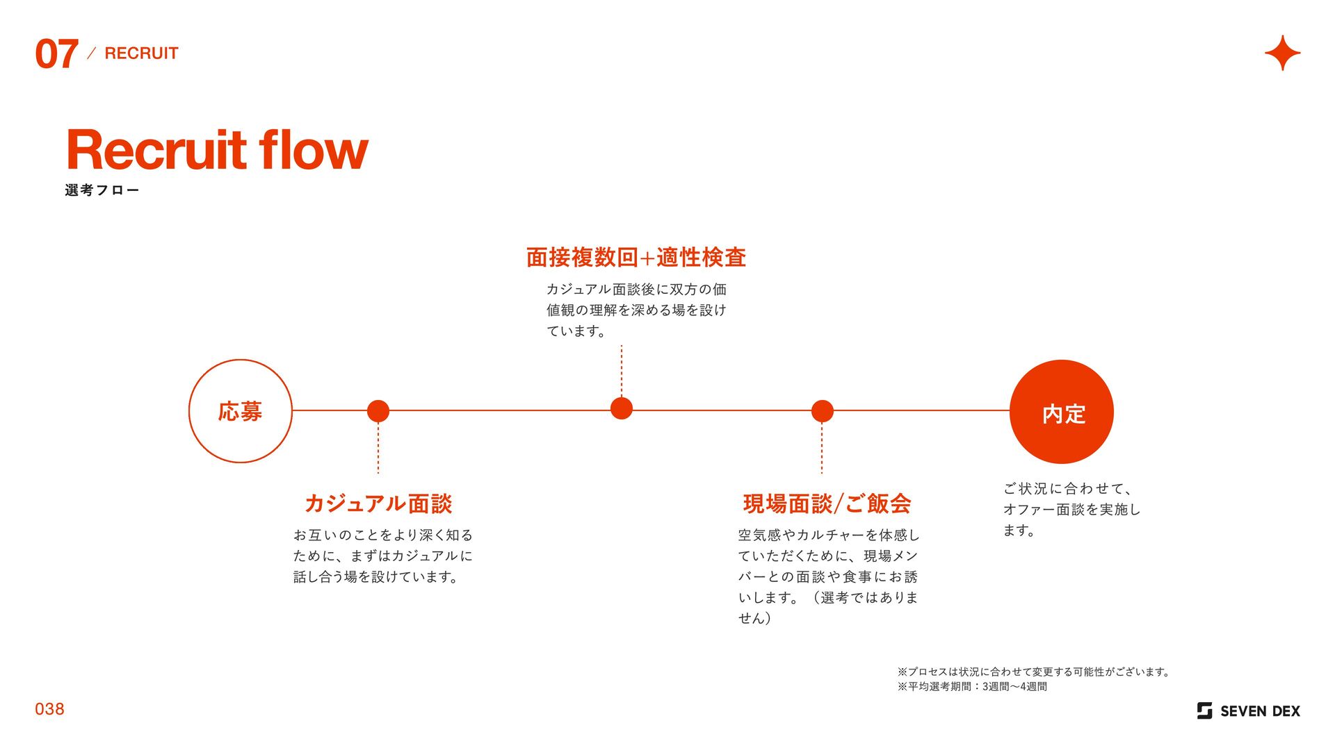 お互いのことをより深く知る ために、まずはカジュアルに 話し合う場を設けています。 現場面談/ご飯会 カジュアル面談 内定 応募 カジュアル面談後に双方の価 値観の理解を深める場を設け ています。 面接複数回+適性検査 選考フロー Recruit flow Recruit 07 038
