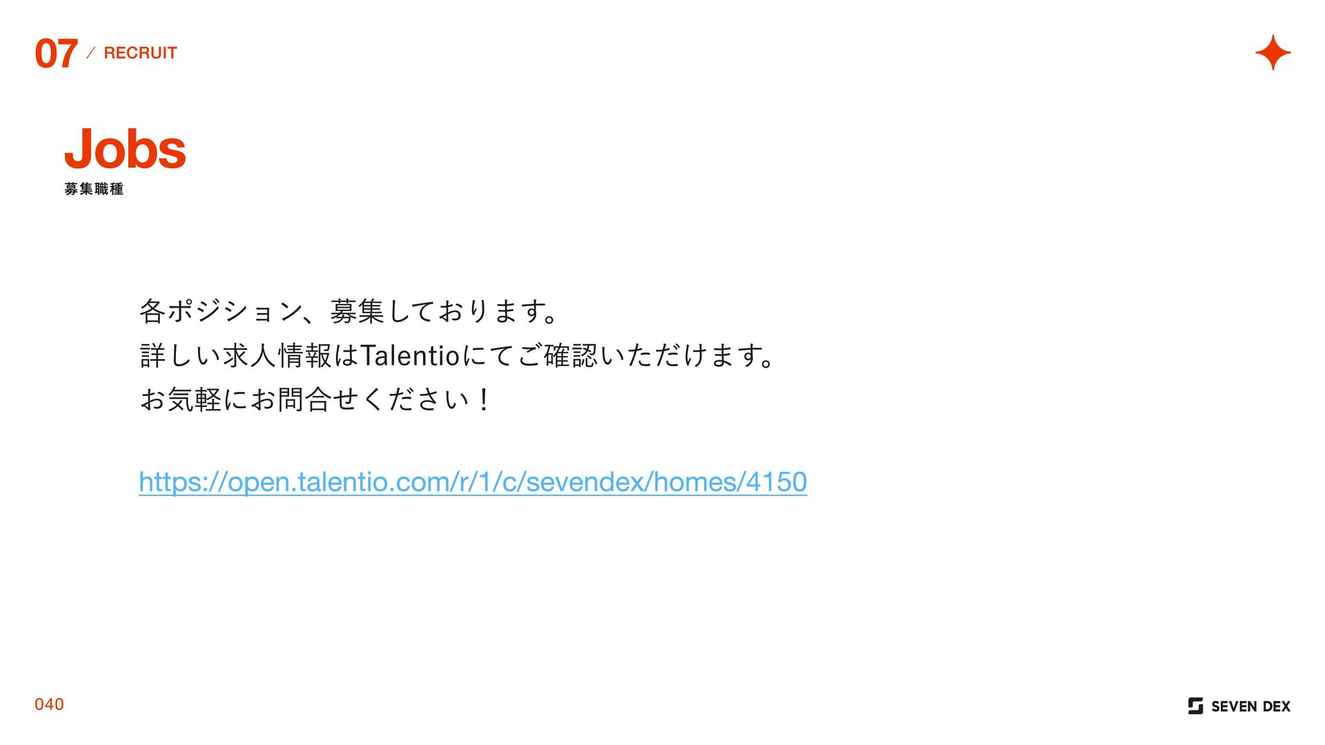 けではなく、課題解決能力や論理 的思考力、コミュニケーション能 力など、自分たちで正解を創って いくセブンデックスのメンバーとし てのケイパビリティフィット ケイパビリティフィット 02 Recruit 07 039