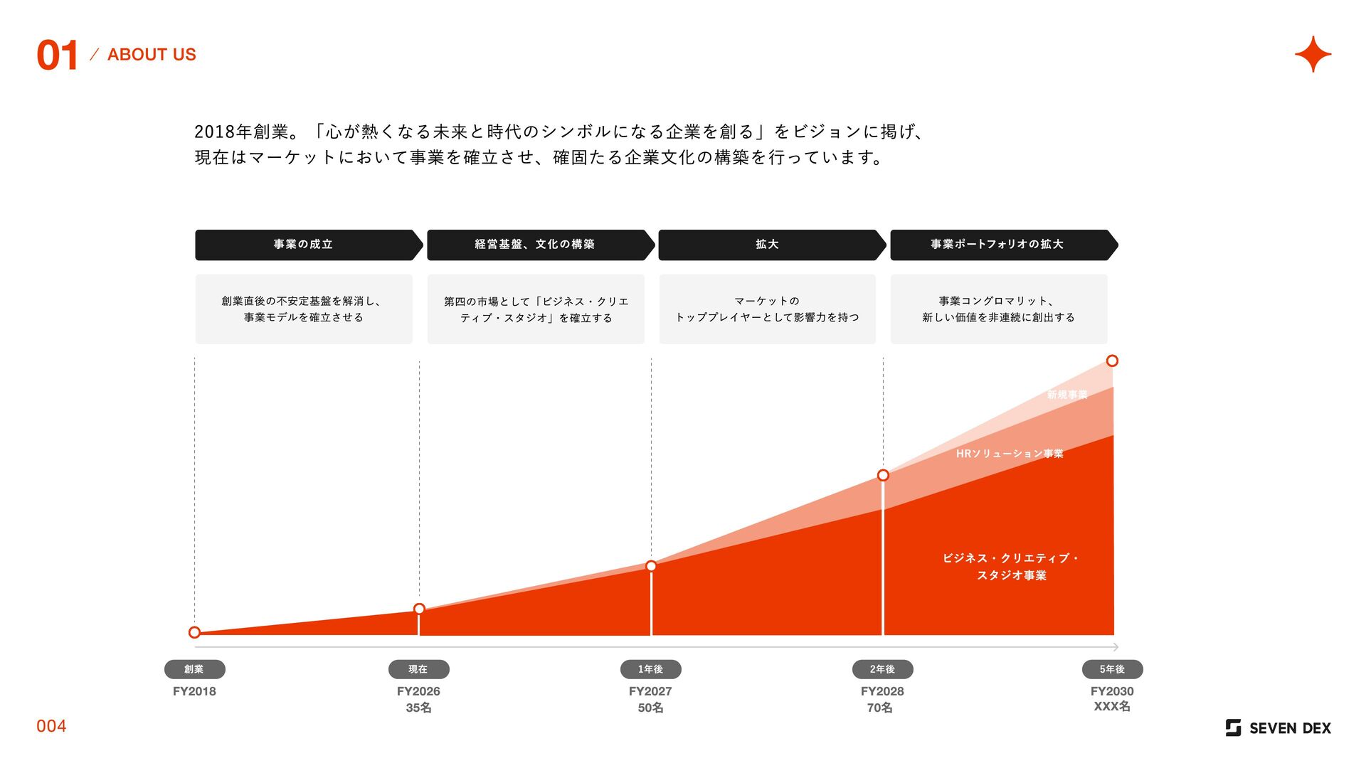 ビジネス・クリエティブ・ スタジオ事業 新規事業 HRソリューション事業 事業コングロマリット、 新しい価値を非連続に創出する マーケットの トッププレイヤーとして影響力を持つ 第四の市場として「ビジネス・クリエ ティブ・スタジオ」を確立する 創業直後の不安定基盤を解消し、 事業モデルを確立させる 事業ポートフォリオの拡大 拡大 経営基盤、文化の構築 事業の成立 2018年創業。「心が熱くなる未来と時代のシンボルになる企業を創る」をビジョンに掲げ、 現在はマーケットにおいて事業を確立させ、確固たる企業文化の構築を行っています。 35名 50名 70名 XXX名 About us 01 004