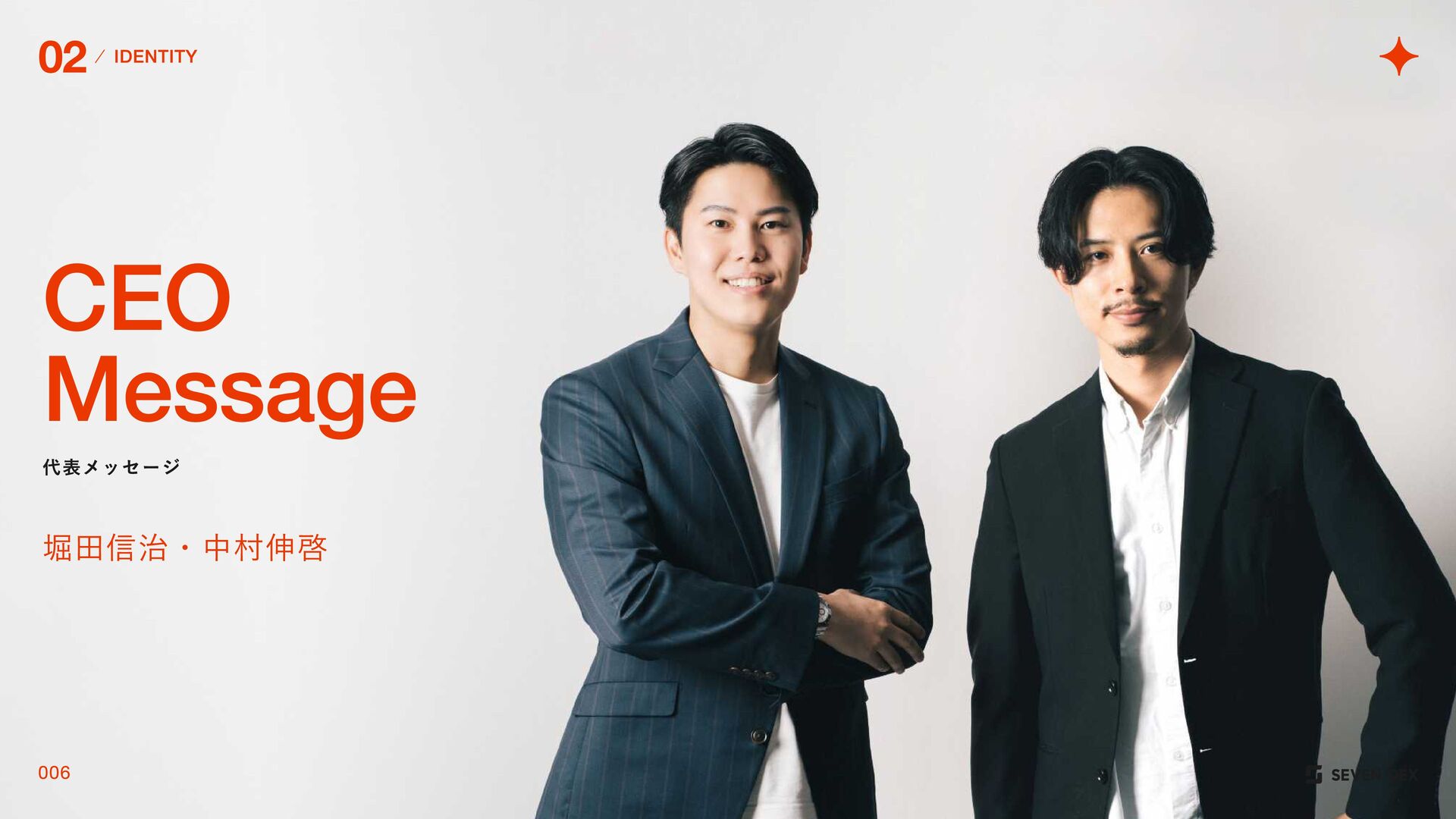 経済、企業、事業、サービス、組織、日本にはまだまだリデザインすべ きものが沢山あります。ありとあらゆる産業のアップデートに貢献し、日 本の経済シーンをデザインすること。 恵まれたこの世界に生まれた私たちだからこそ、より世界を前進させる 方法を考え、より良い時代に進めなければいけない。 CEO Message Identity 02 007
