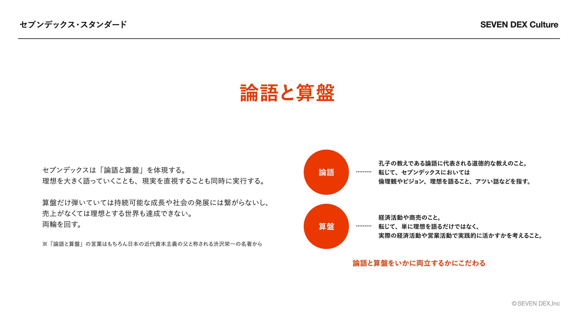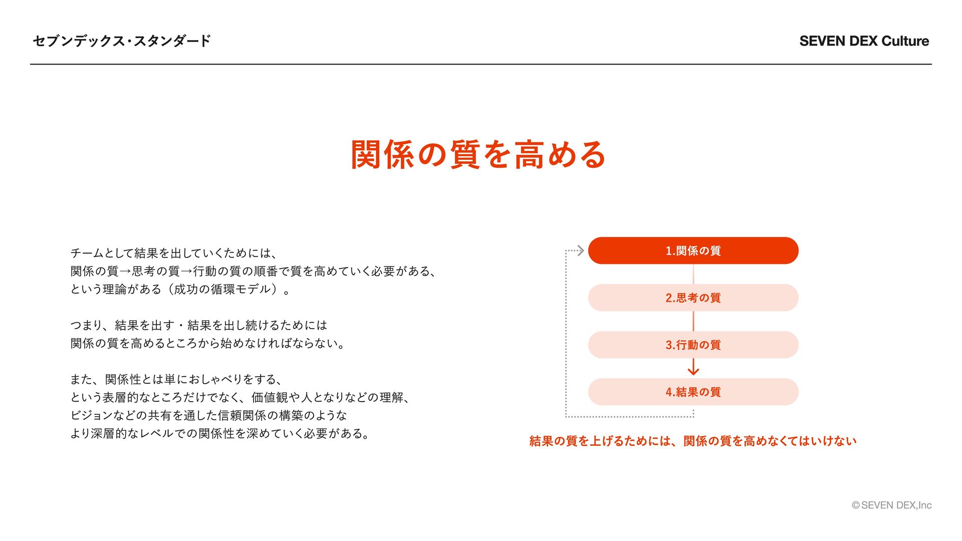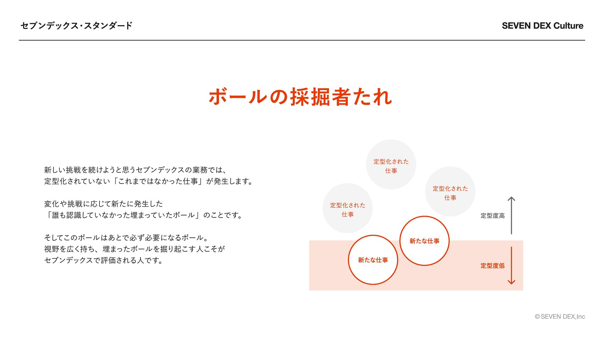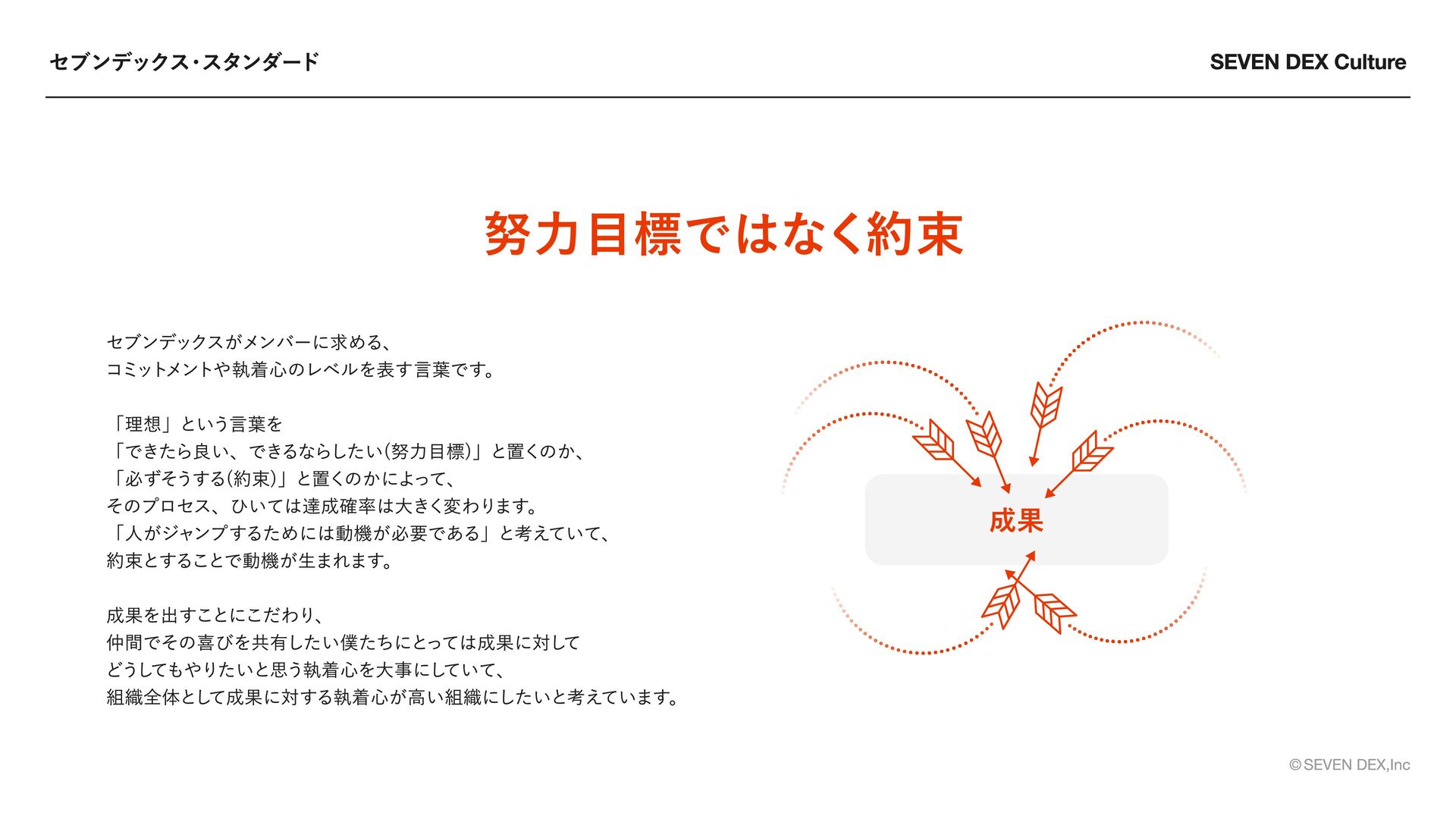 One Team Fact Base 全員が主役であれ 常識を壊し続けろ 本気で向き合う チームで勝ち切れ 事実から考え抜け ・スターとしての基準を持つ ・自ら考え行動する ・成果と価値に責任を持つ ・新しい価値のため常識を壊す ・想像を超える発想で感動を生む ・「普通」を疑い進化を選ぶ ・すべてに本気で向き合う ・大胆な方針で挑戦を導く ・情熱で人を巻き込む ・役割を超え成果最大化に向かう ・情報を開き信頼を築く ・全員が推進者として動く ・主観と事実を分けて考える ・根拠起点で判断する ・問いに正面から向き合う セブンデックスのメンバーが「大切にする姿勢・あり方
