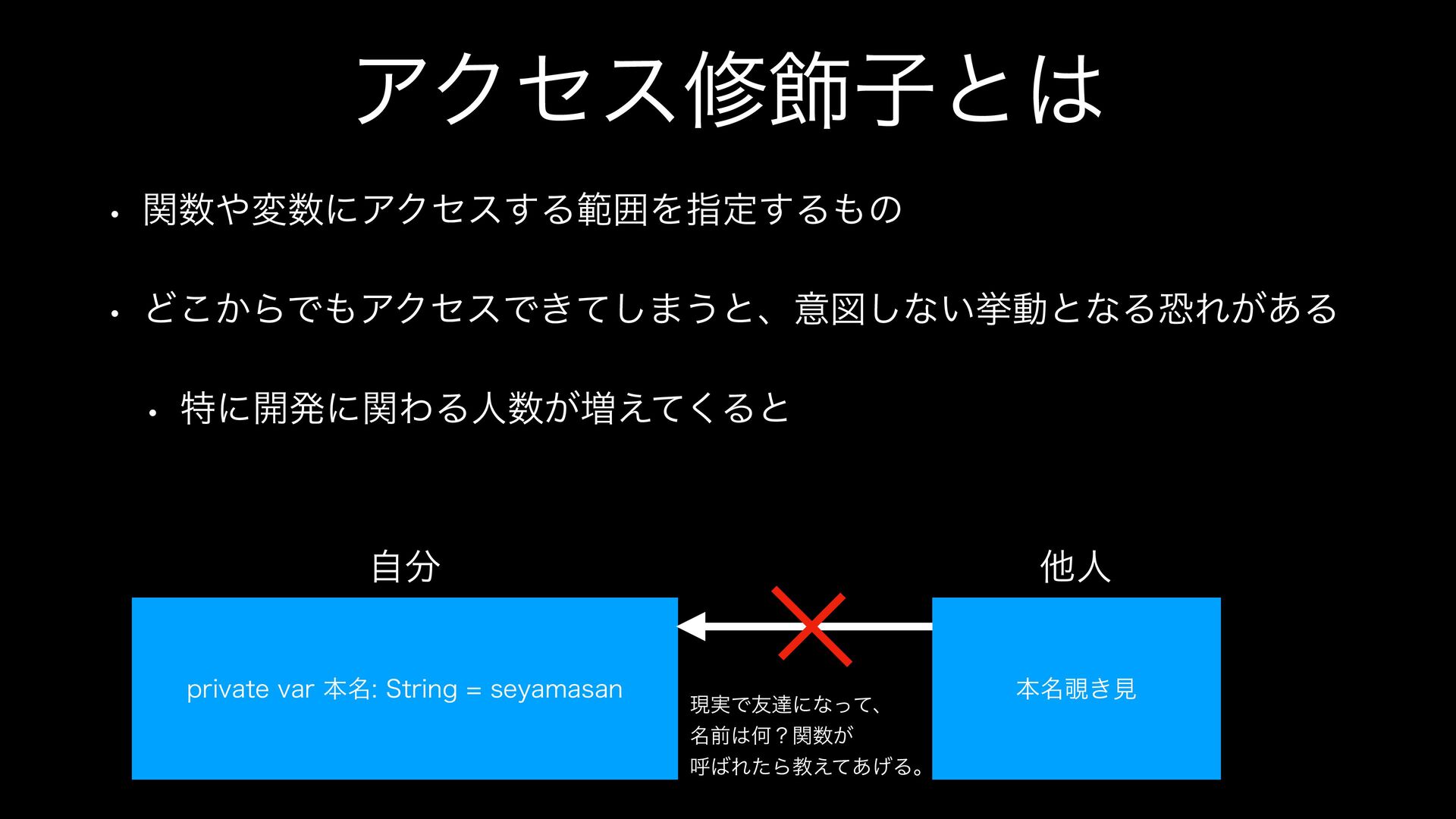 ΞΫηεम০ࢠͱ w ؔมʹΞΫηε͢ΔൣғΛࢦఆ͢Δͷ w Ͳ͔͜ΒͰΞΫηεͰ͖ͯ͠·͏ͱɺҙਤ͠ͳ͍ڍಈͱͳΔڪΕ͕͋Δ w ಛʹ։ൃʹؔΘΔਓ͕૿͑ͯ͘Δͱ QSJWBUFWBSຊ໊4USJOHTFZBNBTBO ຊ໊͖ݟ ࣗ