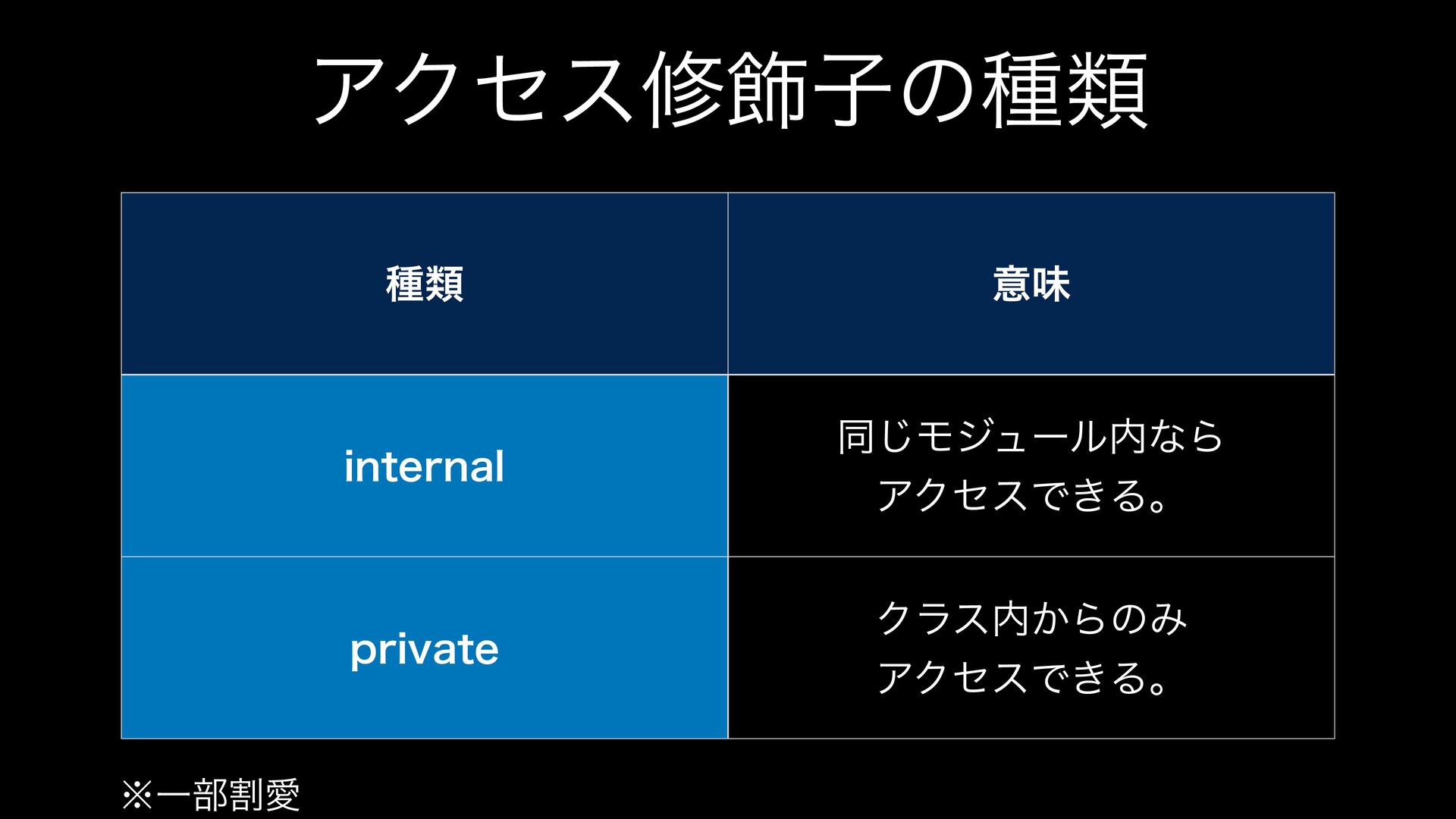 ΞΫηεम০ࢠͷछྨ छྨ ҙຯ JOUFSOBM ಉ͡ϞδϡʔϧͳΒ ΞΫηεͰ͖Δɻ QSJWBUF Ϋϥε͔ΒͷΈ ΞΫηεͰ͖Δɻ ˞Ұ෦ׂѪ