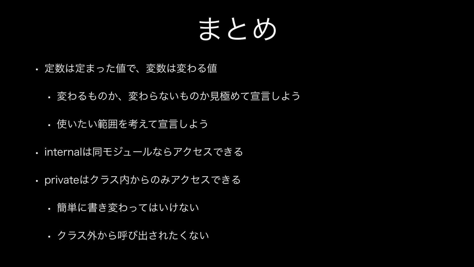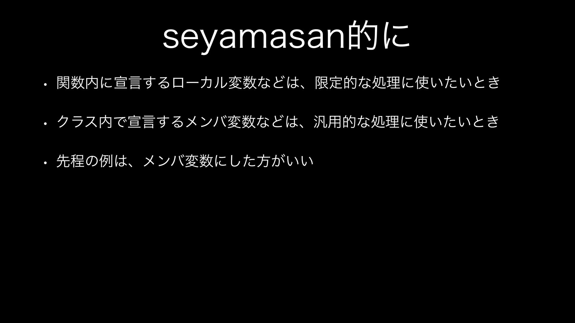 TFZBNBTBOతʹ w ؔʹએݴ͢ΔϩʔΧϧมͳͲɺݶఆతͳॲཧʹ͍͍ͨͱ͖ w ΫϥεͰએݴ͢ΔϝϯόมͳͲɺ൚༻తͳॲཧʹ͍͍ͨͱ͖ w ઌఔͷྫɺϝϯόมʹͨ͠ํ͕͍͍