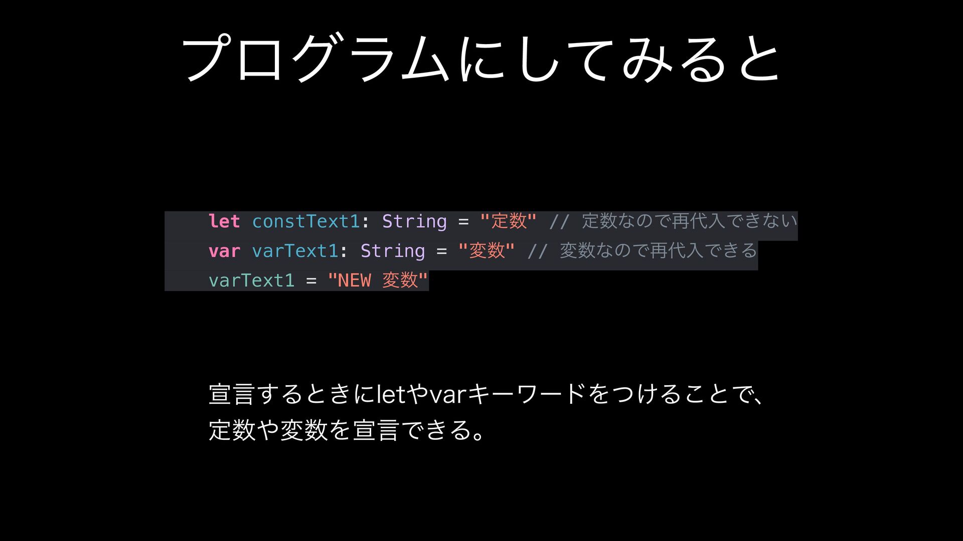 String = "ม" // มͳͷͰ࠶ೖͰ͖Δ varText1 = "NEW ม" એݴ͢Δͱ͖ʹMFUWBSΩʔϫʔυΛ͚ͭΔ͜ͱͰɺ ఆมΛએݴͰ͖Δɻ