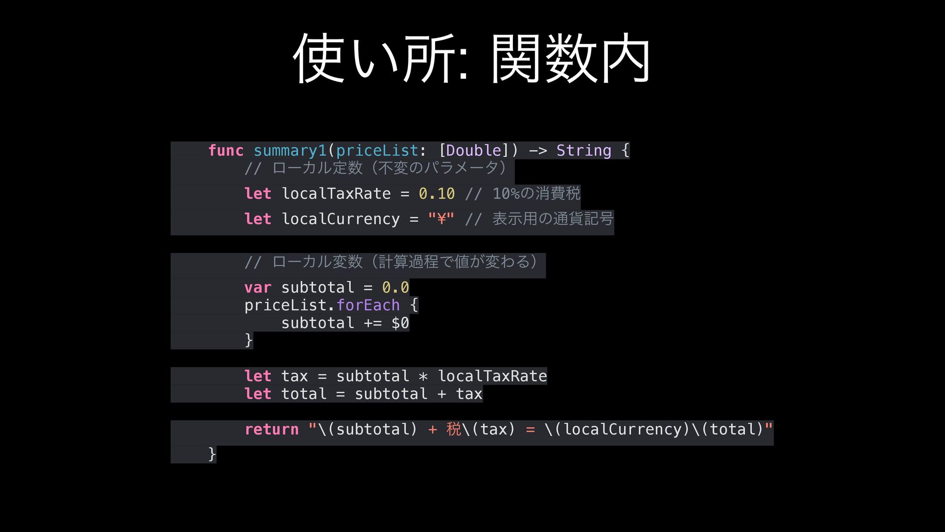 localTaxRate = 0.10 // 10%ͷফඅ੫ let localCurrency = "¥" // දࣔ༻ͷ௨՟ه߸ // ϩʔΧϧมʢܭࢉաఔͰ͕มΘΔʣ var subtotal = 0.0 priceList.forEach { subtotal += $0 } let tax = subtotal * localTaxRate let total = subtotal + tax return "\(subtotal) + ੫\(tax) = \(localCurrency)\(total)" }
