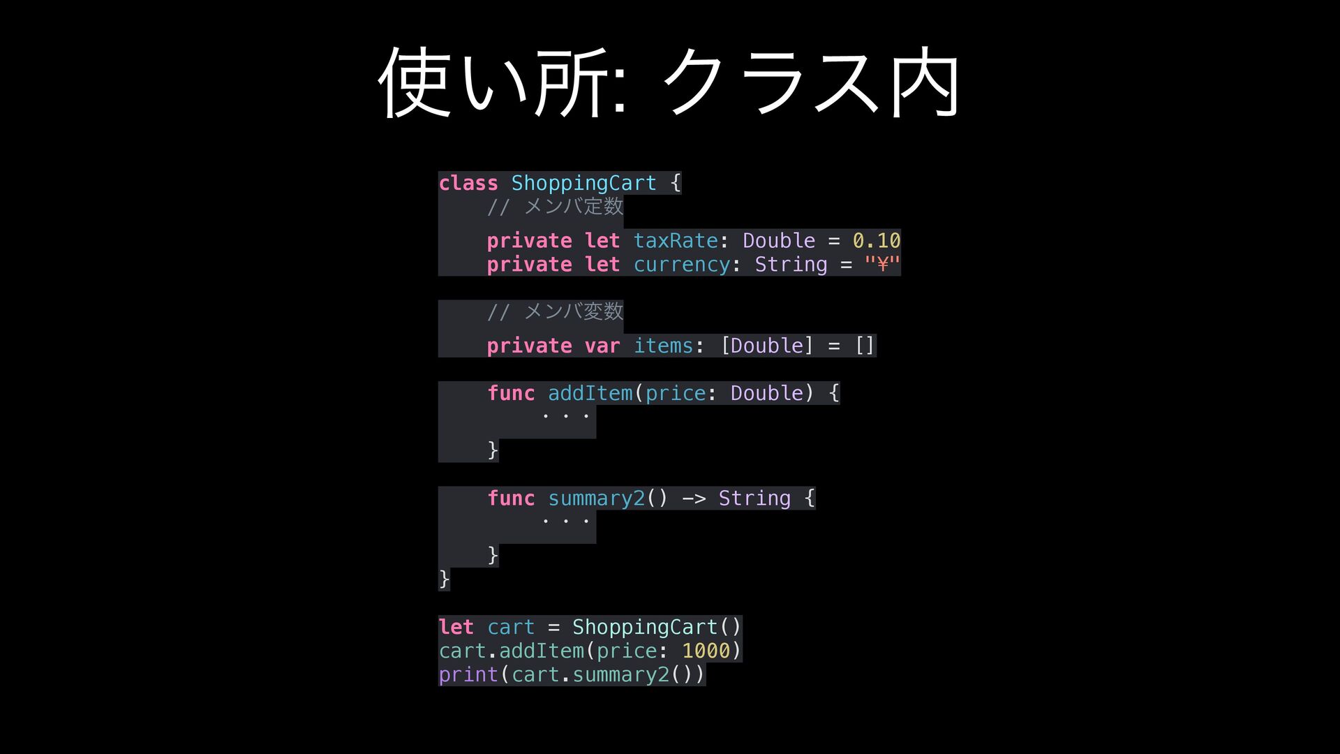 = 0.10 private let currency: String = "¥" // ϝϯόม private var items: [Double] = [] func addItem(price: Double) { ɾɾɾ } func summary2() -> String { ɾɾɾ } } let cart = ShoppingCart() cart.addItem(price: 1000) print(cart.summary2())