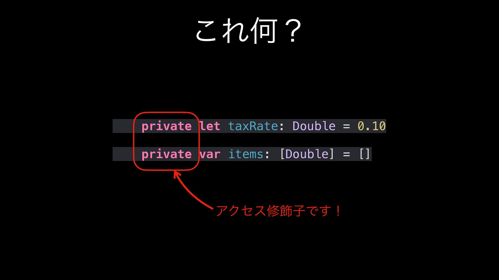 Swift言語を使って、定数と変数やアクセス修飾子について紹介しています。