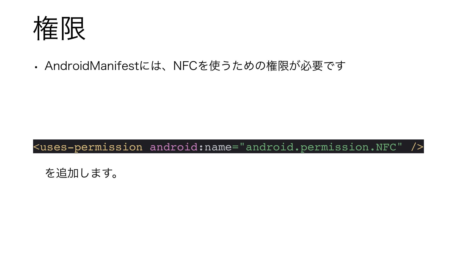 ݖݶ w "OESPJE.BOJGFTUʹɺ/'$Λ͏ͨΊͷݖݶ͕ඞཁͰ͢ <uses-permission android:name="android.permission.NFC" /> ΛՃ͠·͢ɻ