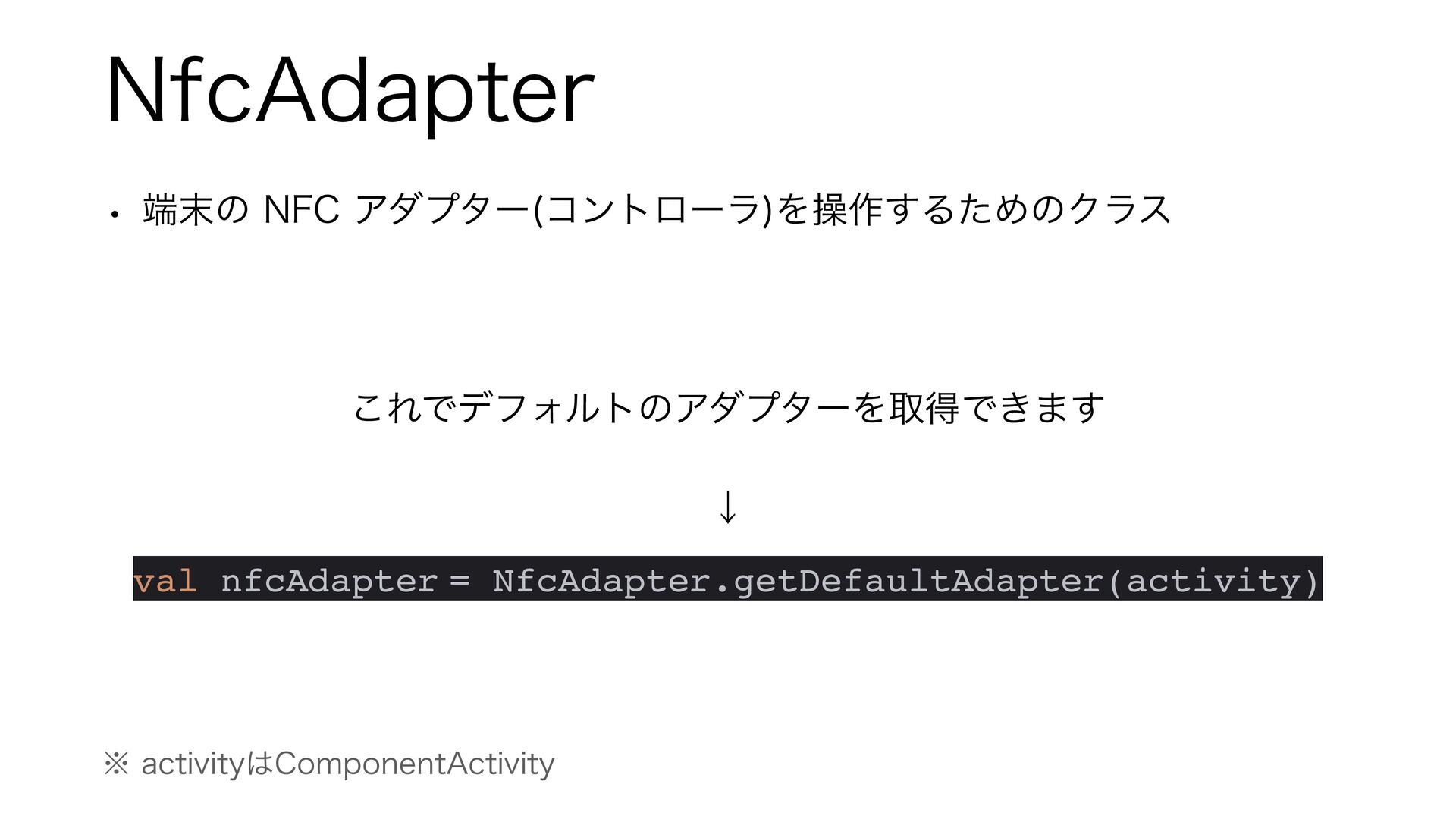 /GD"EBQUFS w ͷ/'$Ξμϓλʔ ίϯτϩʔϥ Λૢ࡞͢ΔͨΊͷΫϥε ͜ΕͰσϑΥϧτͷΞμϓλʔΛऔಘͰ͖·͢ ˣ val nfcAdapter =