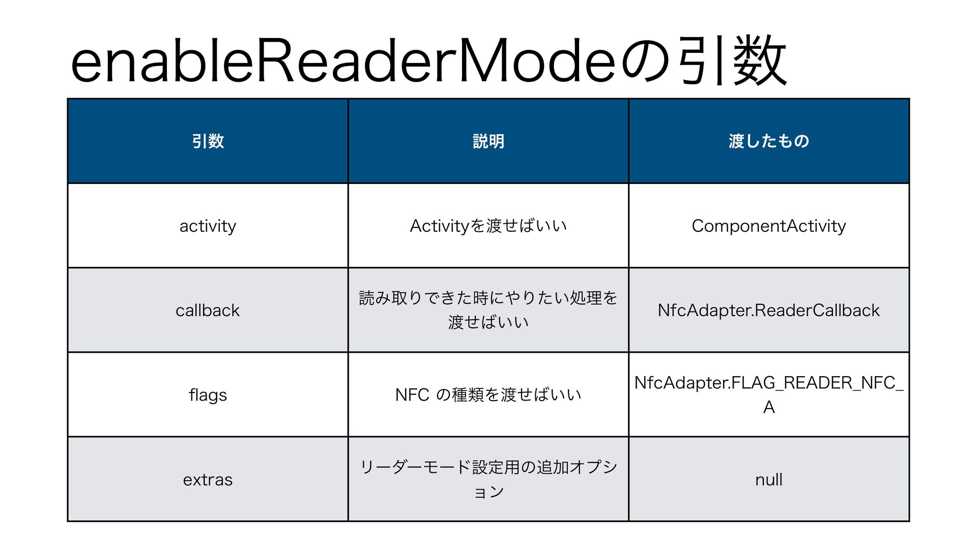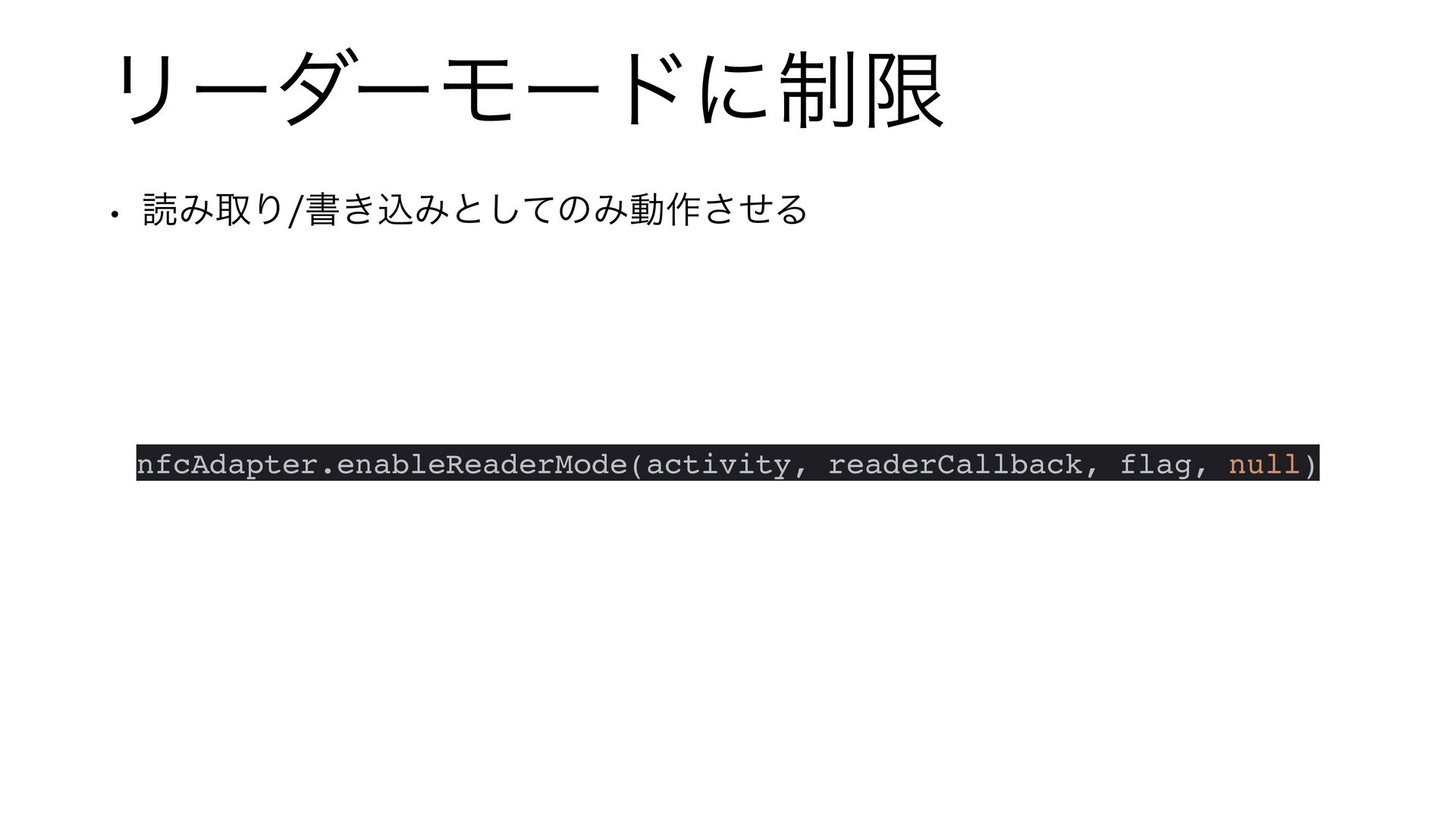 ϦʔμʔϞʔυʹ੍ݶ w ಡΈऔΓॻ͖ࠐΈͱͯ͠ͷΈಈ࡞ͤ͞Δ nfcAdapter.enableReaderMode(activity, readerCallback, flag, null)