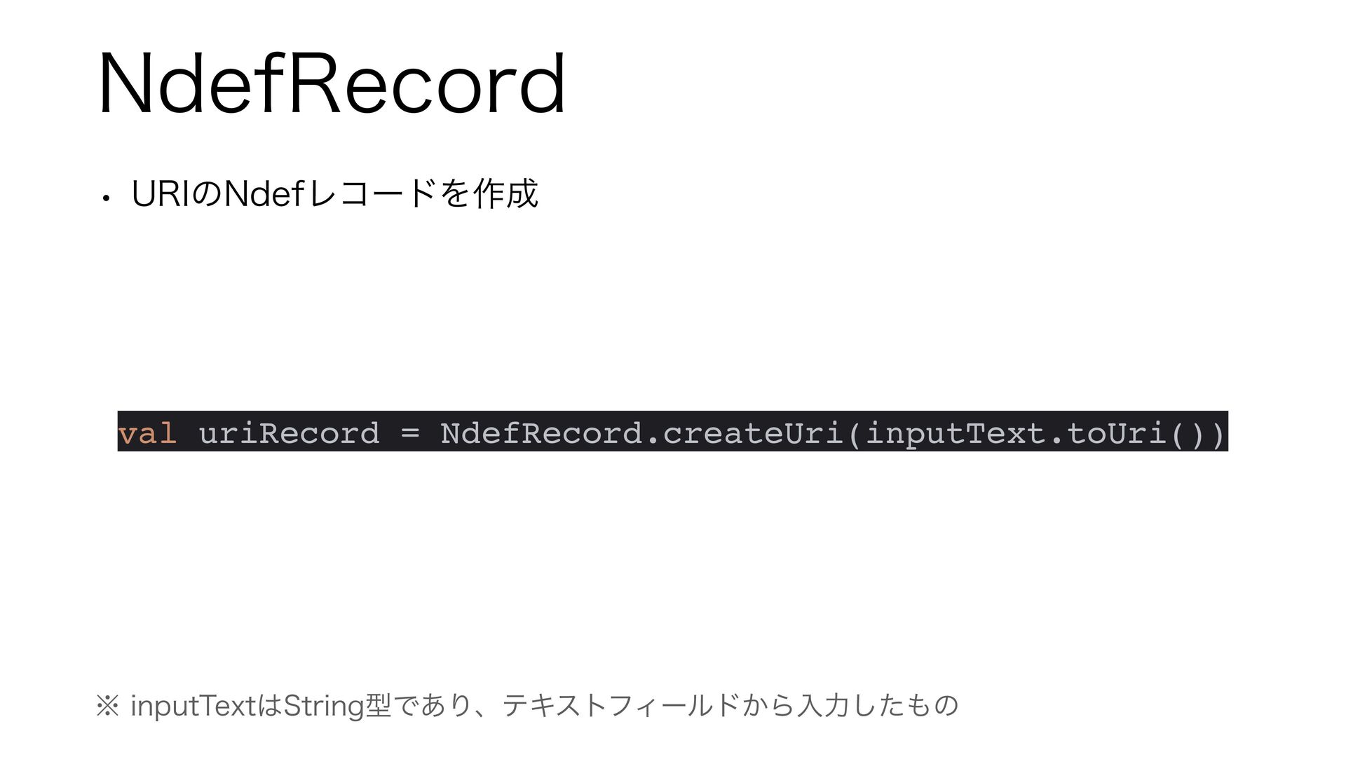 /EFG3FDPSE w 63*ͷ/EFGϨίʔυΛ࡞ val uriRecord = NdefRecord.createUri(inputText.toUri()) ˞JOQVU5FYU4USJOHܕͰ͋ΓɺςΩετϑΟʔϧυ͔Βೖྗͨ͠ͷ