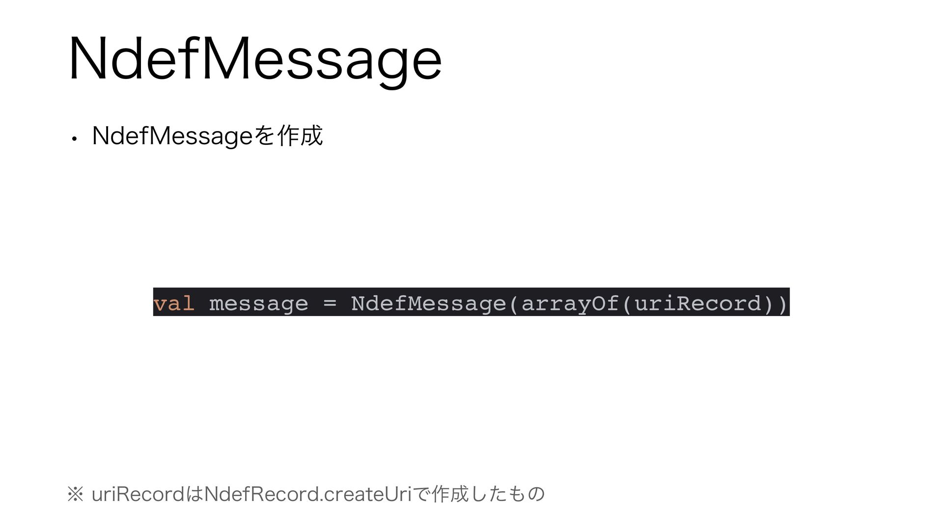 /EFG.FTTBHF w /EFG.FTTBHFΛ࡞ val message = NdefMessage(arrayOf(uriRecord)) ˞VSJ3FDPSE/EFG3FDPSEDSFBUF6SJͰ࡞ͨ͠ͷ