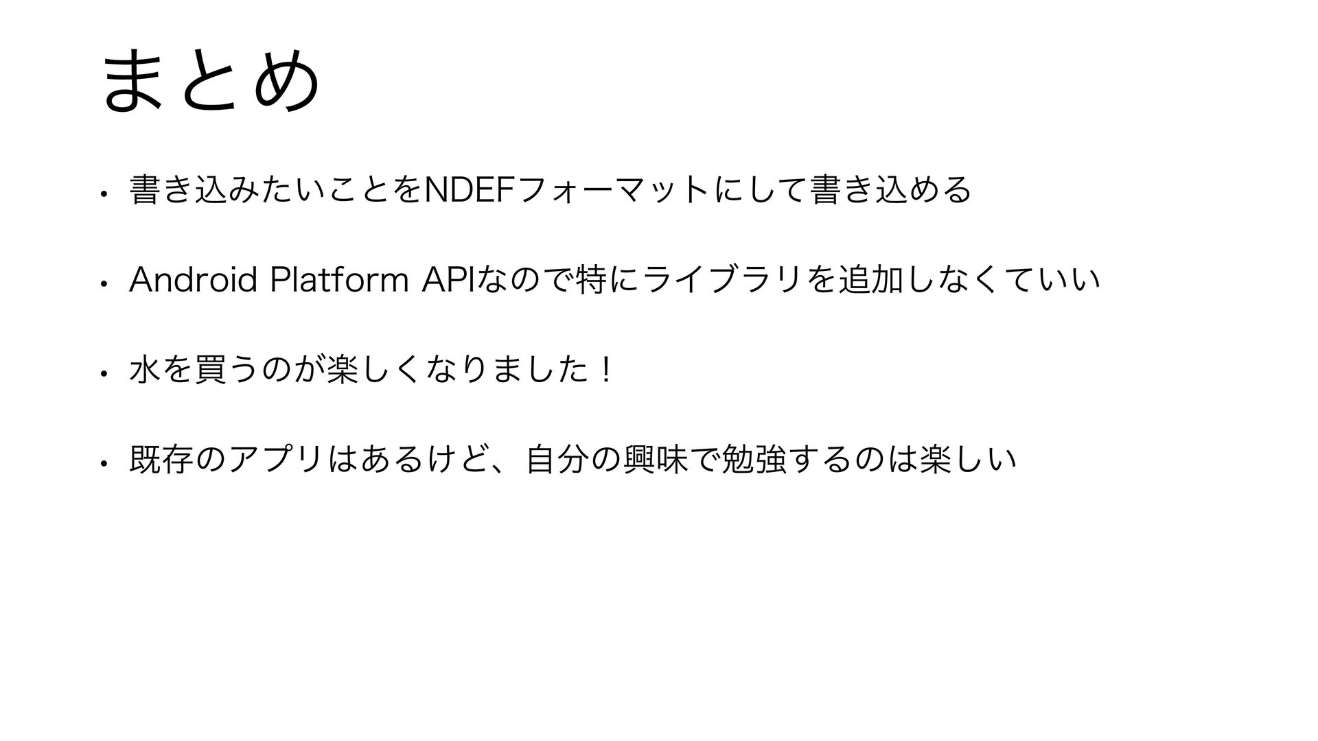 ·ͱΊ w ॻ͖ࠐΈ͍ͨ͜ͱΛ/%&'ϑΥʔϚοτʹͯ͠ॻ͖ࠐΊΔ w "OESPJE1MBUGPSN"1*ͳͷͰಛʹϥΠϒϥϦΛՃ͠ͳ͍͍ͯ͘ w ਫΛങ͏ͷָ͕͘͠ͳΓ·ͨ͠ʂ w طଘͷΞϓϦ͋Δ͚ͲɺࣗͷڵຯͰษڧ͢Δͷָ͍͠