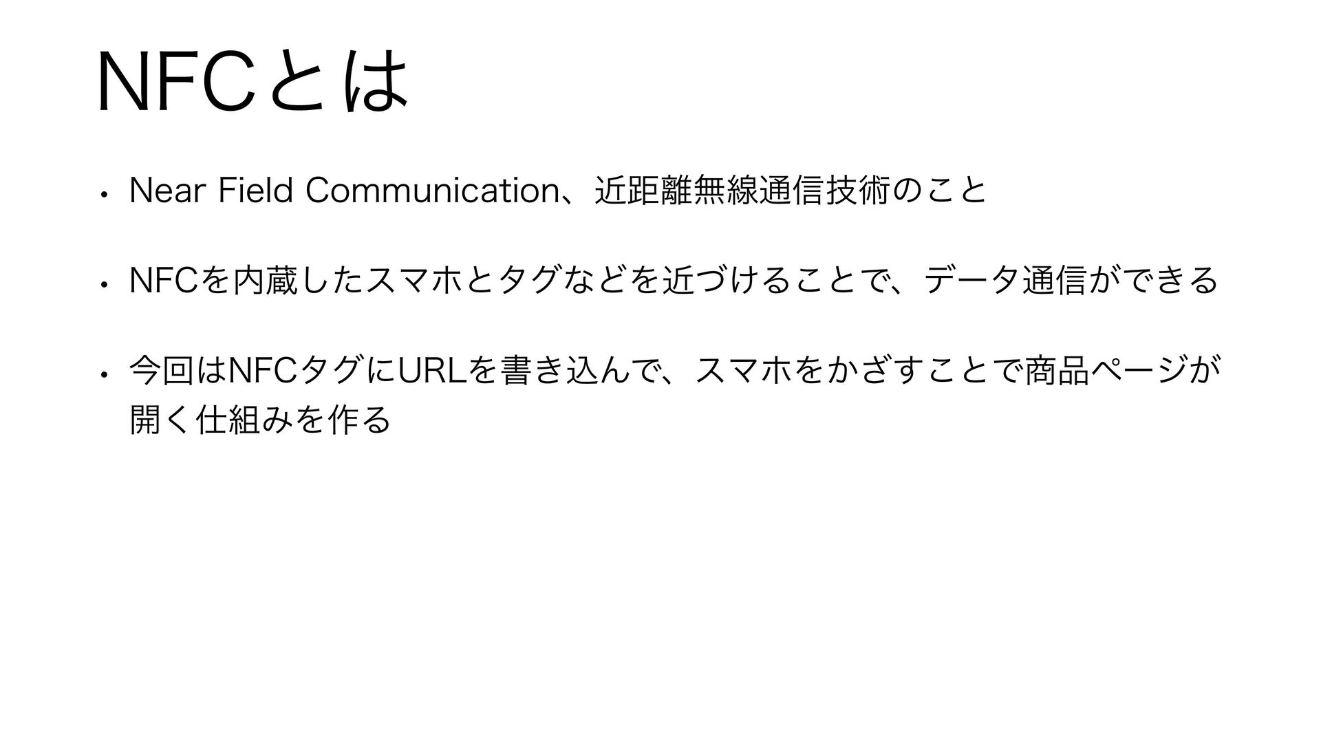 /'$ͱ w /FBS'JFME$PNNVOJDBUJPOɺۙڑແઢ௨৴ٕज़ͷ͜ͱ w /'$Λଂͨ͠εϚϗͱλάͳͲΛ͚ۙͮΔ͜ͱͰɺσʔλ௨৴͕Ͱ͖Δ w ࠓճ/'$λάʹ63-Λॻ͖ࠐΜͰɺεϚϗΛ͔͟͢͜ͱͰϖʔδ͕ ։͘ΈΛ࡞Δ