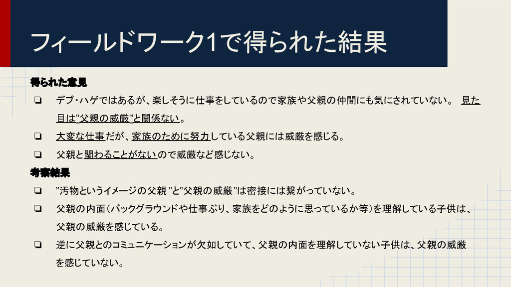 フィールドワーク2で得られた結果 得られた意見 ❏ 威厳のためには家族とのコミュニケーションが必要。 ❏ 父の病気がきっかけで父のことを知り、父親には威厳を感じる。 ❏ 仕事に対してストイックな姿を幼いころから見てきて威厳を感じる。 考察結果 ❏
