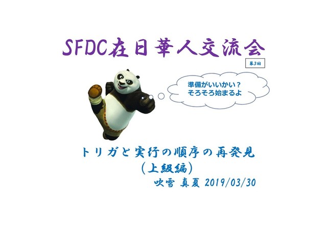 SFDC在日華人交流会 トリガと実行の順序の再発見 (上級編) 吹雪 真夏 2019/03/30 準備がいいかい? そろそろ始まるよ 第3回