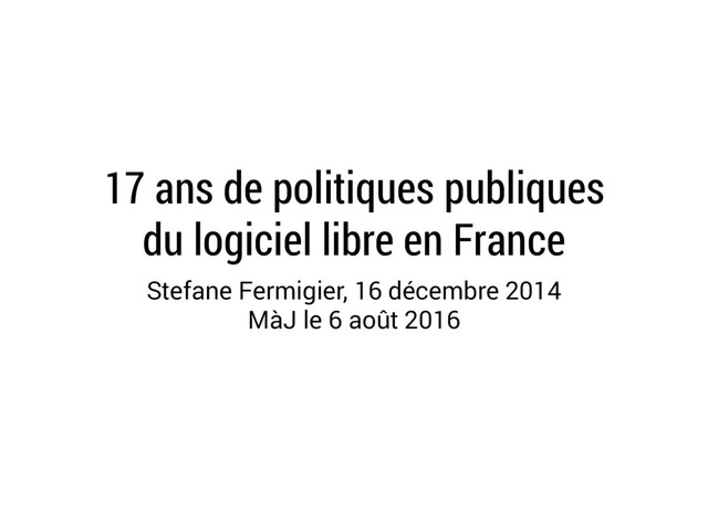 Une présentation sur les politiques publiques du logiciel libre en France depuis la fin des années 90, que j'ai faite en décembre 2014 lors d'un séminaire dédié aux collectivités territoriales, mise à jour avec les éléments de ces deux dernières années.