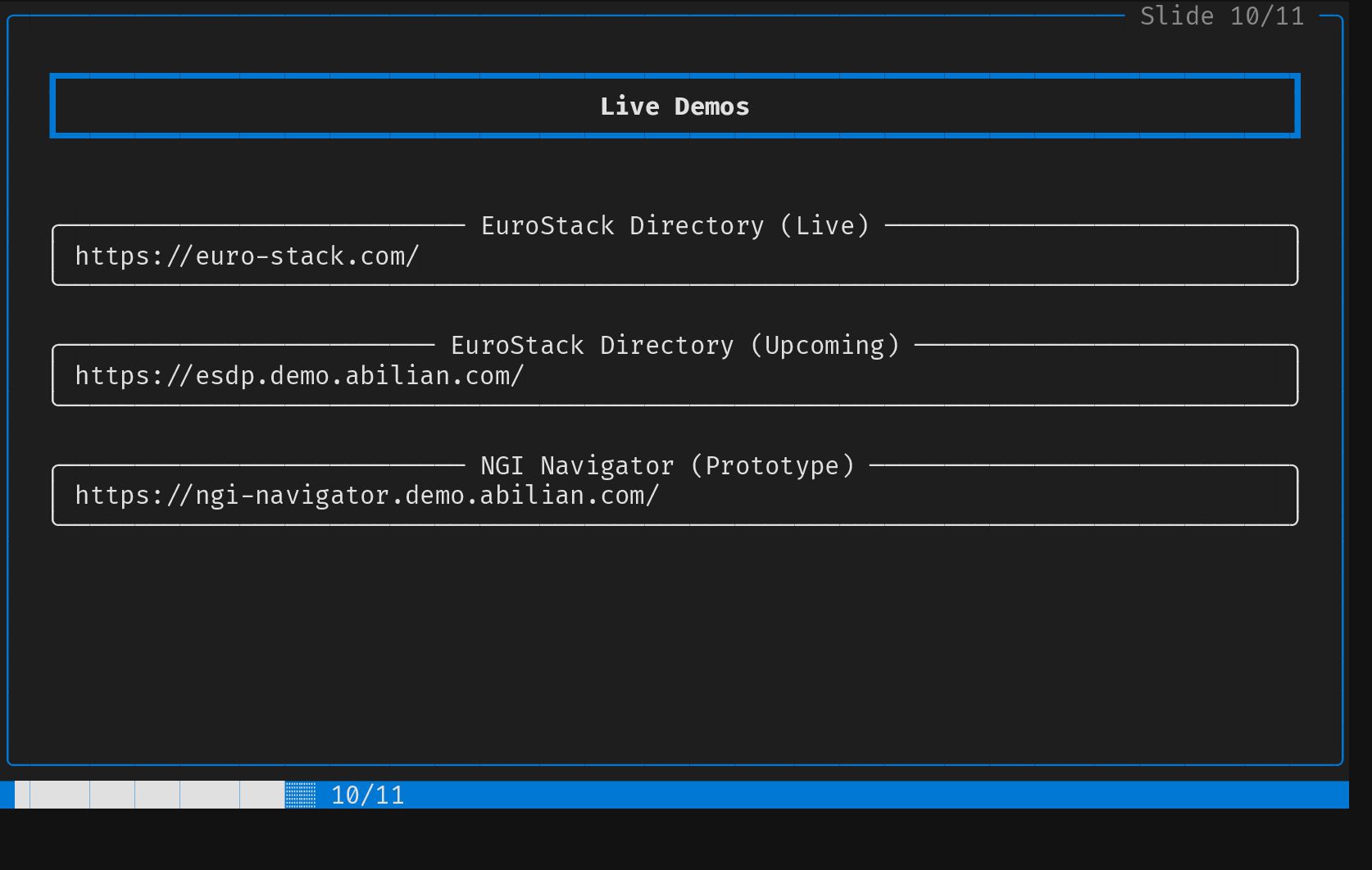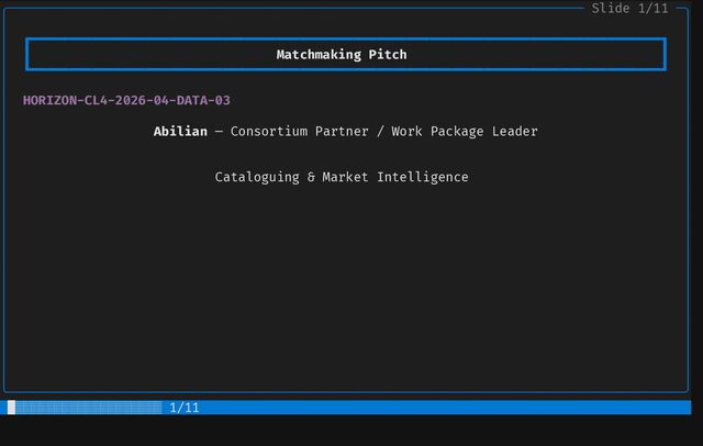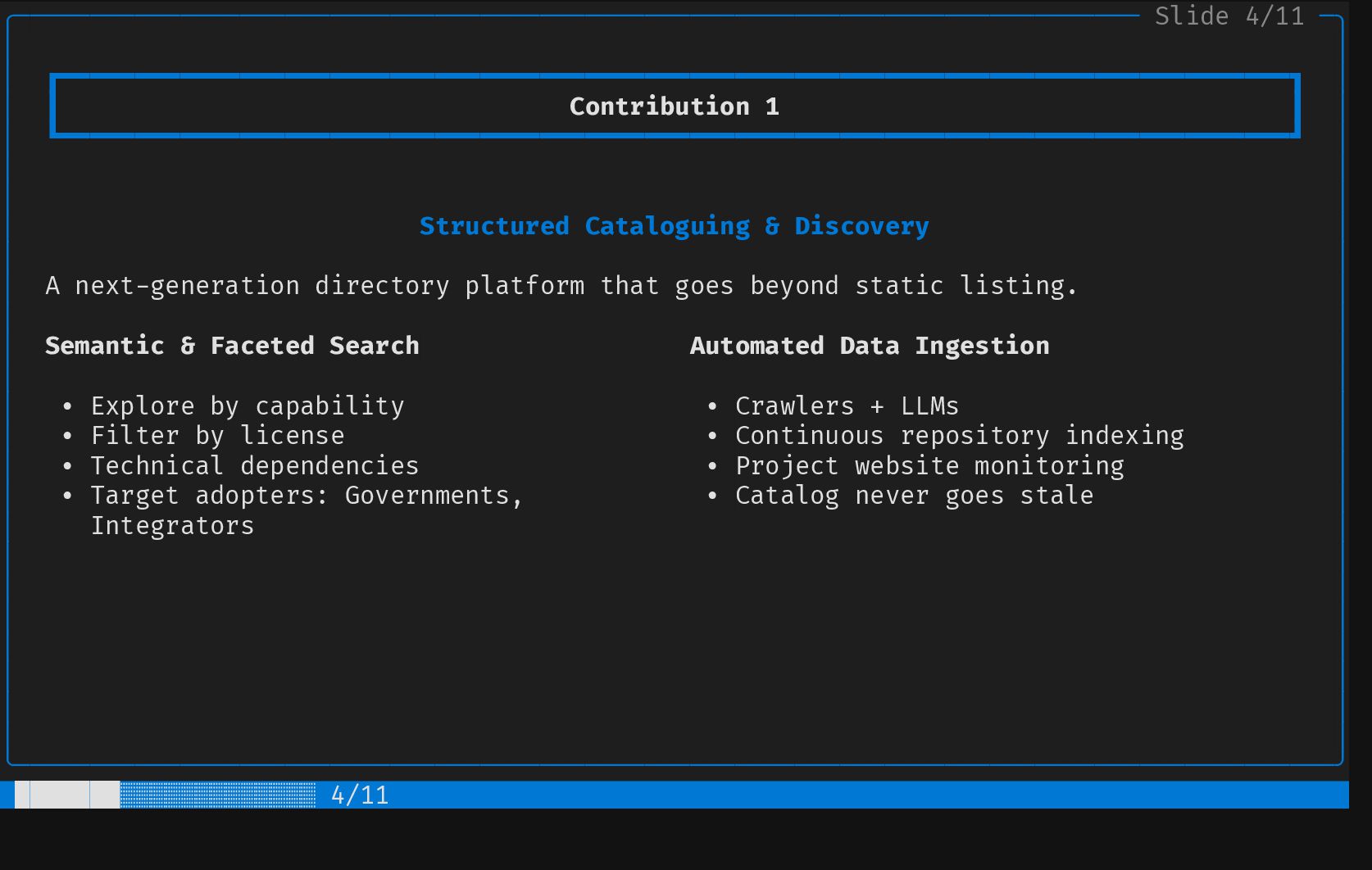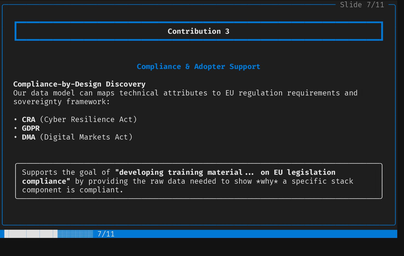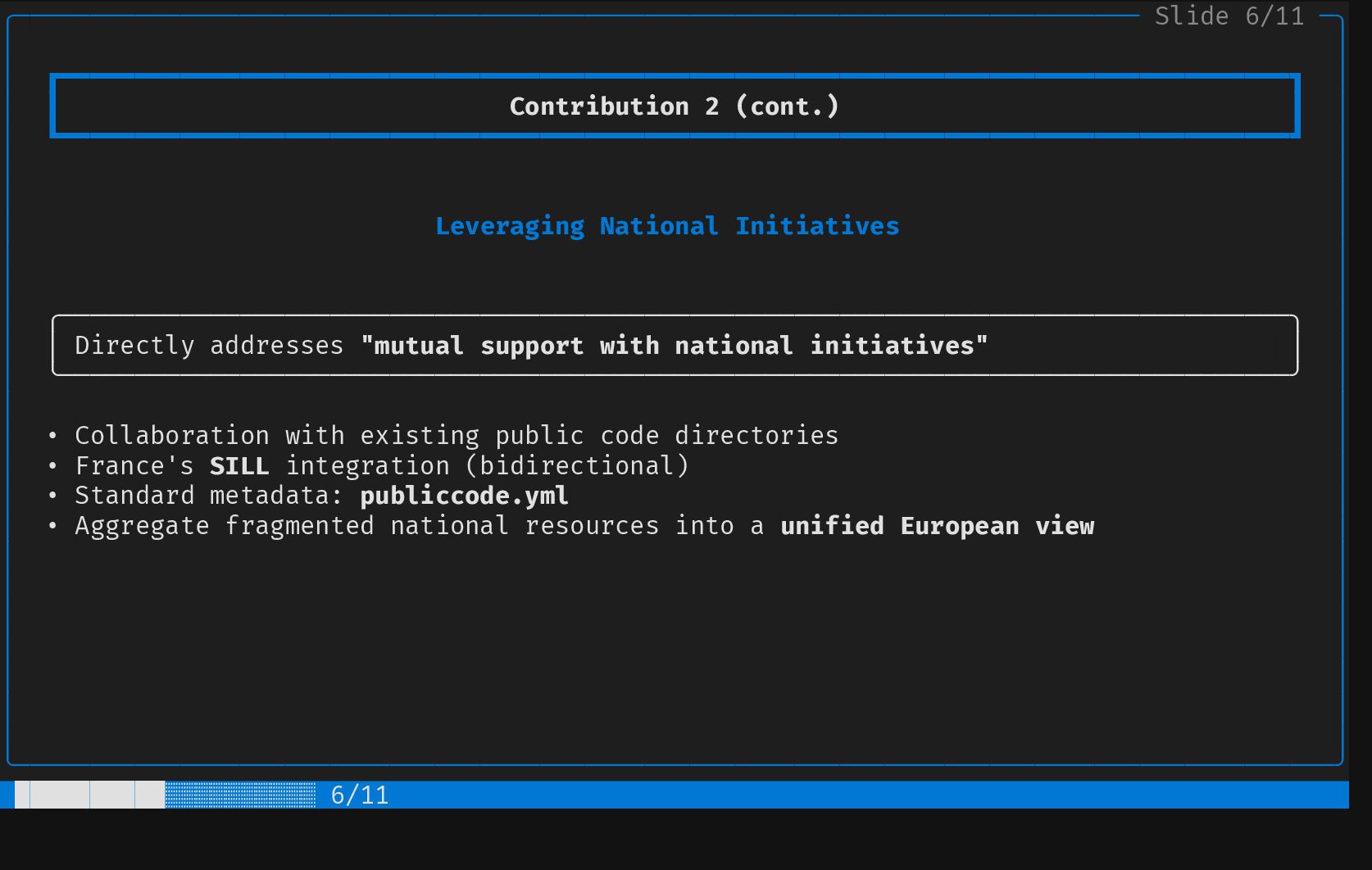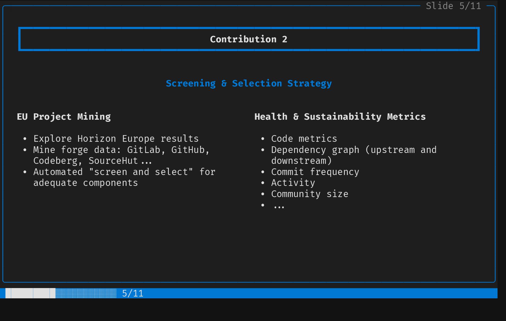 ┃ Contribution 2 ┃ │ │ ┗━━━━━━━━━━━━━━━━━━━━━━━━━━━━━━━━━━━━━━━━━━━━━━━━━━━━━━━━━━━━━━━━━━━━━━━━━━━━━━━━━━┛ │ │ │ │ │ │ Screening & Selection Strategy │ │ │ │ │ │ EU Project Mining Health & Sustainability Metrics │ │ │ │ • Explore Horizon Europe results • Code metrics │ │ • Mine forge data: GitLab, GitHub, • Dependency graph (upstream and │ │ Codeberg, SourceHut... downstream) │ │ • Automated "screen and select" for • Commit frequency │ │ adequate components • Activity │ │ • Community size │ │ • ... │ │ │ │ │ │ │ │ │ │ │ │ │ ╰────────────────────────────────────────────────────────────────────────────────────────╯ █████████░░░░░░░░░░░ 5/11