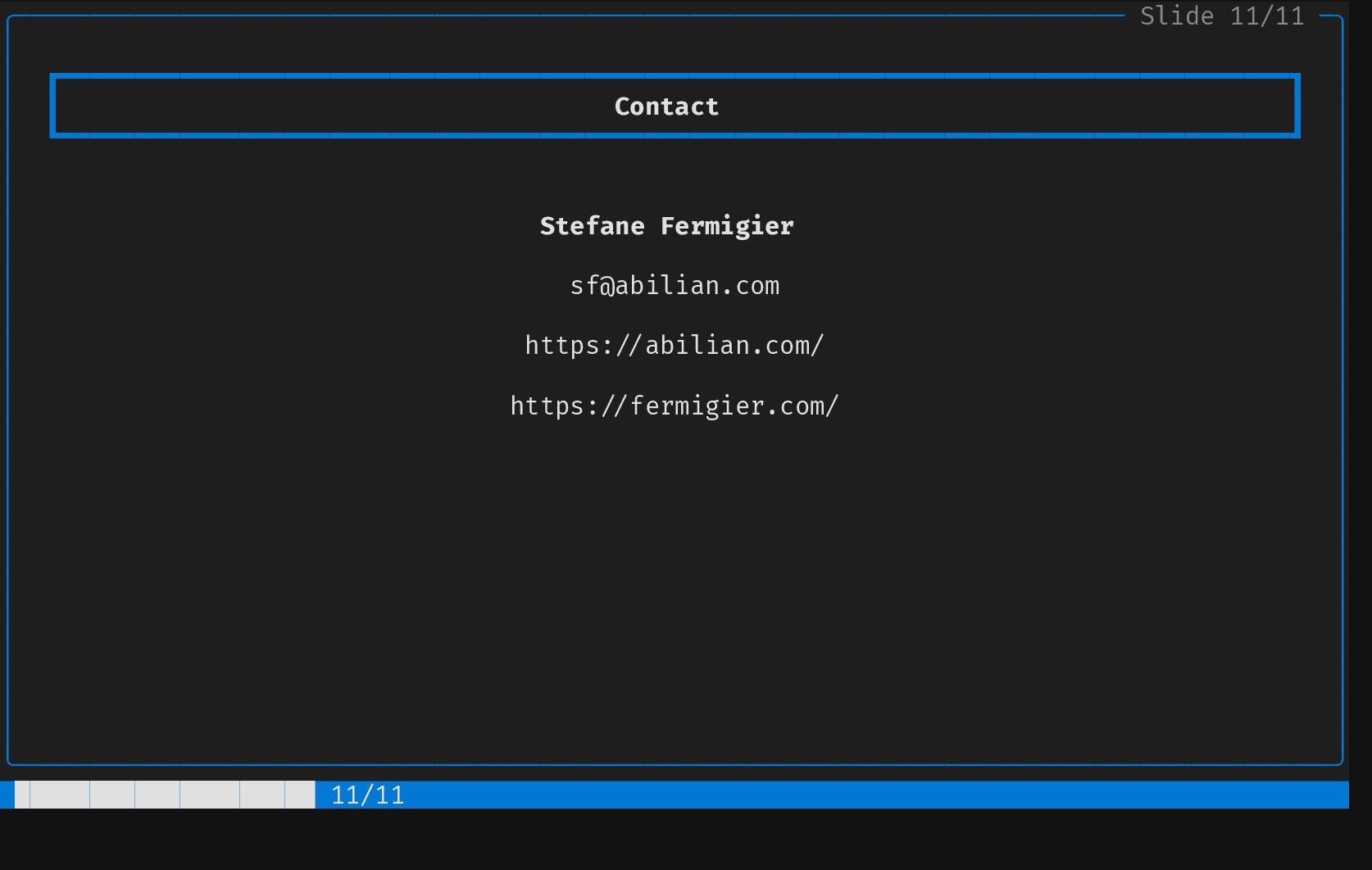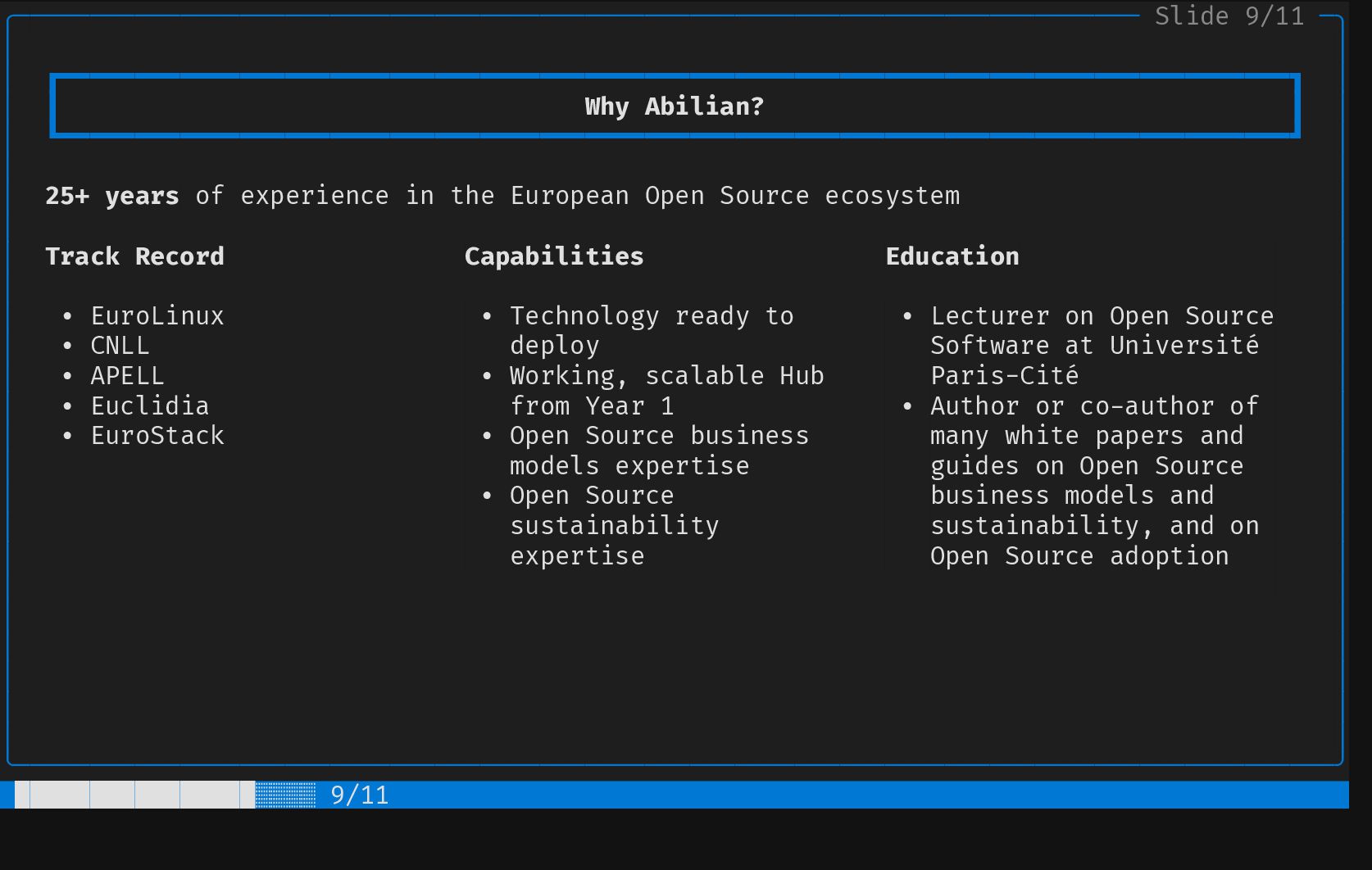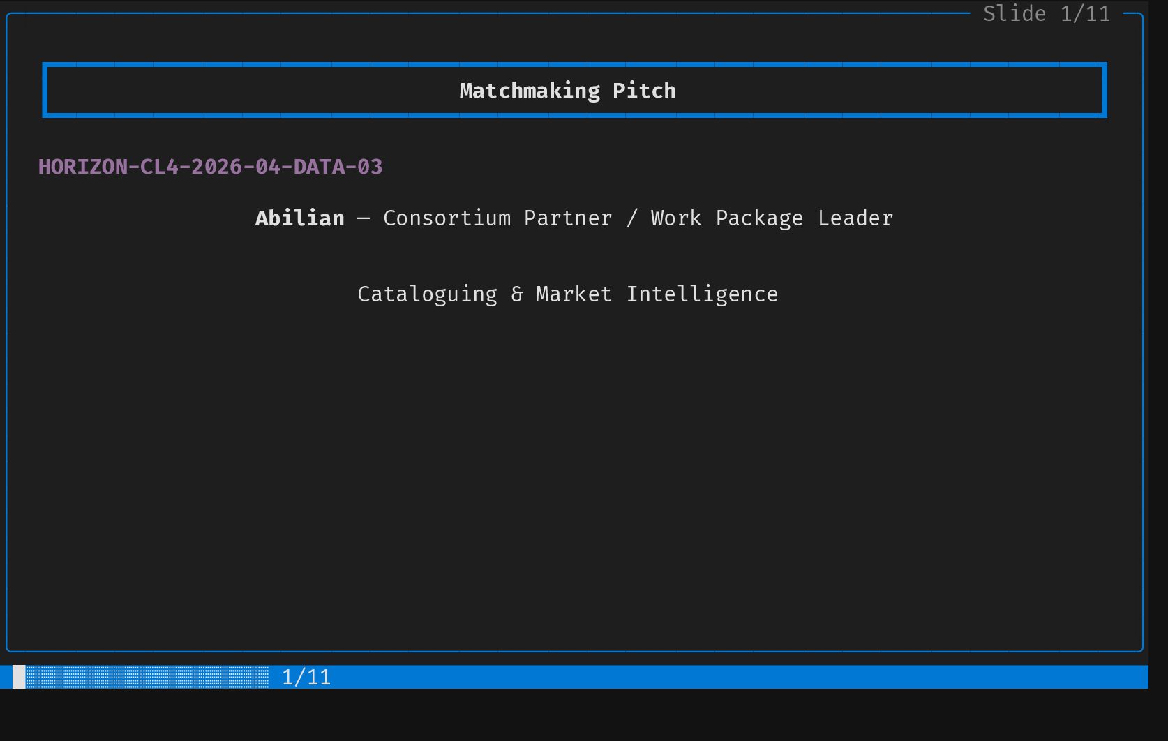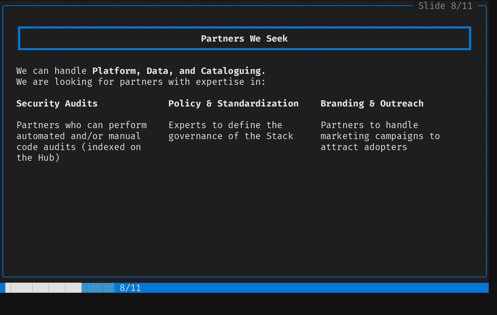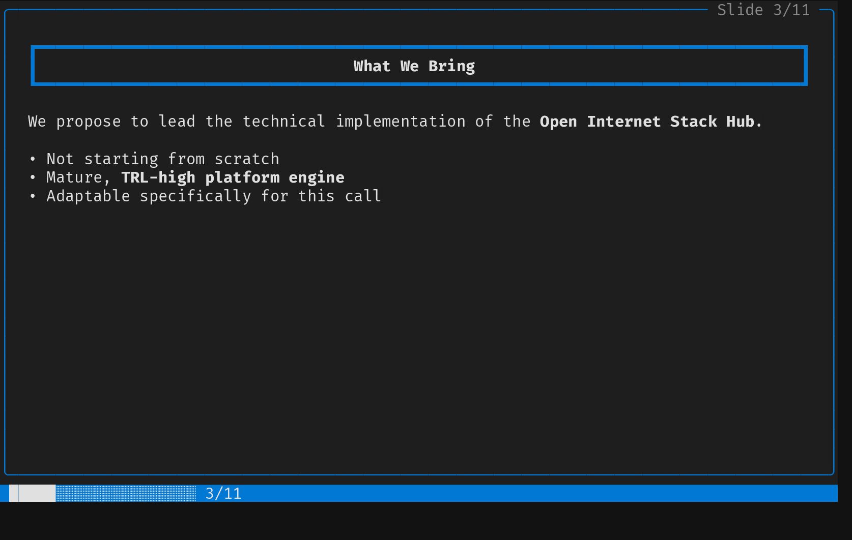 ┃ Contribution 2 ┃ │ │ ┗━━━━━━━━━━━━━━━━━━━━━━━━━━━━━━━━━━━━━━━━━━━━━━━━━━━━━━━━━━━━━━━━━━━━━━━━━━━━━━━━━━┛ │ │ │ │ │ │ Screening & Selection Strategy │ │ │ │ │ │ EU Project Mining Health & Sustainability Metrics │ │ │ │ • Explore Horizon Europe results • Code metrics │ │ • Mine forge data: GitLab, GitHub, • Dependency graph (upstream and │ │ Codeberg, SourceHut... downstream) │ │ • Automated "screen and select" for • Commit frequency │ │ adequate components • Activity │ │ • Community size │ │ • ... │ │ │ │ │ │ │ │ │ │ │ │ │ ╰────────────────────────────────────────────────────────────────────────────────────────╯ █████████░░░░░░░░░░░ 5/11