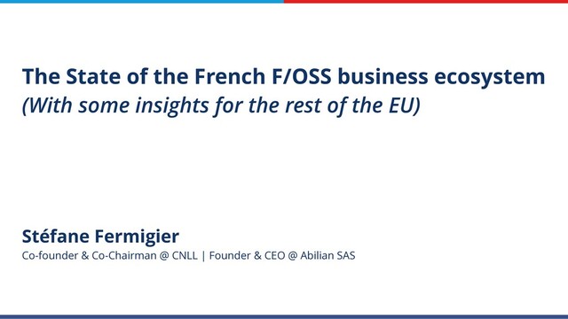 Aka “Conseil National du Logiciel Libre” (French Open Source Software Council) = French association, founded in 2010 by joining 12 regional clusters, representing around 300 companies in France Our mission : bring together open digital companies (“ENL”) in a spirit of community and around shared values; and represent, defend, and promote the free / open source software and open digital industry in France
