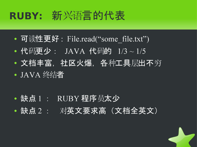• 代 更少: 码 JAVA 代 的 码 1/3 ~ 1/5 • 文档丰富,社区火爆,各 工具 出不 种 层 穷 • JAVA 者 终结 • 缺点 1 : RUBY 程序 太少 员 • 缺点 2 : 英文要求高(文档全英文) 对