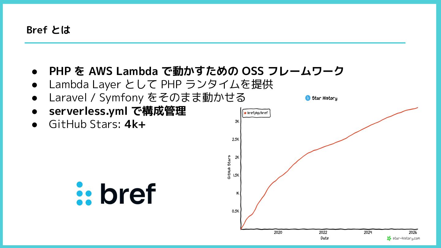 Layer として PHP ランタイムを提供 • Laravel / Symfony をそのまま動かせる • serverless.yml で構成管理 • GitHub Stars: 4k+ Bref とは