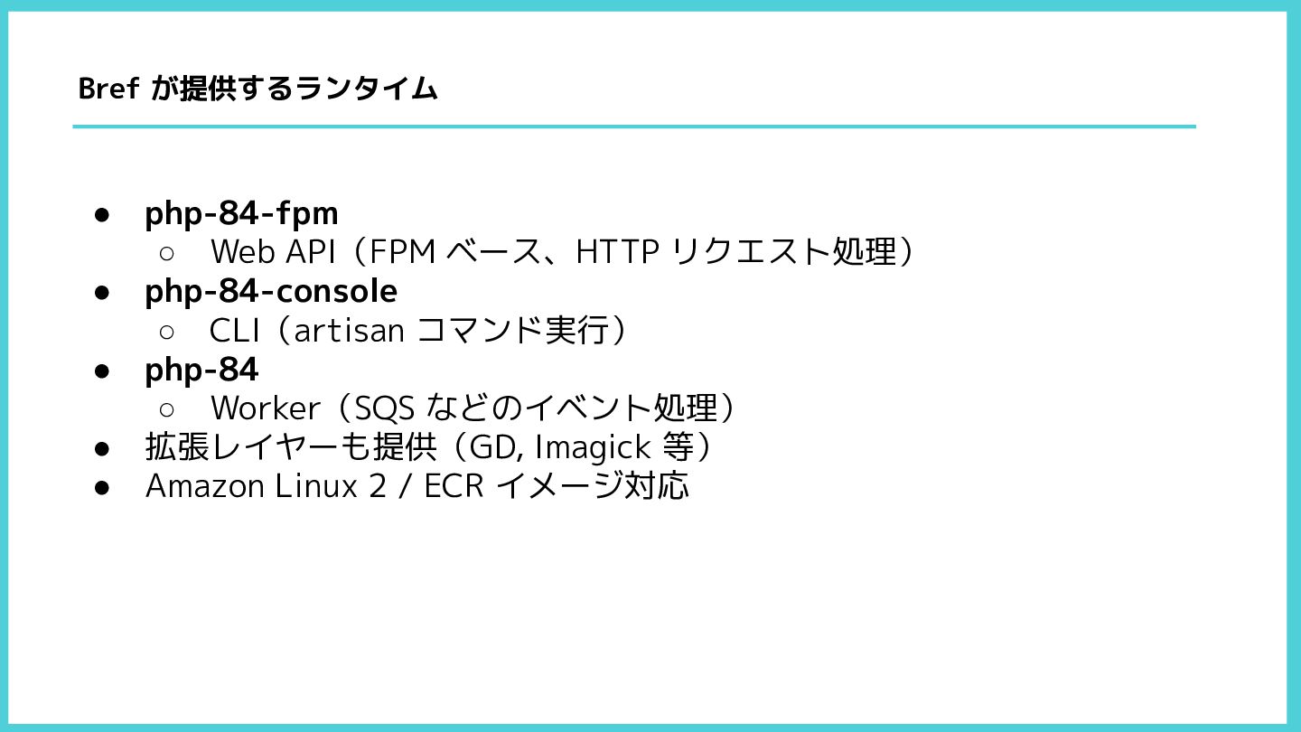 CLI(artisan コマンド実行) • php-84 ◦ Worker(SQS などのイベント処理) • 拡張レイヤーも提供(GD, Imagick 等) • Amazon Linux 2 / ECR イメージ対応 Bref が提供するランタイム