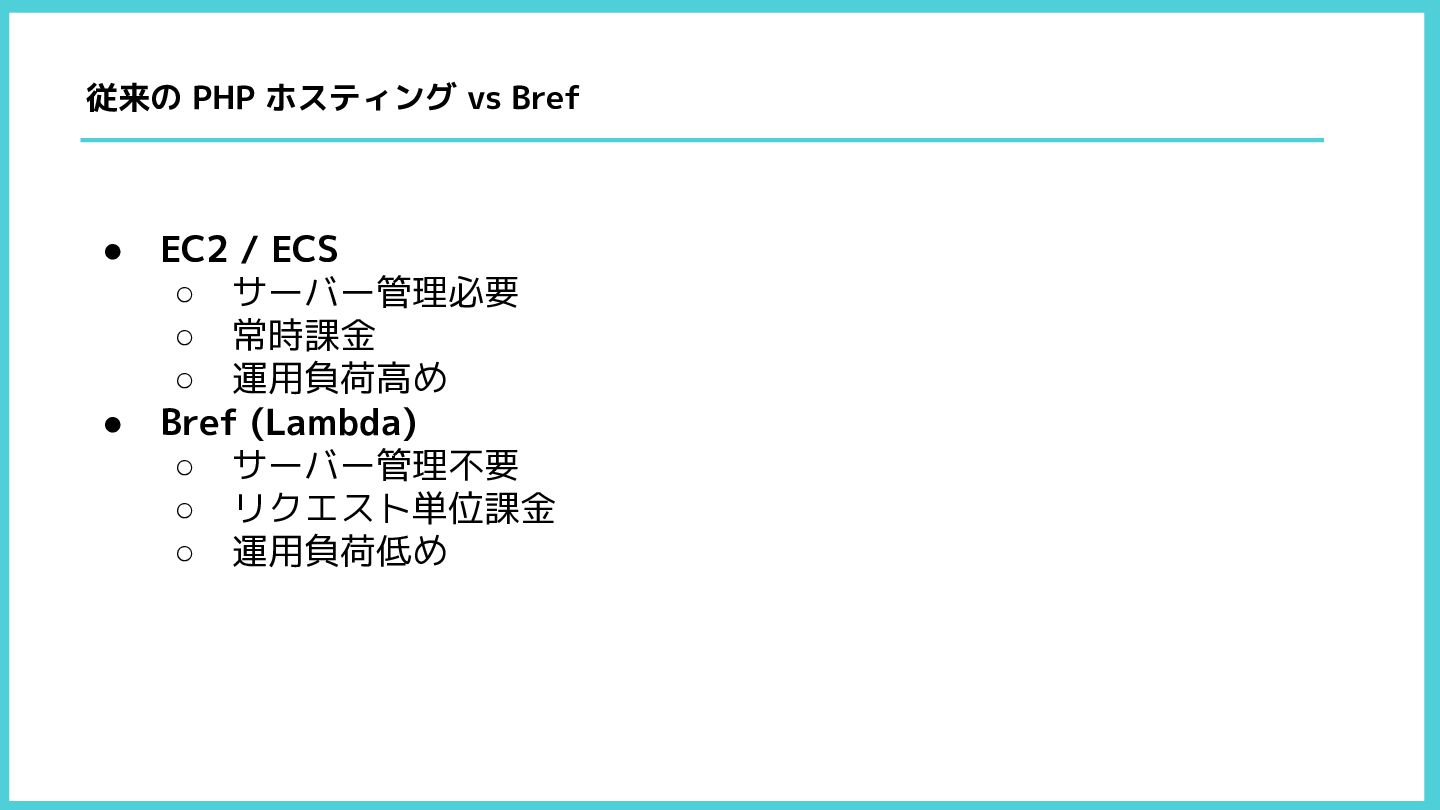 • Bref (Lambda) ◦ サーバー管理不要 ◦ リクエスト単位課金 ◦ 運用負荷低め 従来の PHP ホスティング vs Bref